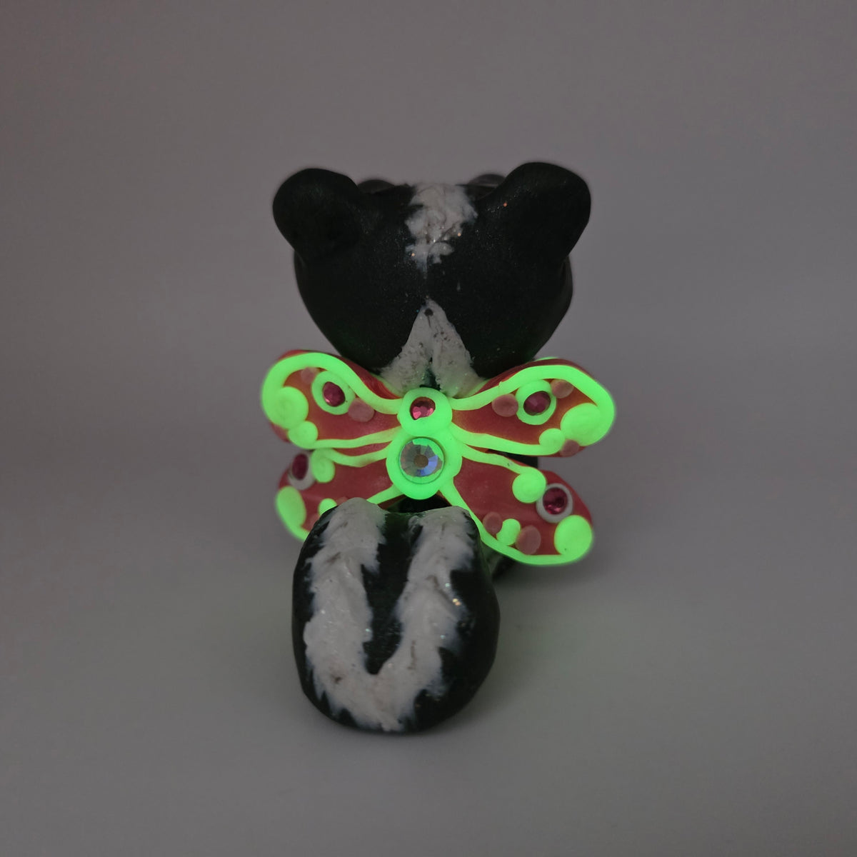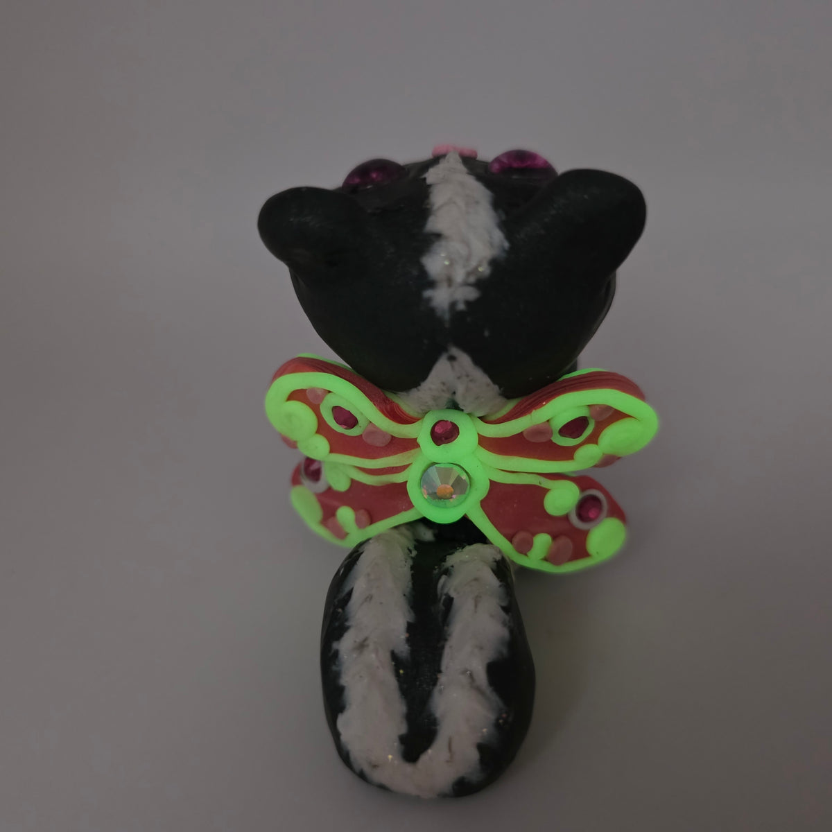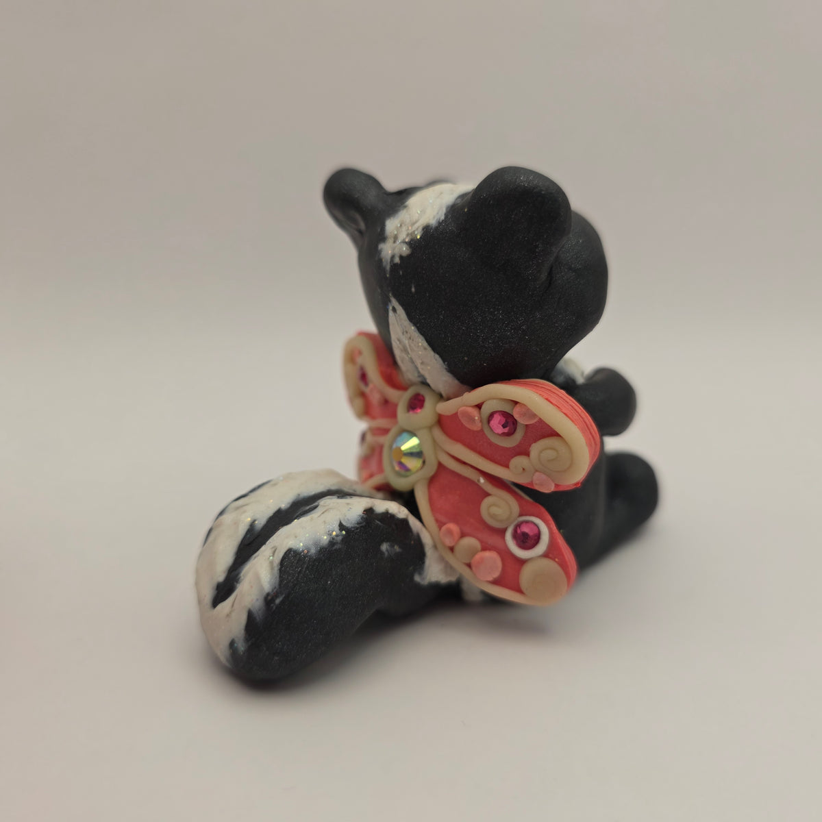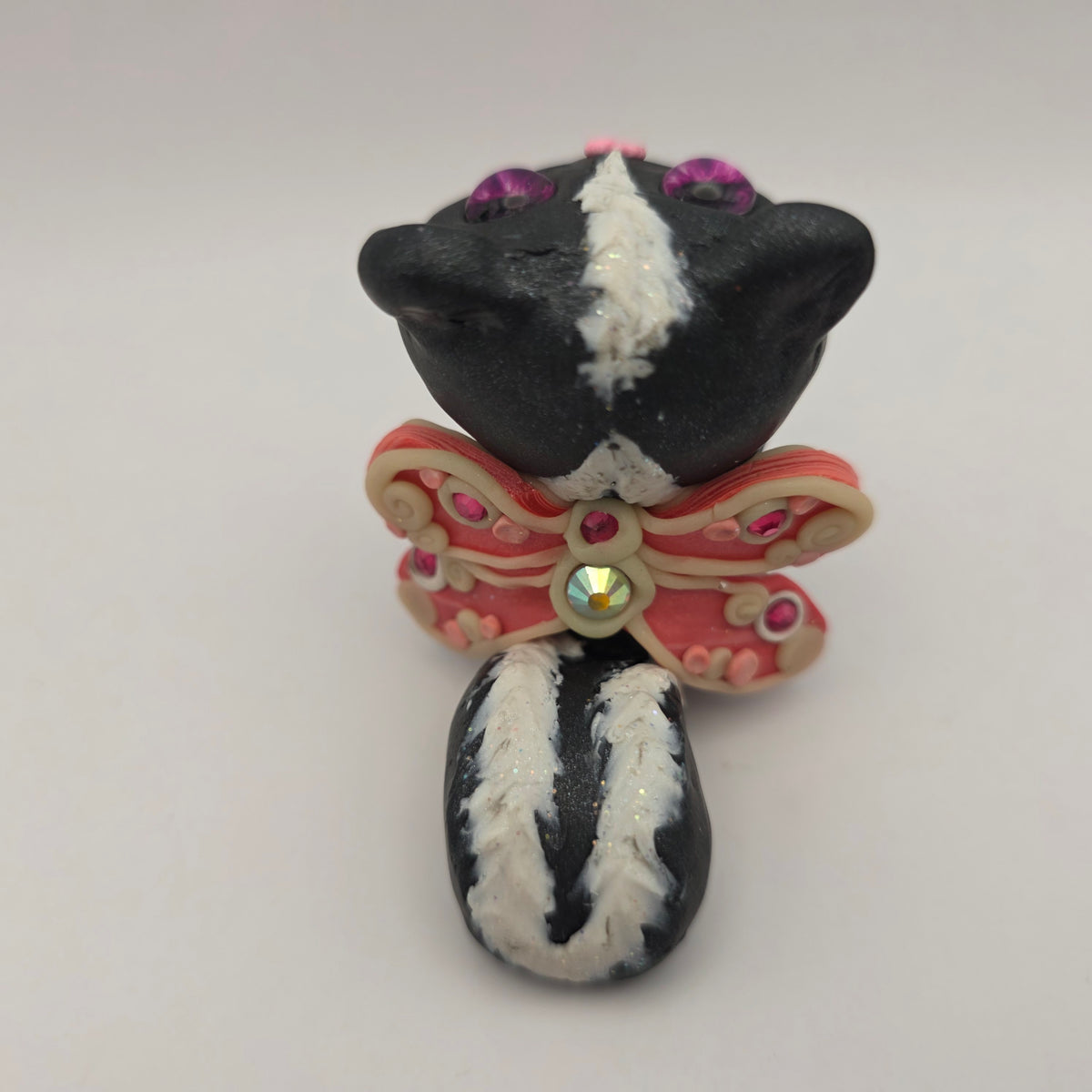Meet Zinnia the skunk fairy! This little fairy has pink eyes and glowing wigns decorated with rhinestones and pink swirls.