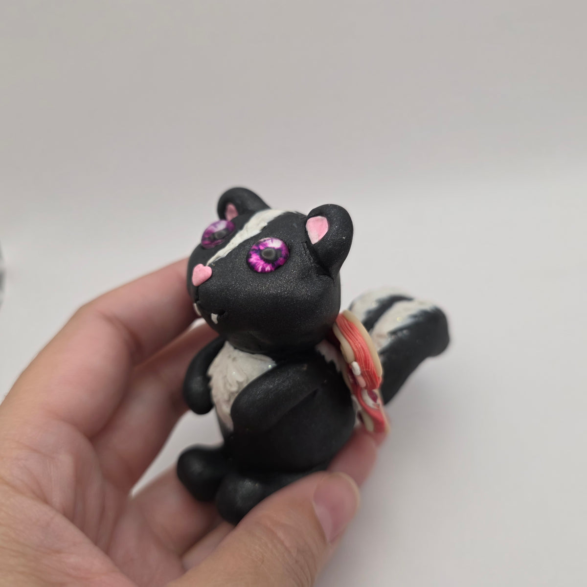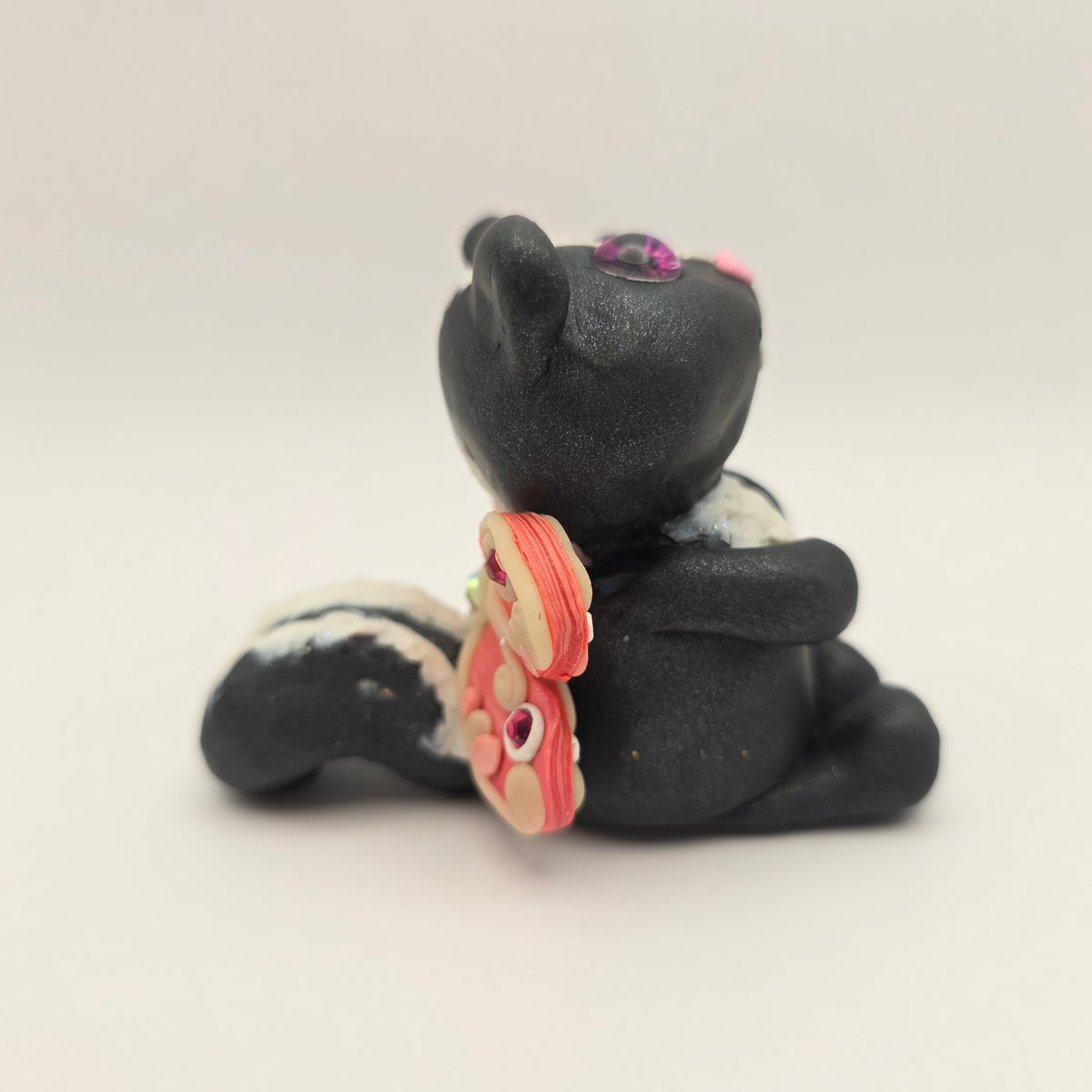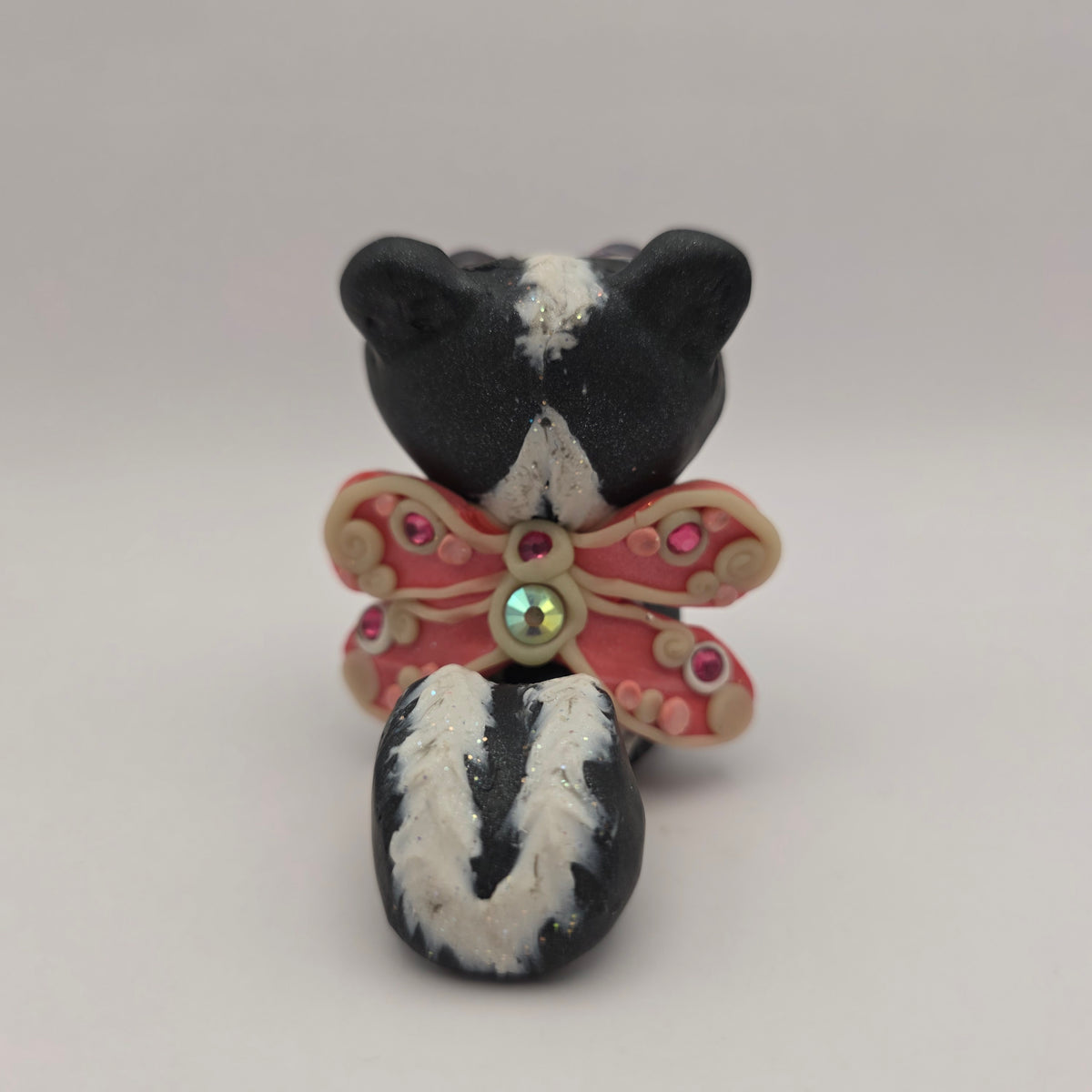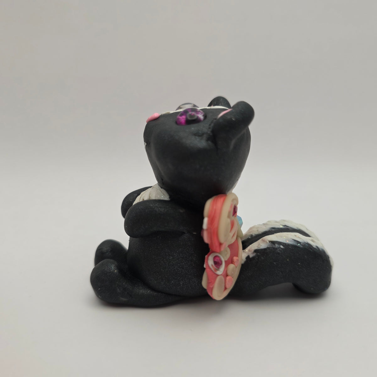 Meet Zinnia the skunk fairy! This little fairy has pink eyes and glowing wigns decorated with rhinestones and pink swirls.