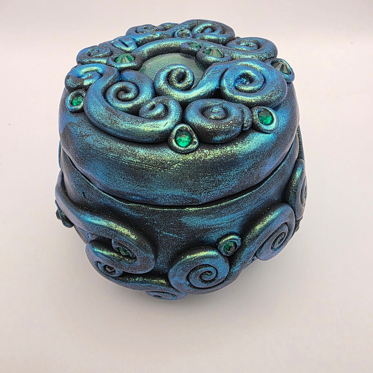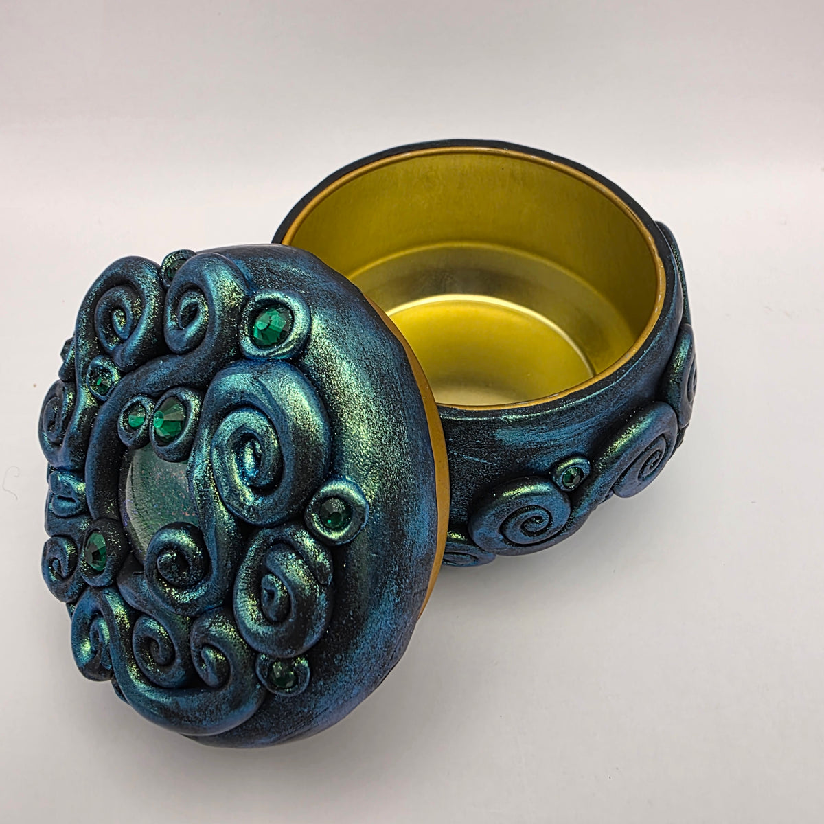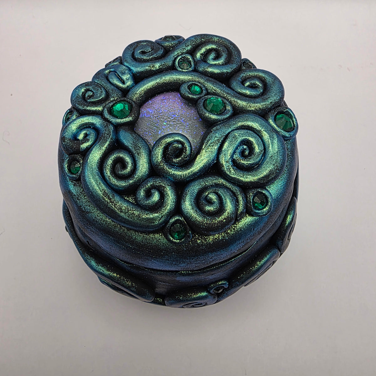 This polymer clay trinket box features a painted glass cabochon that changes from a vibrant green to a purple, with specks of glitter. It is surrounded by swirls and green rhinestones, and brushed with chameleon powder to add extra magic.