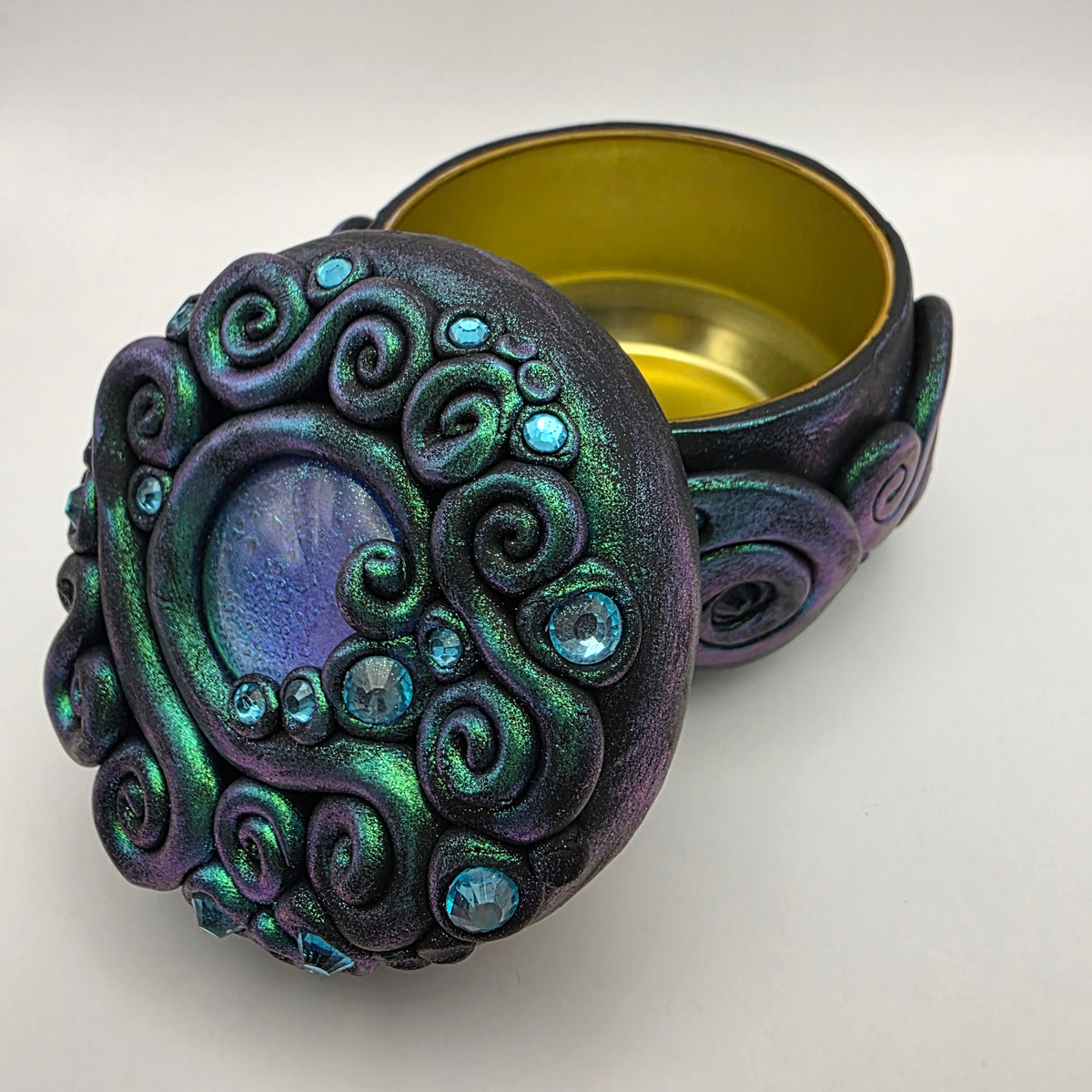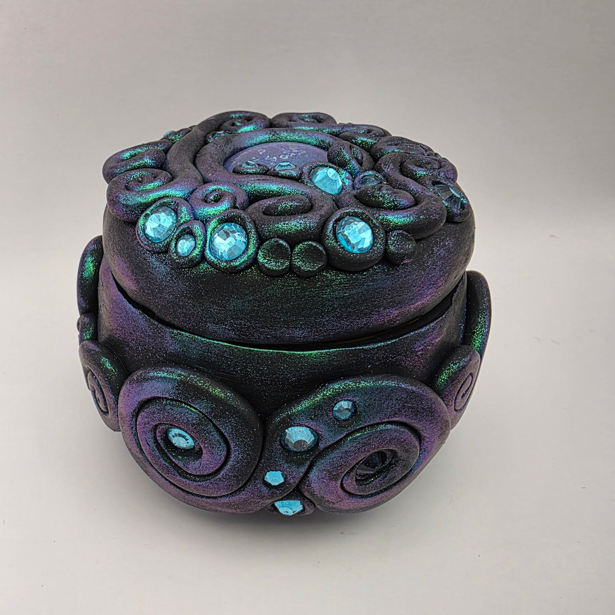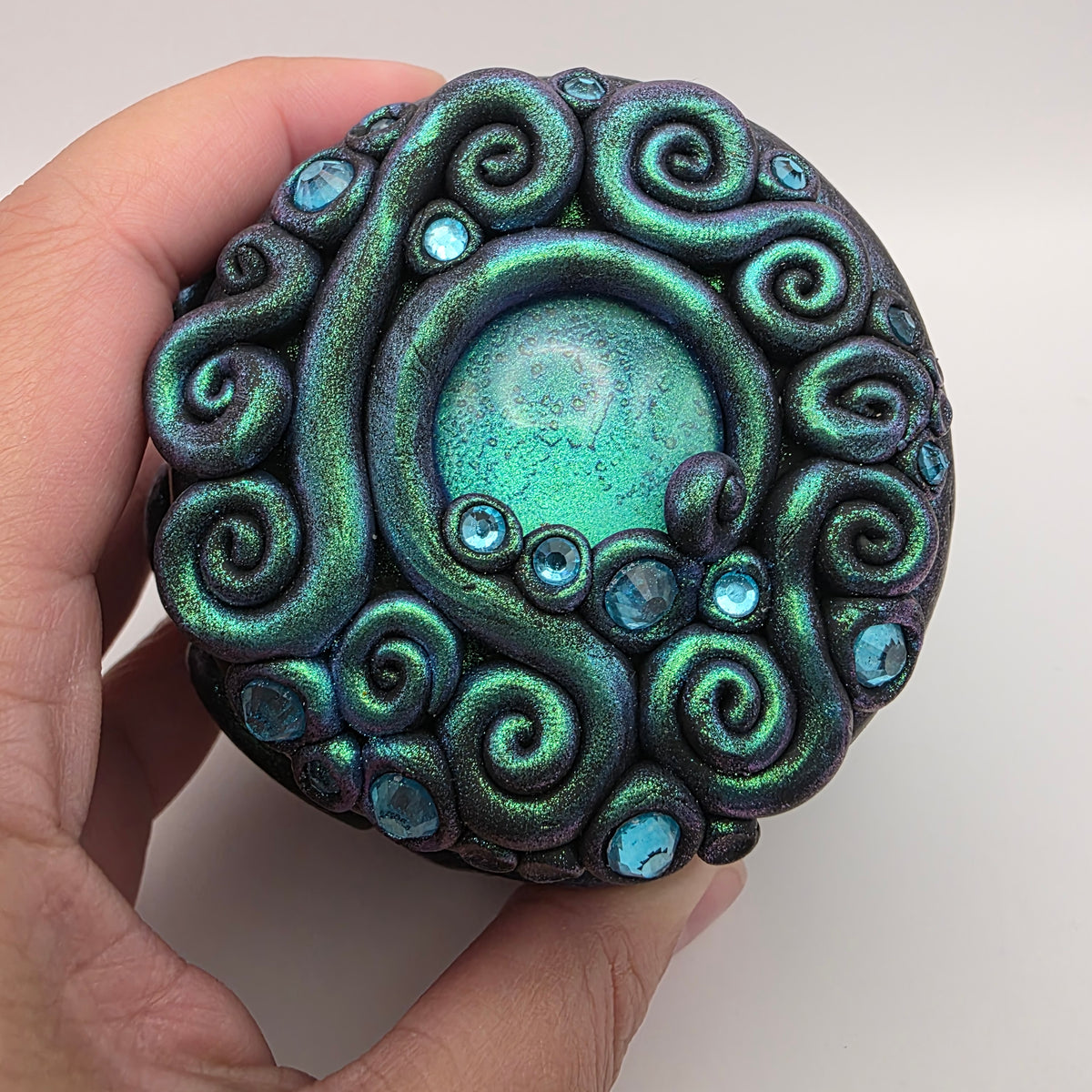 This polymer clay trinket box features a painted glass cabochon that shifts from a green to turquoise to purple, surrounded by clay swirls and accented with turquoise rhinestones. It is painted with chameleon powder that shifts from green to purple, giving it an even more magical effect in certain lights.