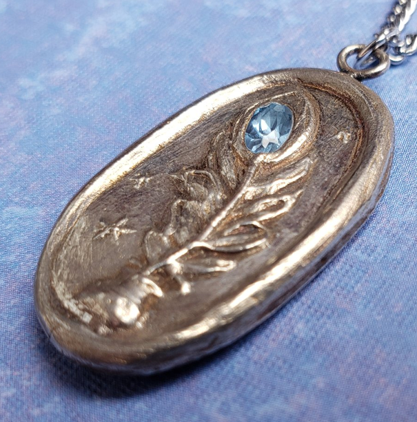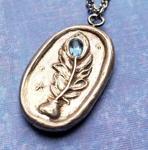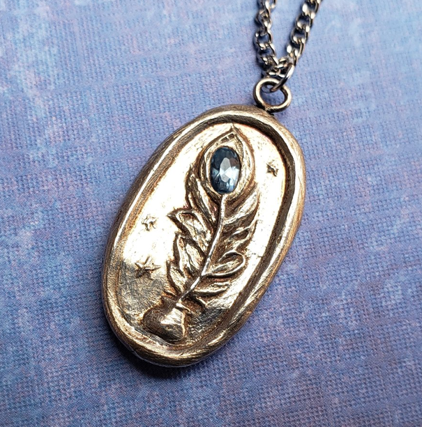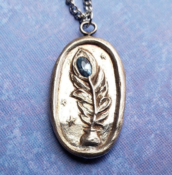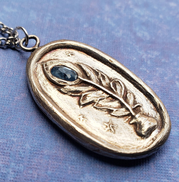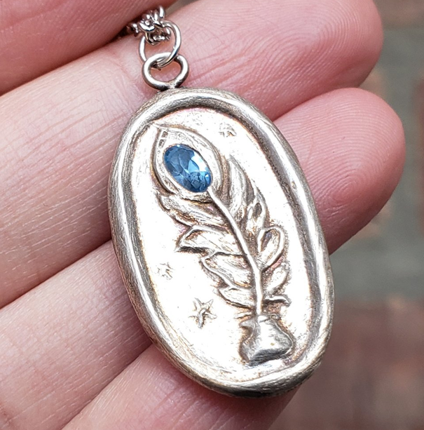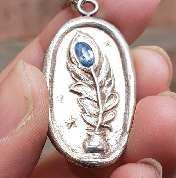 Since each pendant is stamped by hand, no two will ever be entirely identical. They are then fired, polished, and antiqued by hand.