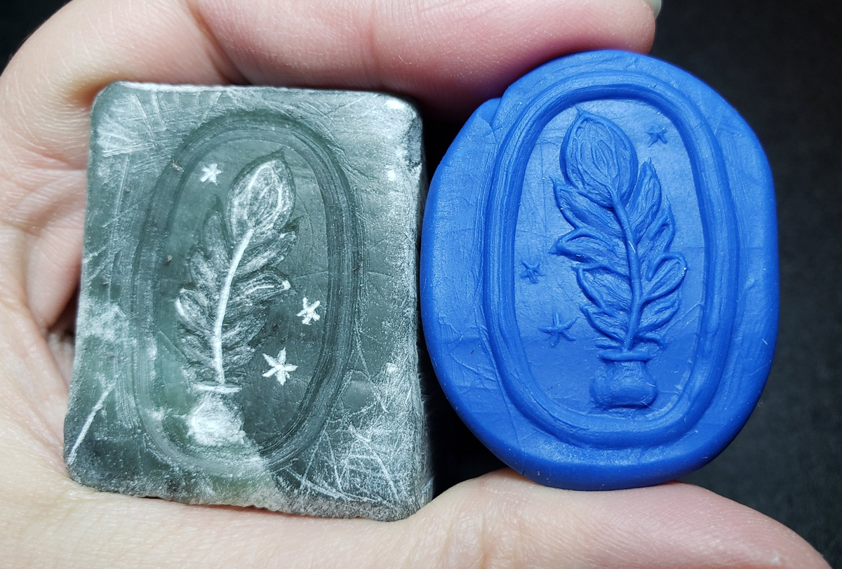 From there, I carve the design into stone, creating my own stone stamps and testing them with clay throughout the carving process. These stone stamps are then used to make the pendants.