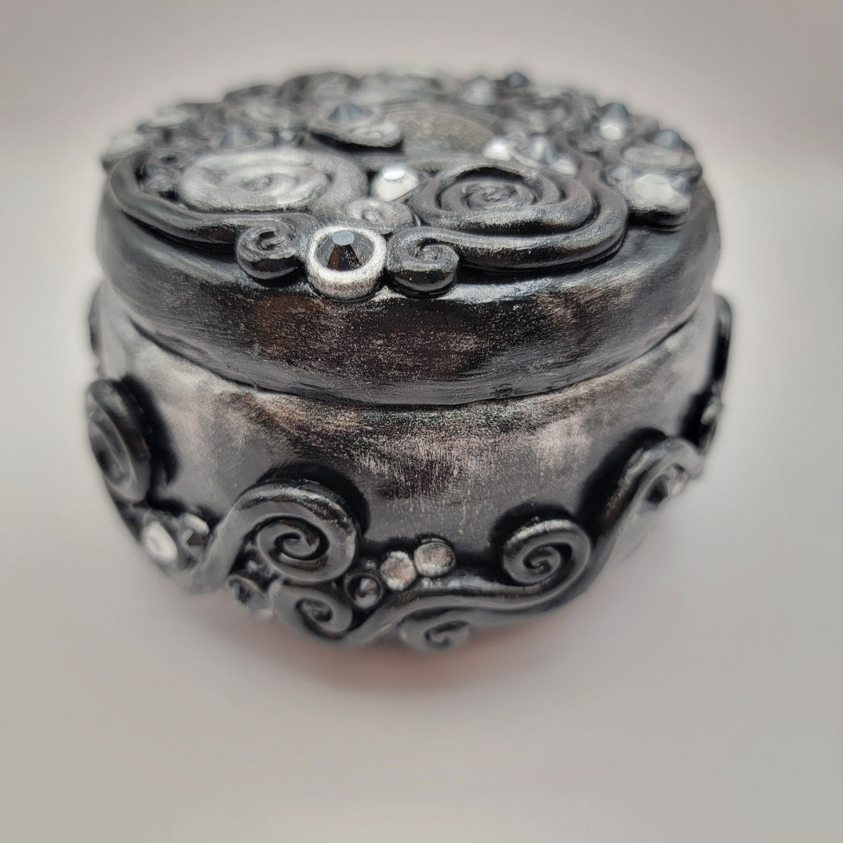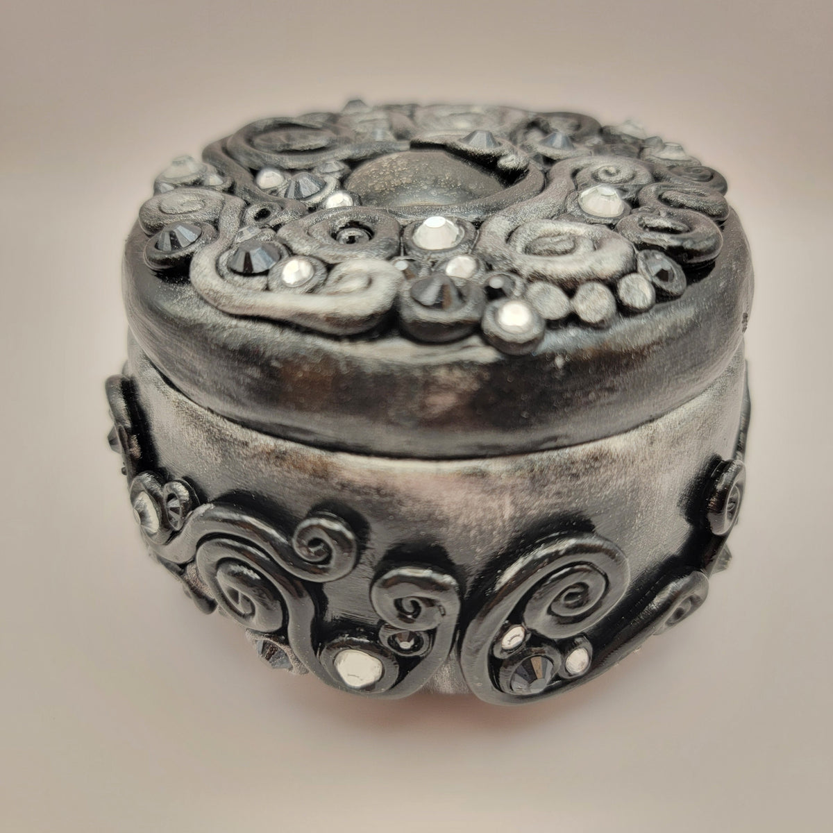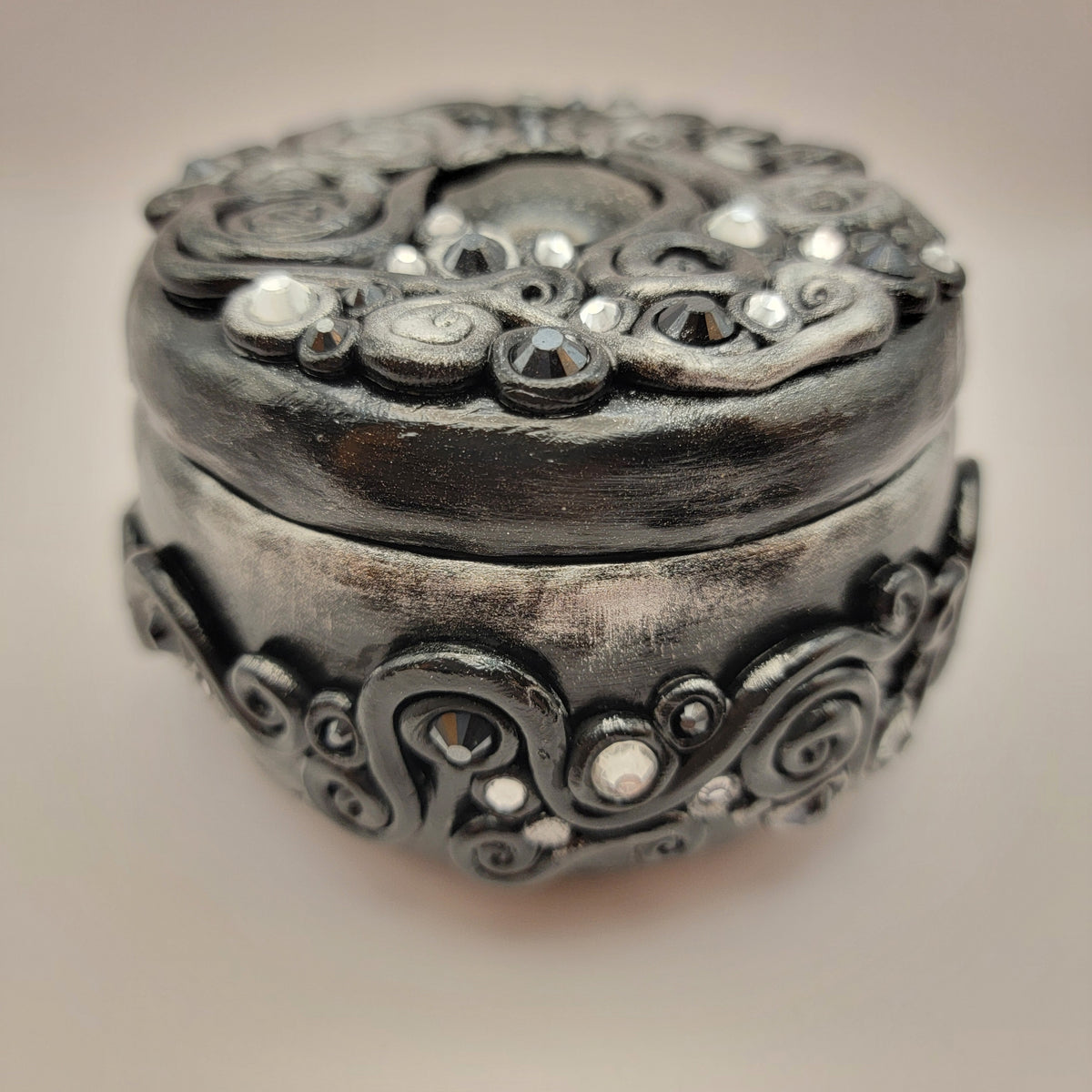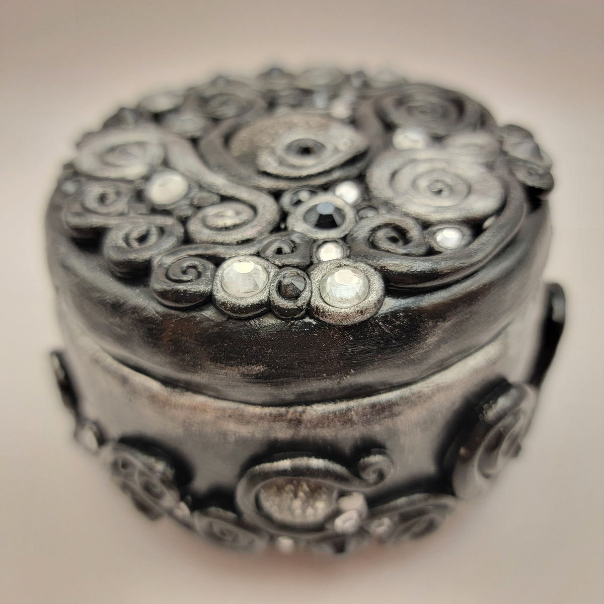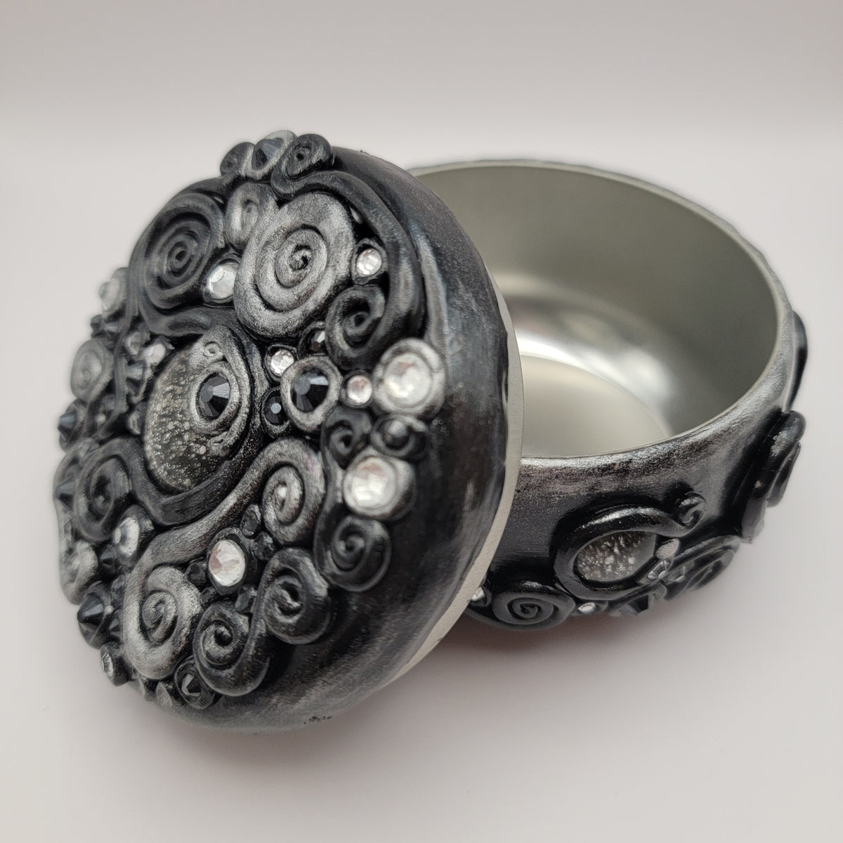 A one of a kind silver and black trinket box, sparkling with rhinestones. The center of the lid features a hand painted glass cabochon with chunky silver glitter against a black background, surrounded by swirls. Between the swirls there are rhinestone accents, brushed with a silver holographic powder. In certain lights and angles, the silver will shimmer in a subtle rainbow (see last photo).