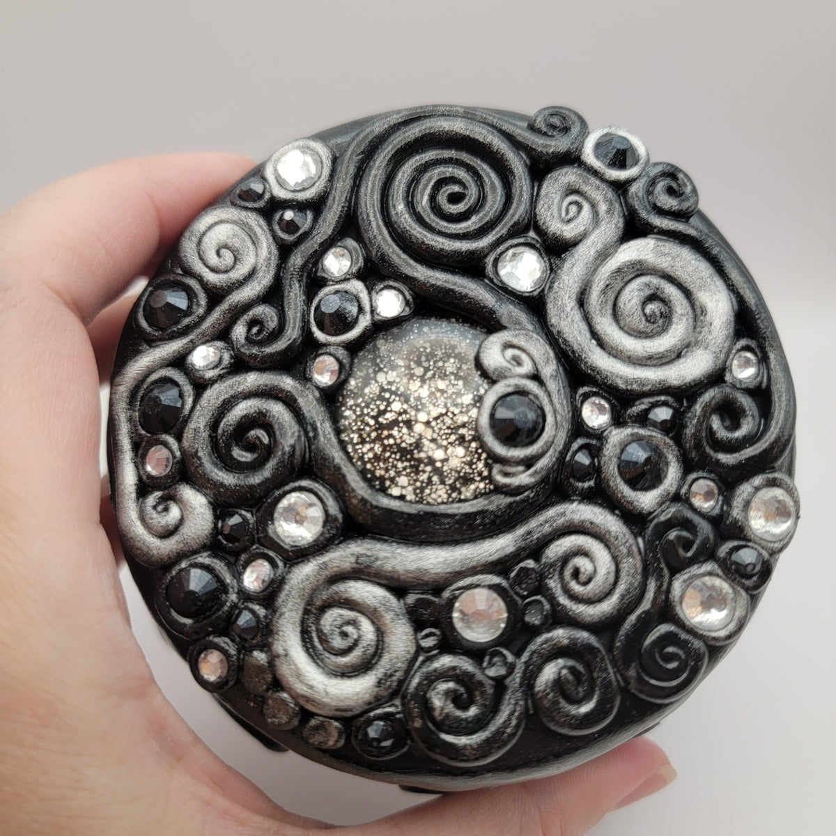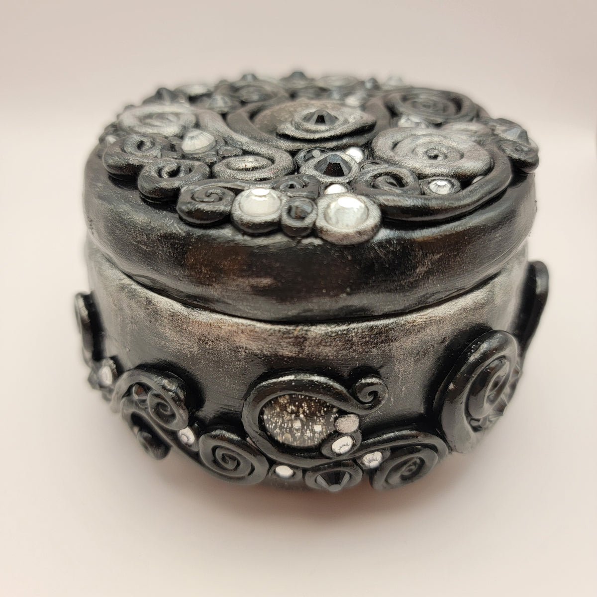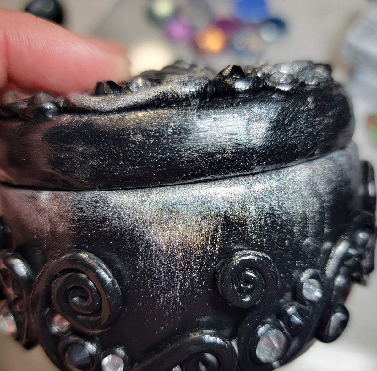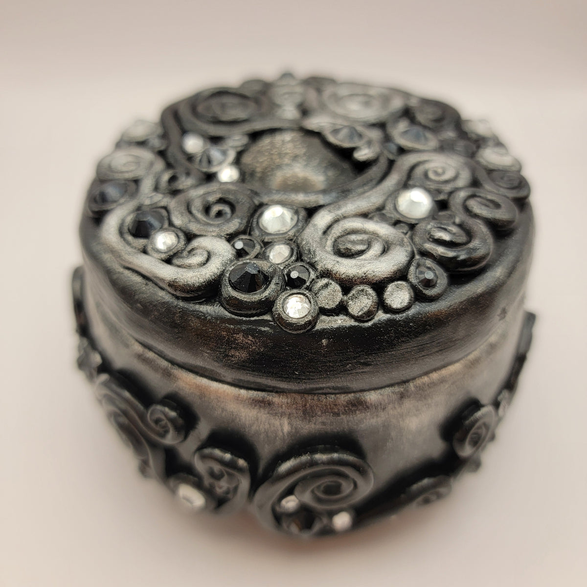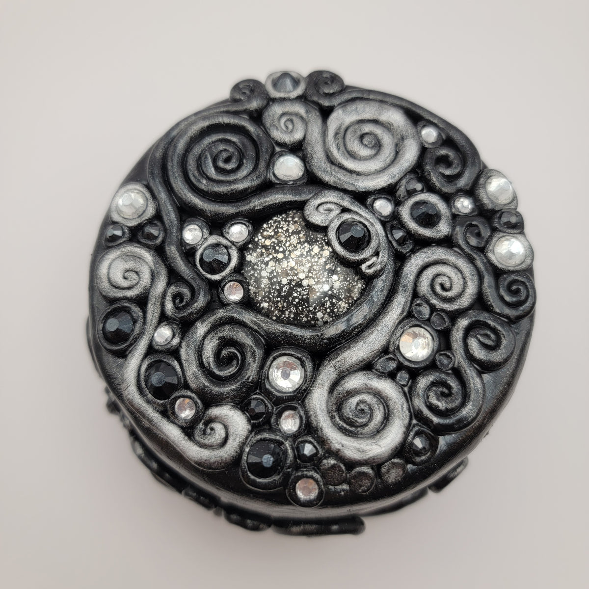 A one of a kind silver and black trinket box, sparkling with rhinestones. The center of the lid features a hand painted glass cabochon with chunky silver glitter against a black background, surrounded by swirls. Between the swirls there are rhinestone accents, brushed with a silver holographic powder. In certain lights and angles, the silver will shimmer in a subtle rainbow (see last photo).