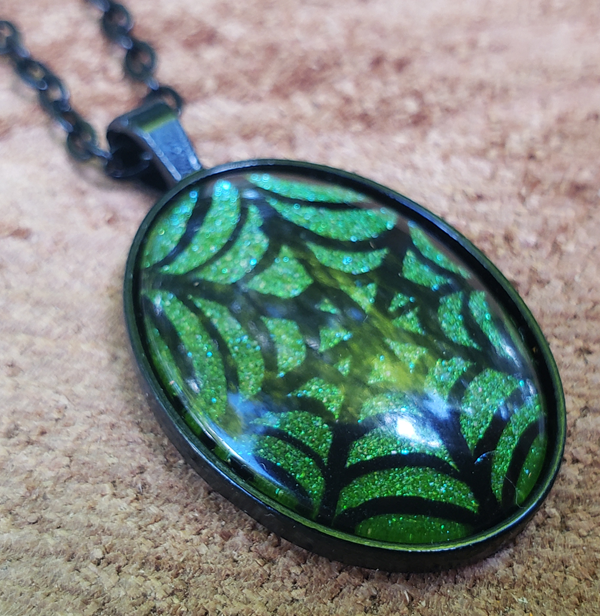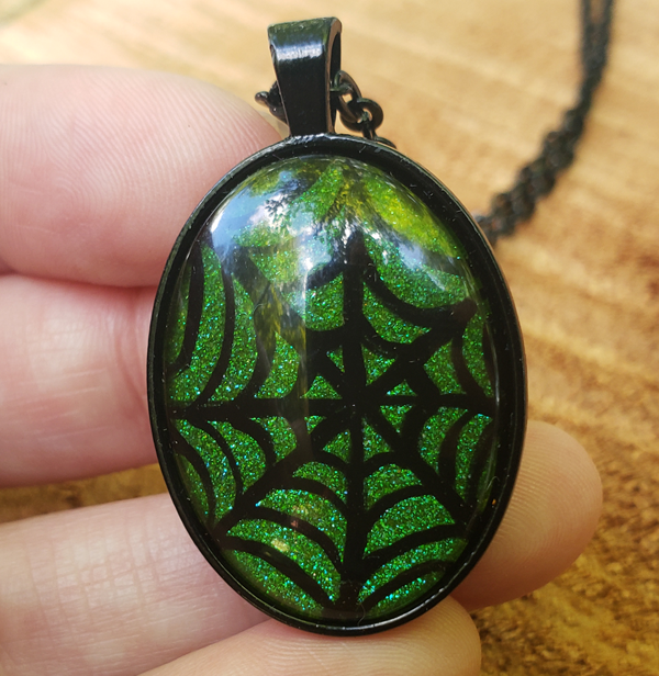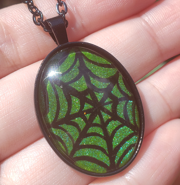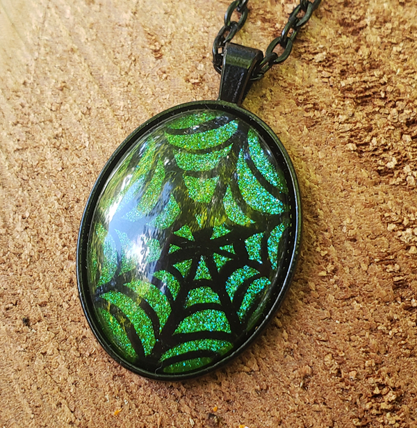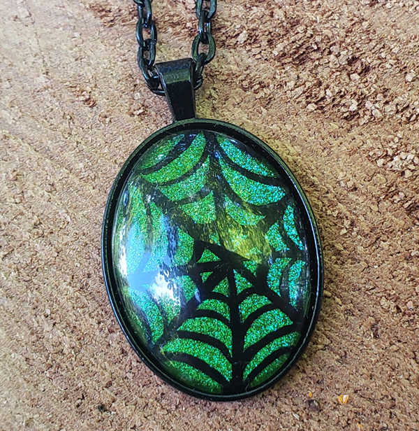 A hand-painted spiderweb on a glass cabochon with a shimmering green background. The perfect accent for your Halloween outfits! Set in black oval shaped bezel tray, and comes on a matching 24 inch chain. Cabochon measures 22x30mm.