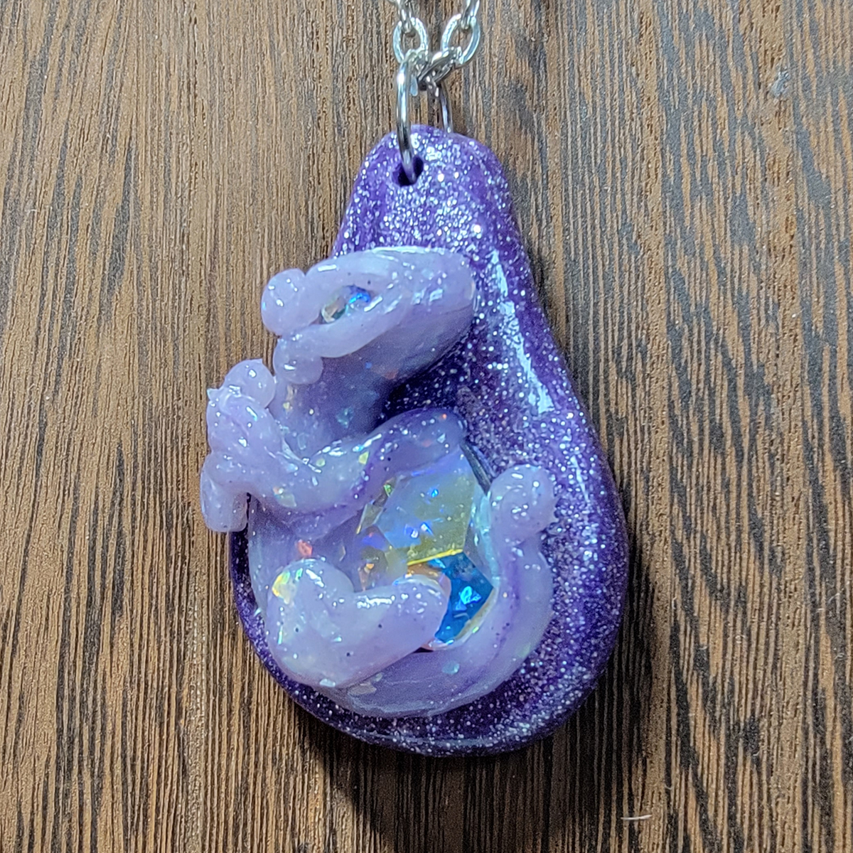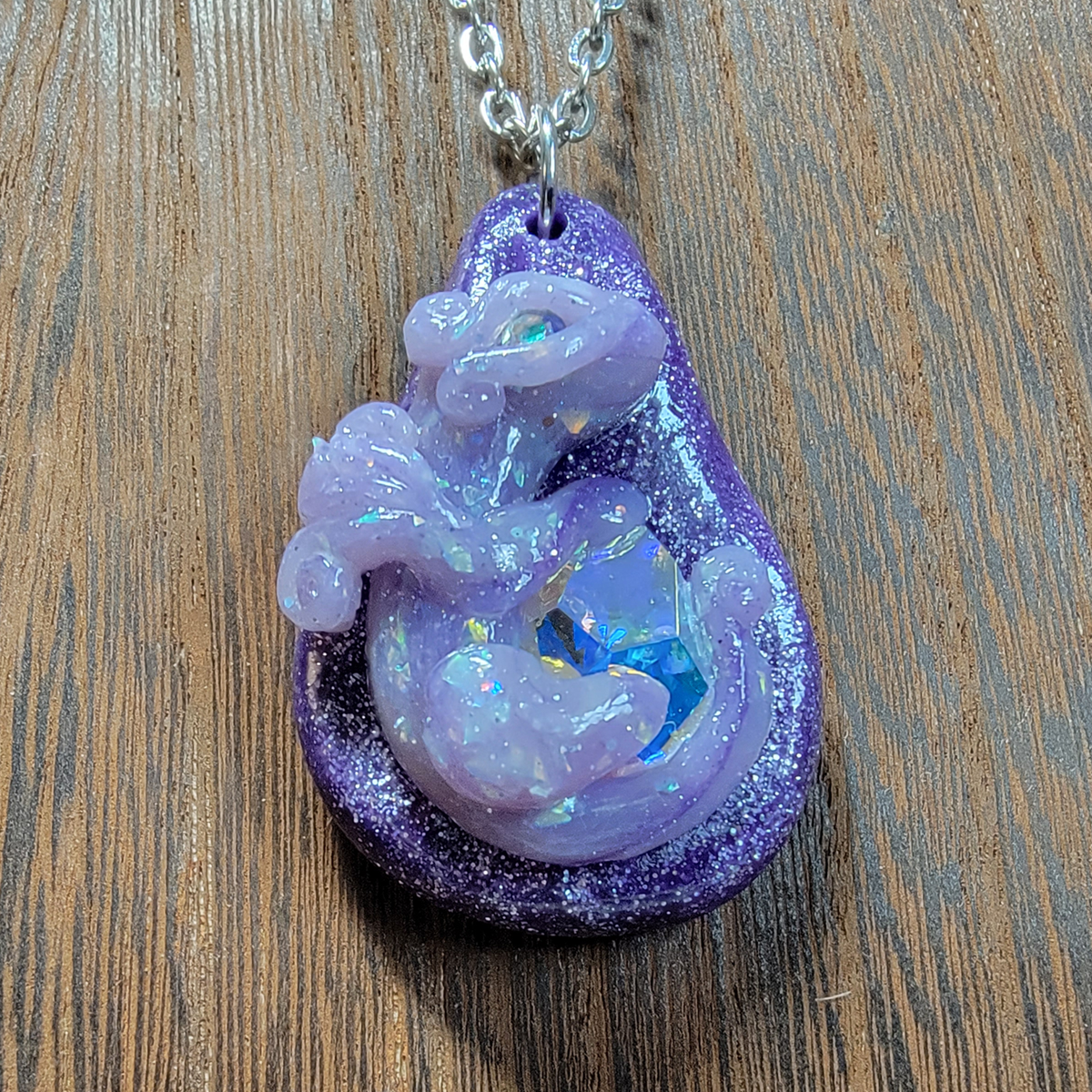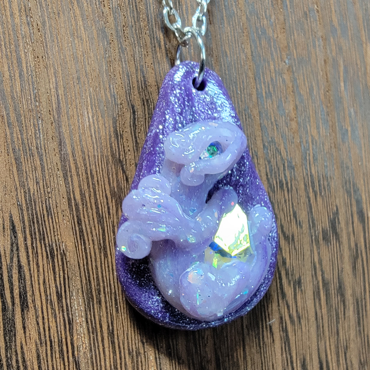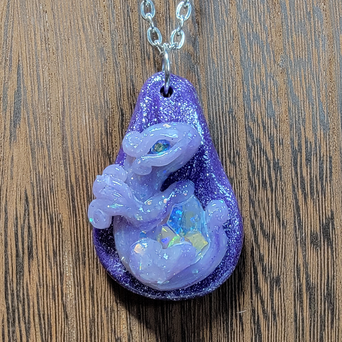 This dragon pendant has ALL THE SPARKLE. The purple dragon is translucent with large glitter flakes, and the darker purple background has silver glitter. If that wasn't enough, it has a Preciosa rhinestone eye and a crystal with incredible sparkle. The pendant has been sealed with a glaze for extra shine and protection.