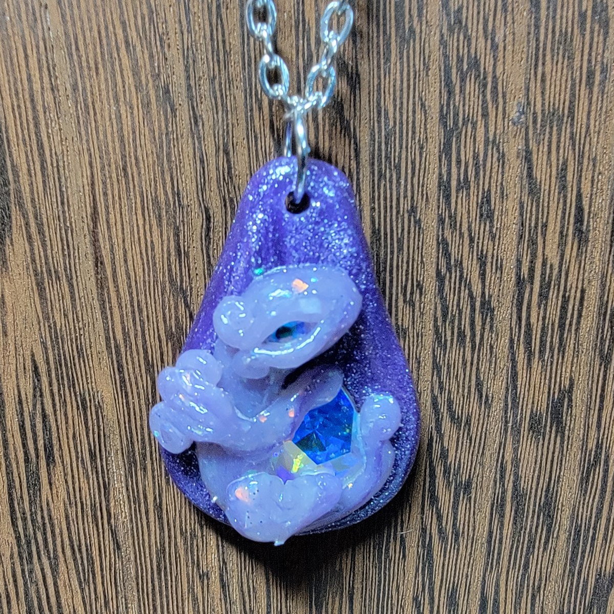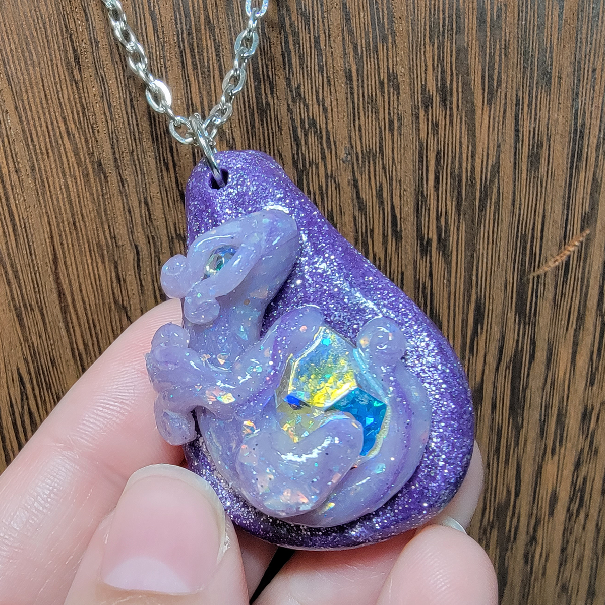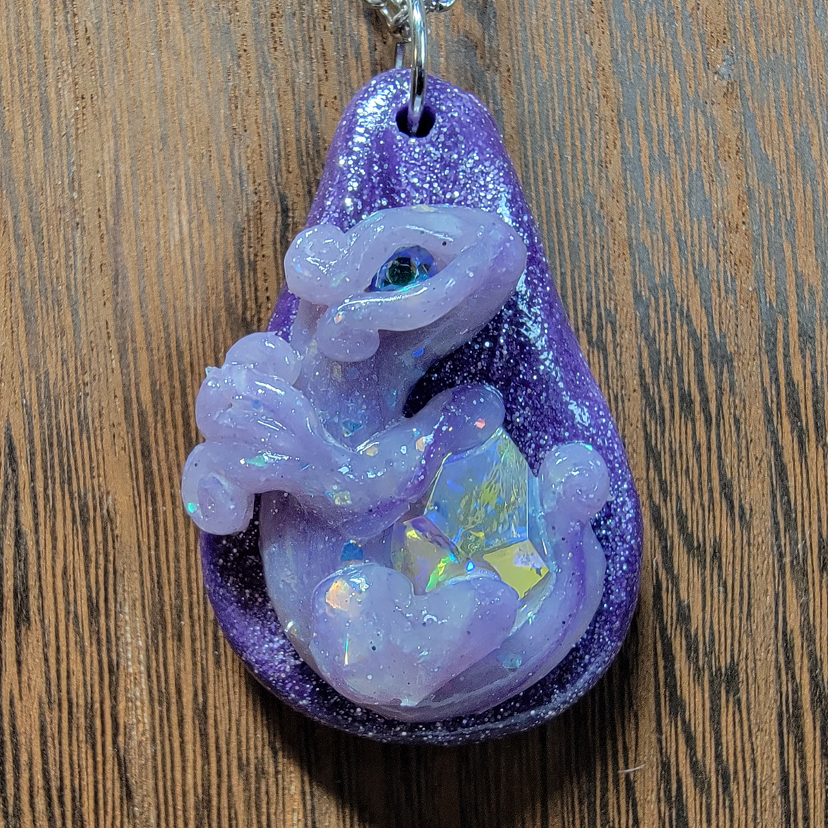 A polymer clay dragon pendant wrapped up around it's treasure. This little dragon has snagged one of the largest pieces of treasure, an Aurora Borealis Swarovski crystal.