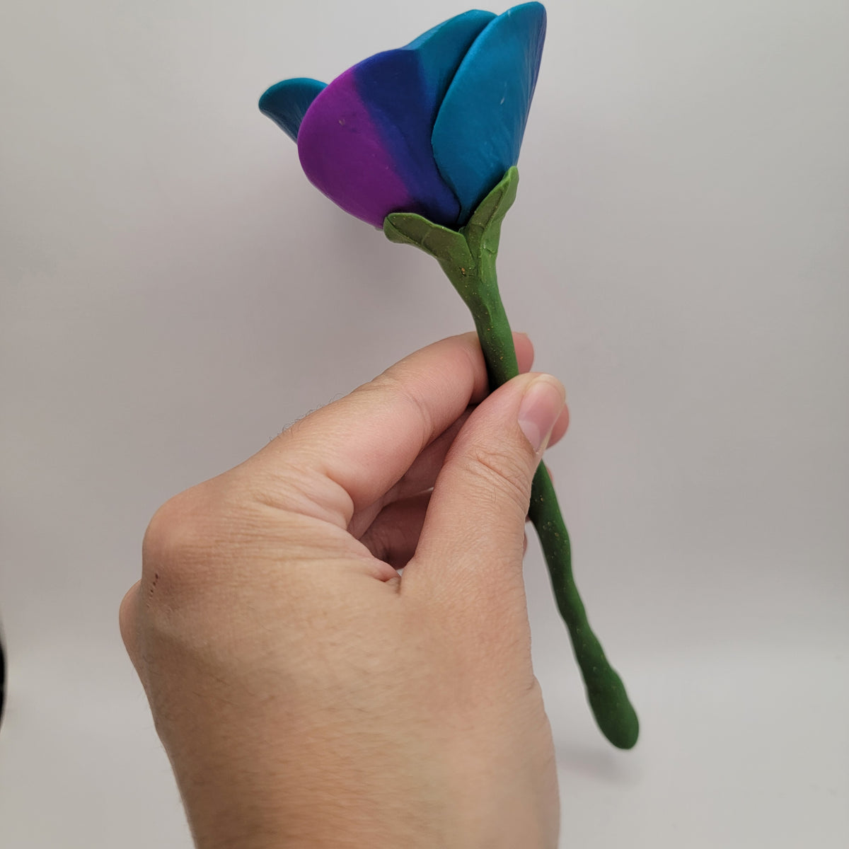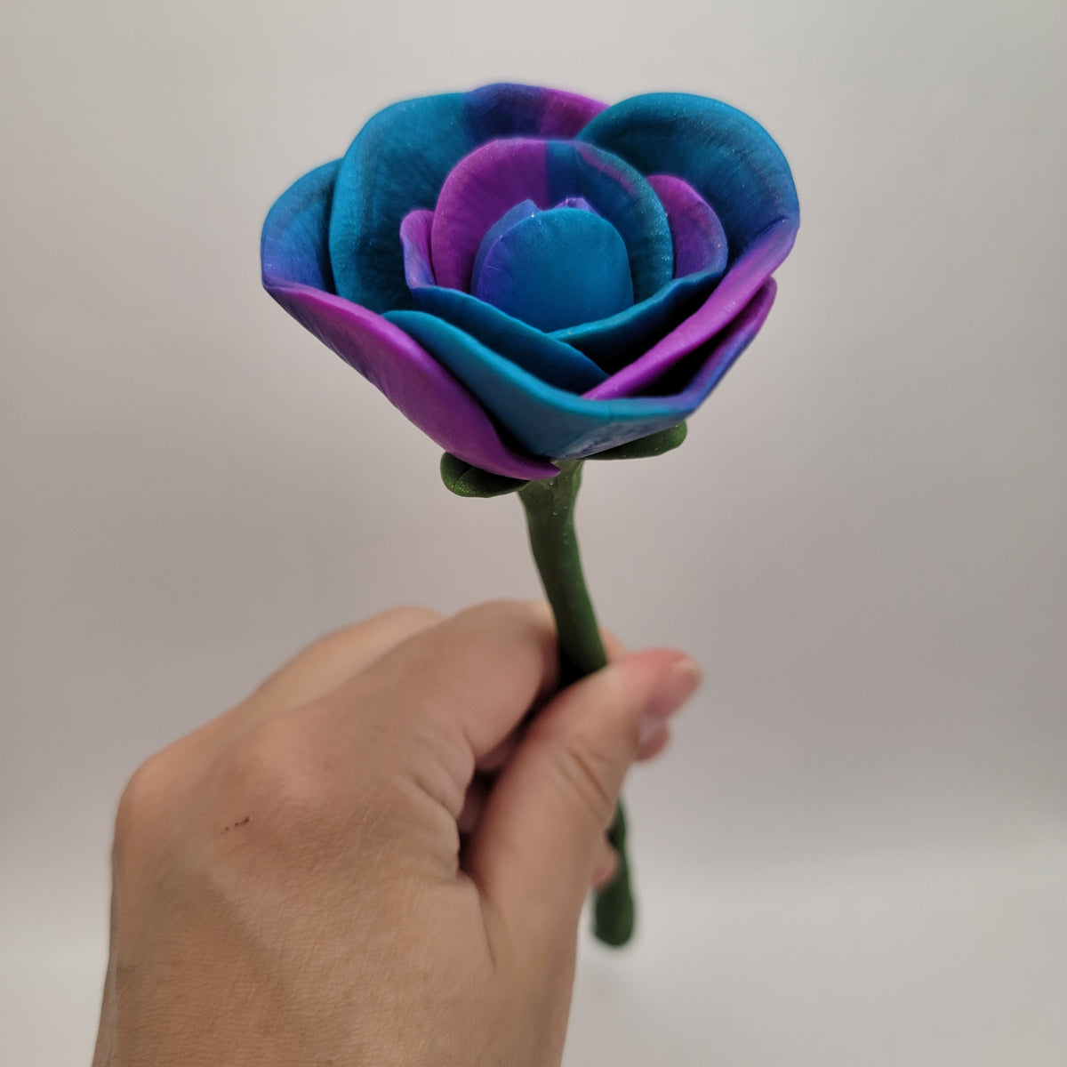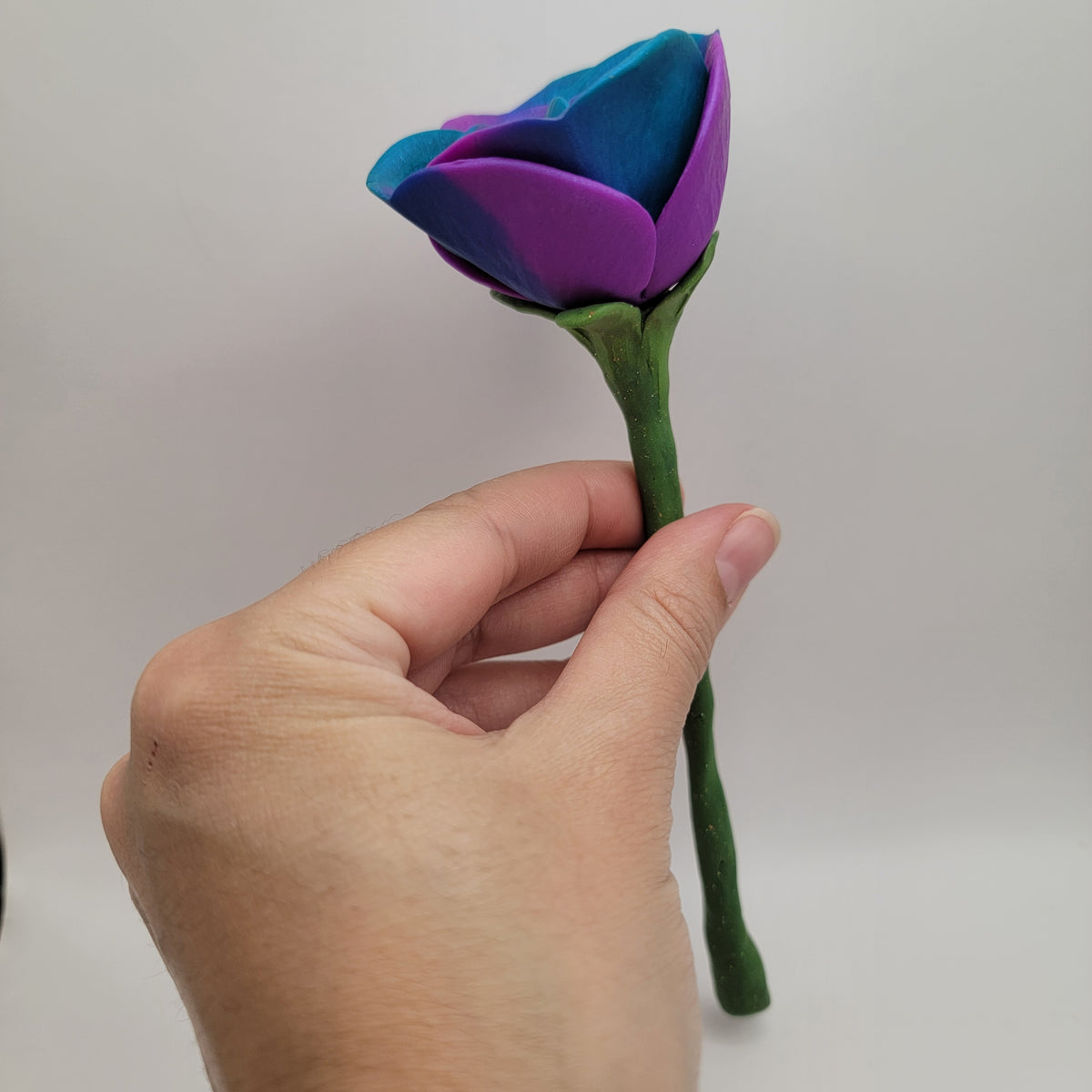 A delightful polymer clay rose made with teal and purple clays, mixed in each petal to create a unique bloom.