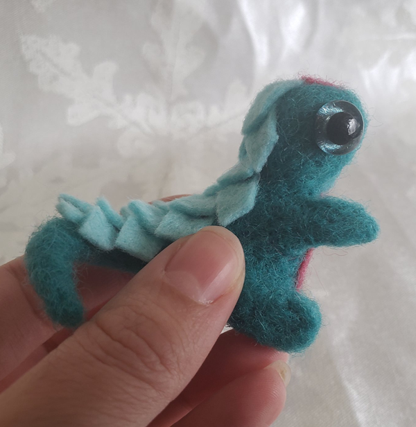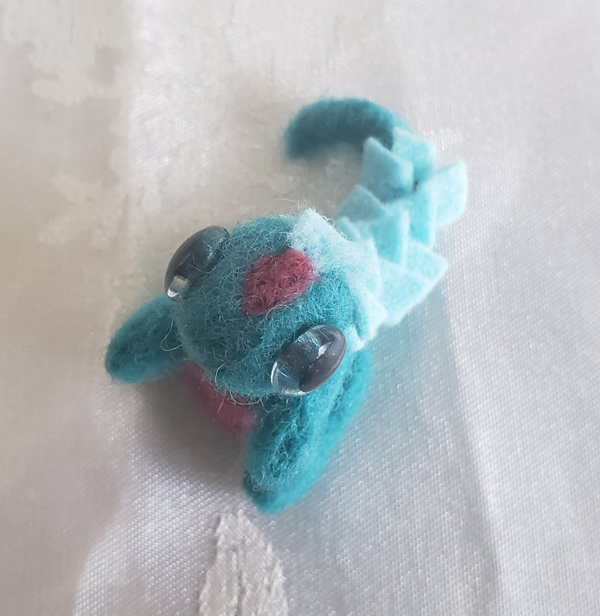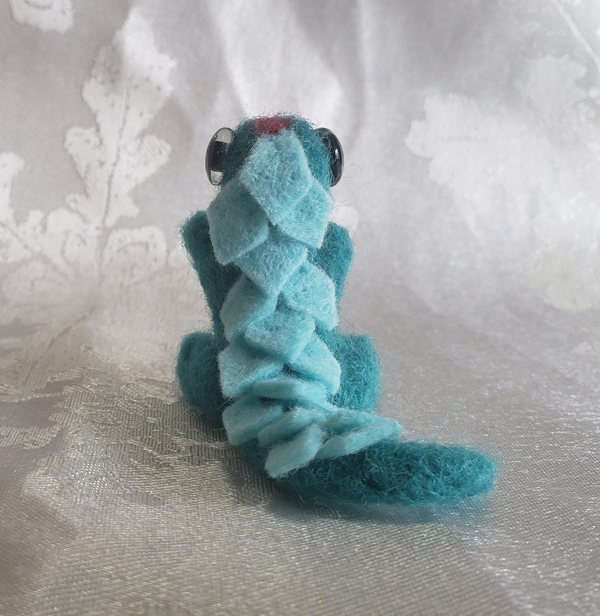 A little scaly-backed dragon with shiny eyes. This little needle felted sculpture is a gorgeous turquoise with light blue scales and a bright pink belly and head spot. This little dragon is just about 1.75 inches tall.