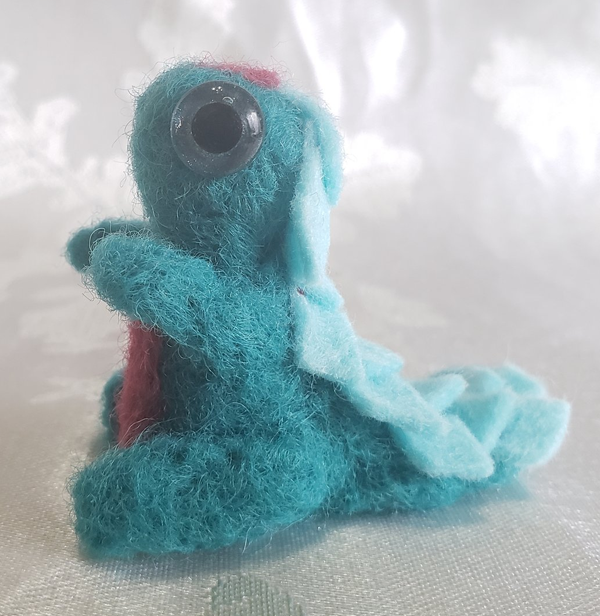 It will stand on its own on a level surface, and generally be adorable. To see more needle felted dragons (and other creatures), visit the needle felted sculptures page.