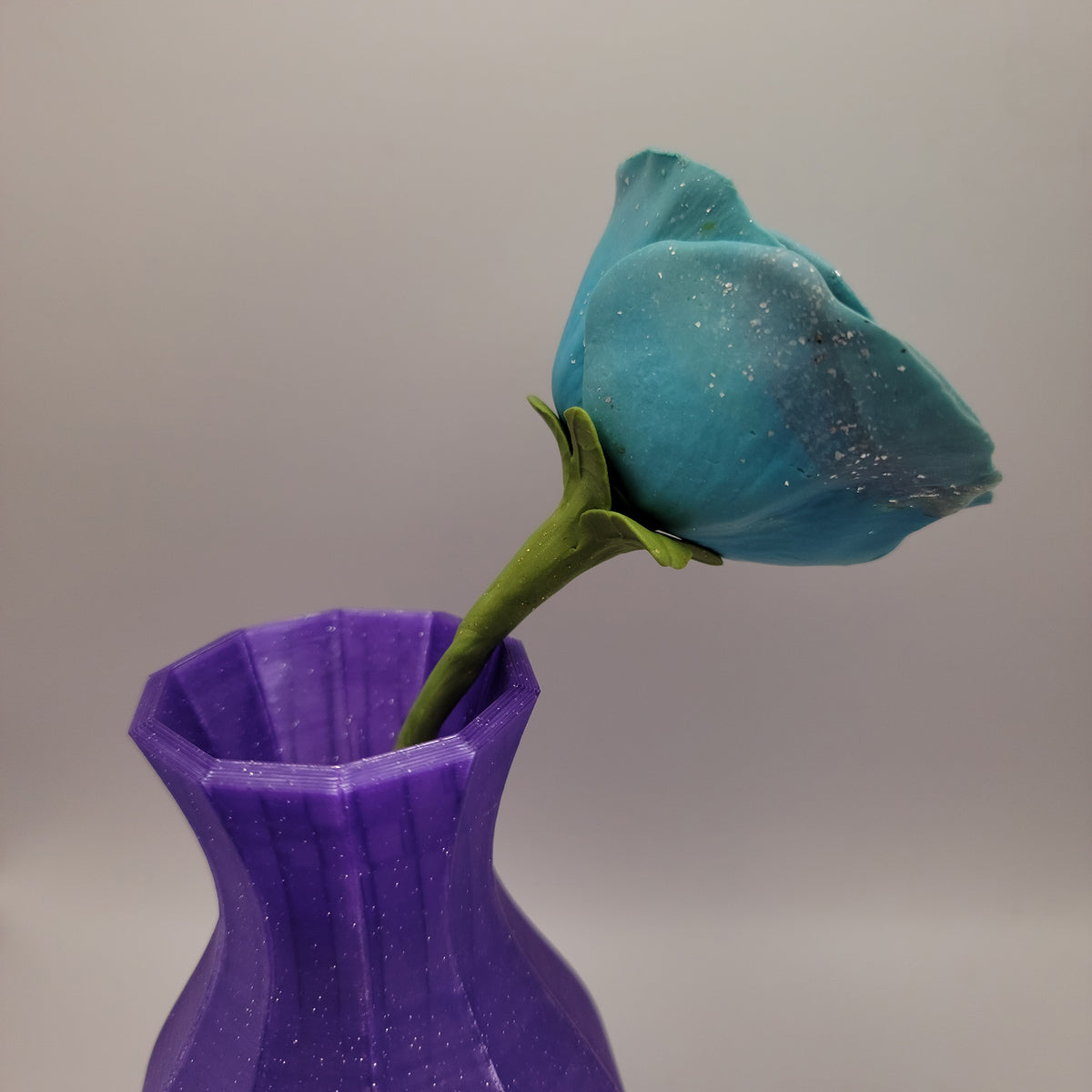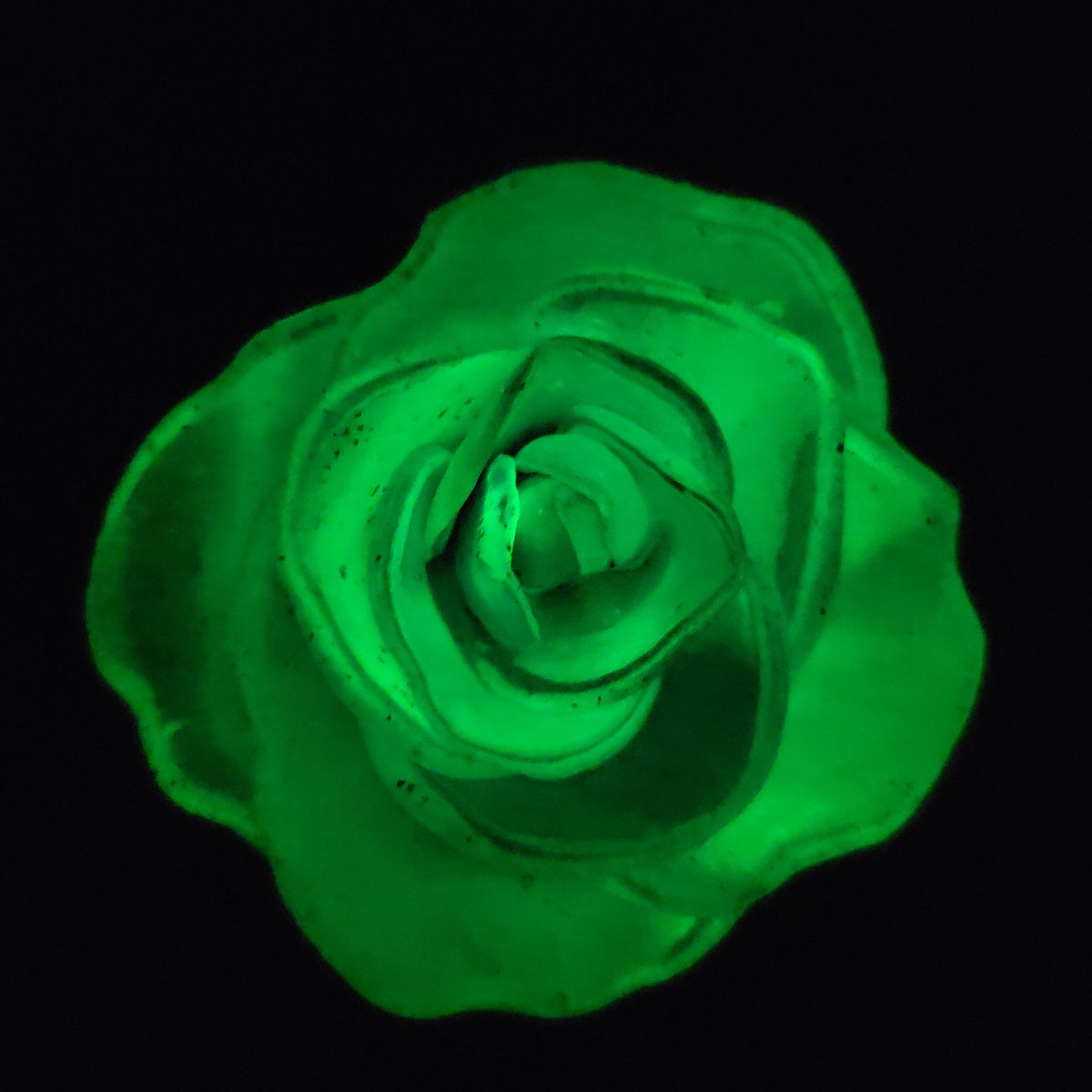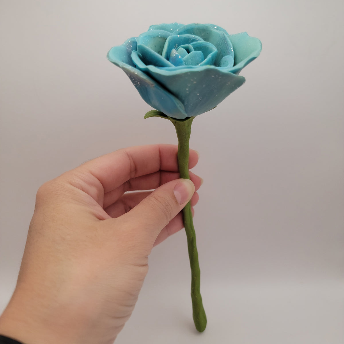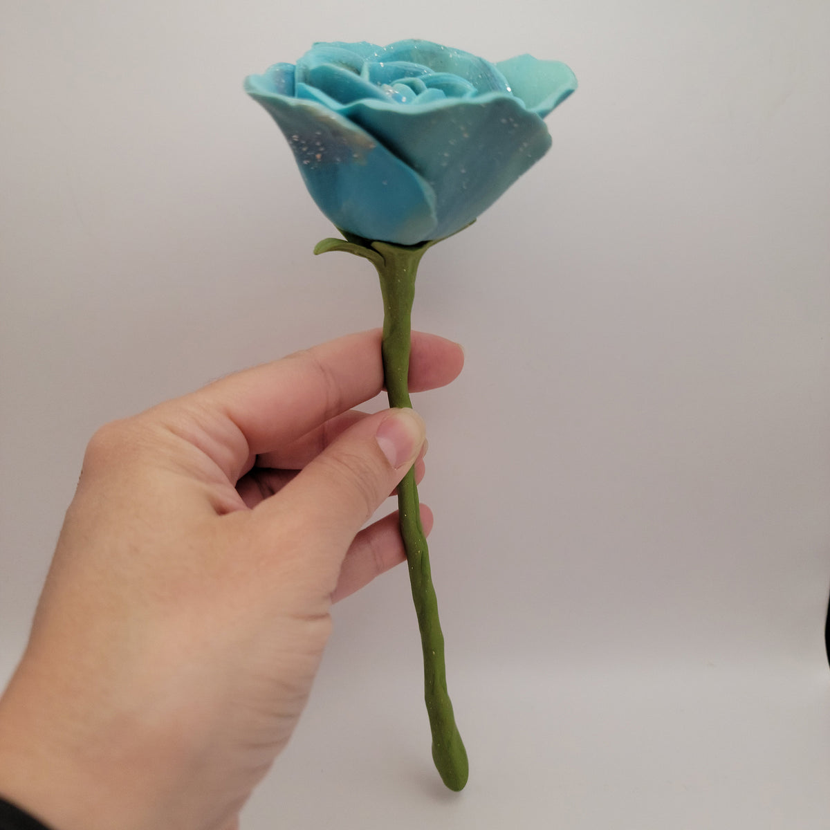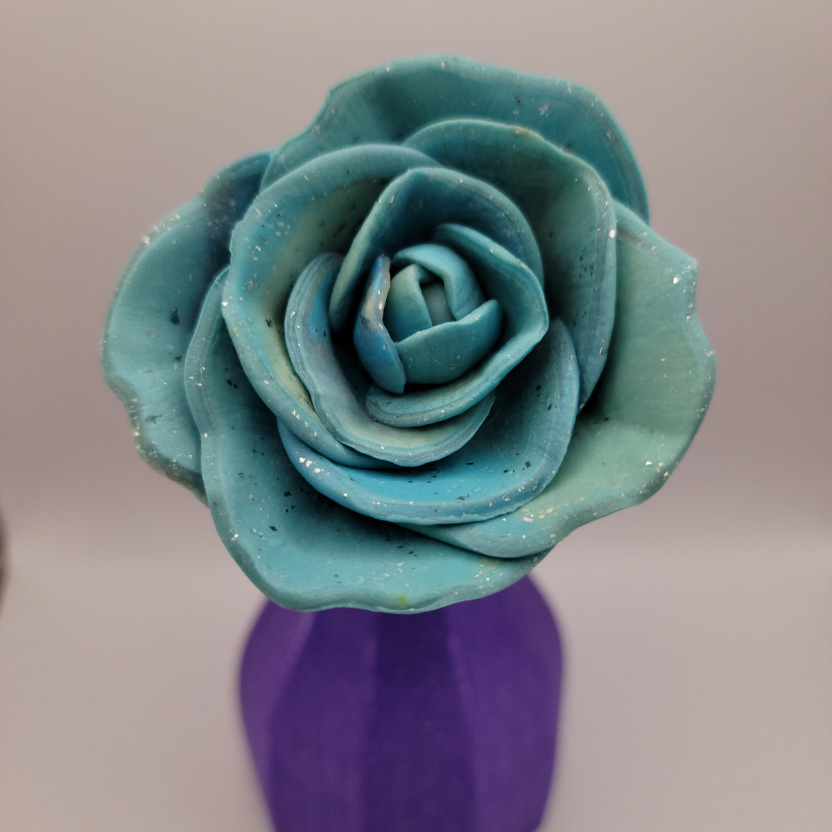 A unique polymer clay rose made of a mix of turquoise clay with silver foil spread throughout. This rose has a bit of extra magic, as it glows in the dark.