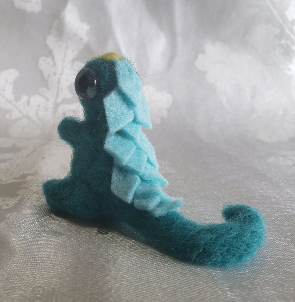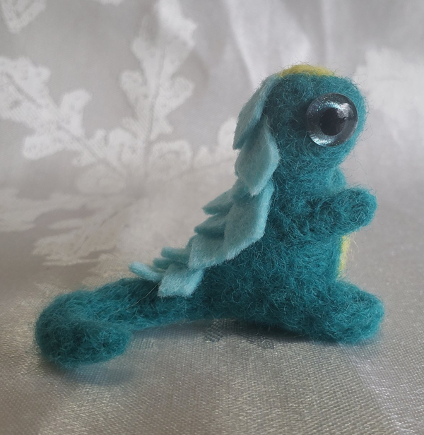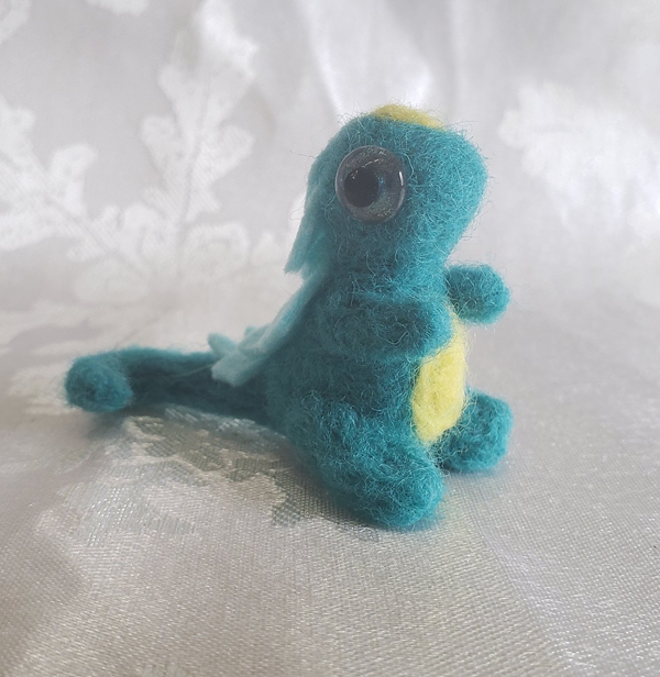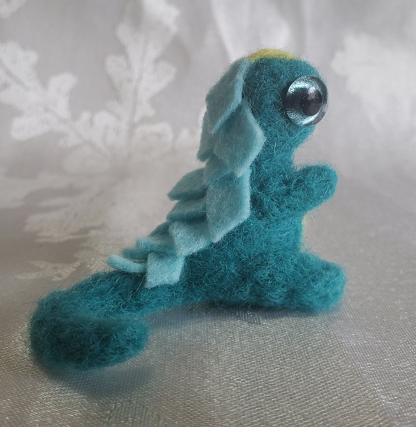 It will stand on its own on a level surface, and generally be adorable. To see more needle felted dragons (and other creatures), visit the needle felted sculptures page.