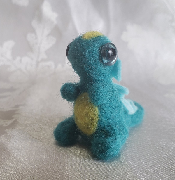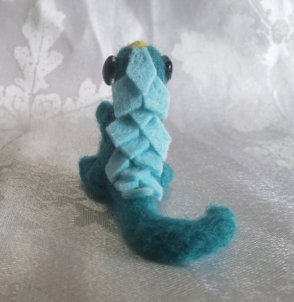A little scaly-backed dragon with shiny eyes. This little needle felted sculpture is a gorgeous turquoise with light blue scales and a yellow belly and head spot. This little dragon is just about 1.75 inches tall.