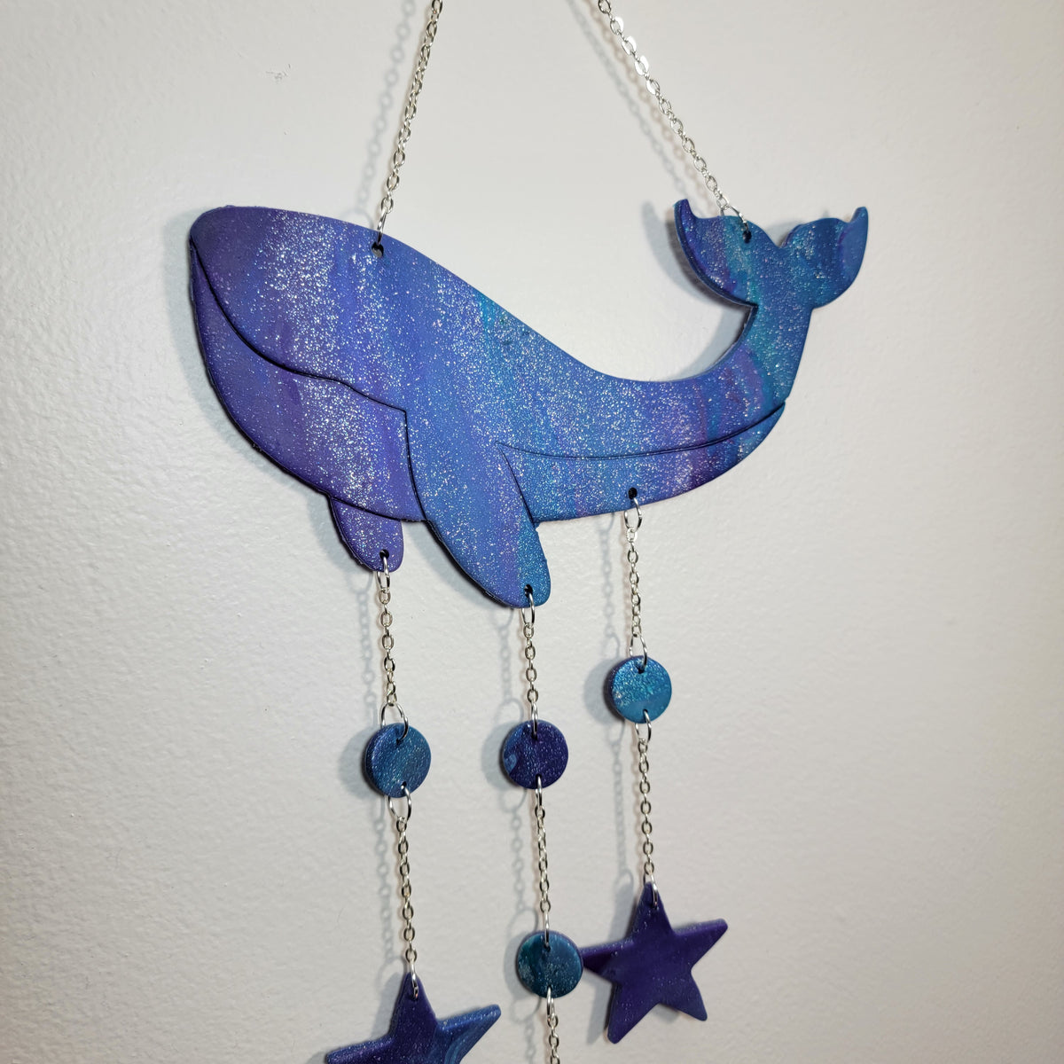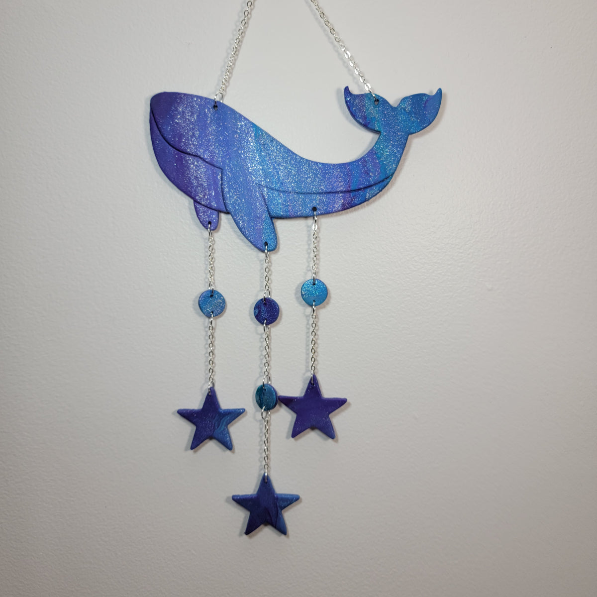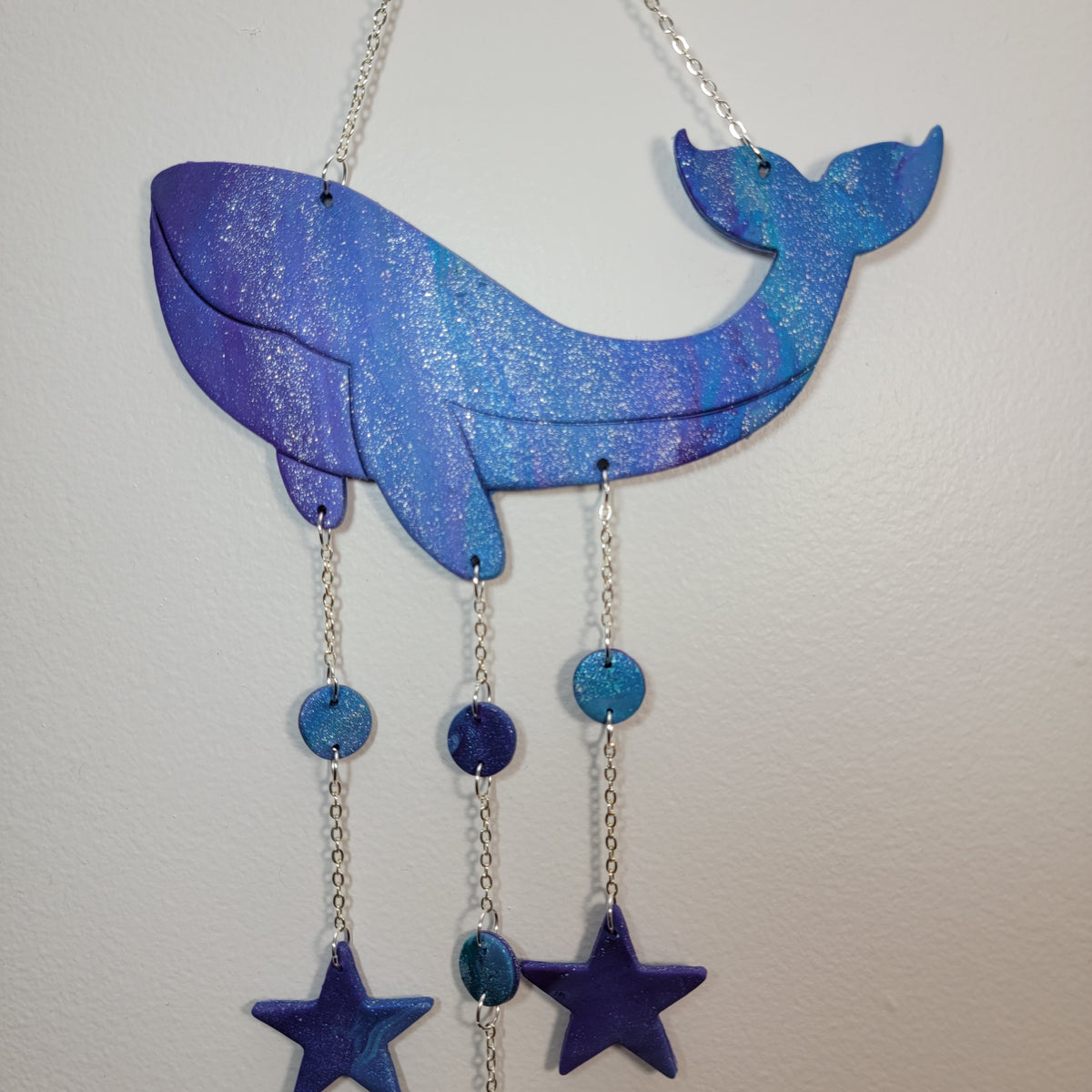 A magical whale wall hanging, trailing circles and stars. The whale is made from a beautiful mix of turquoise and purple polymer clay, with silver and silver foil mixed in.