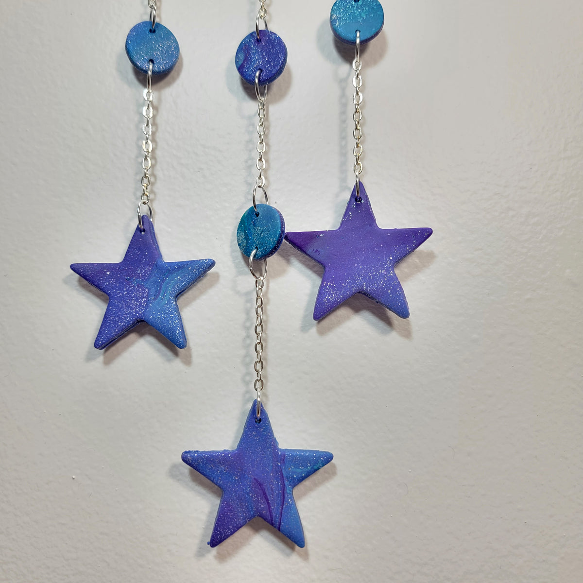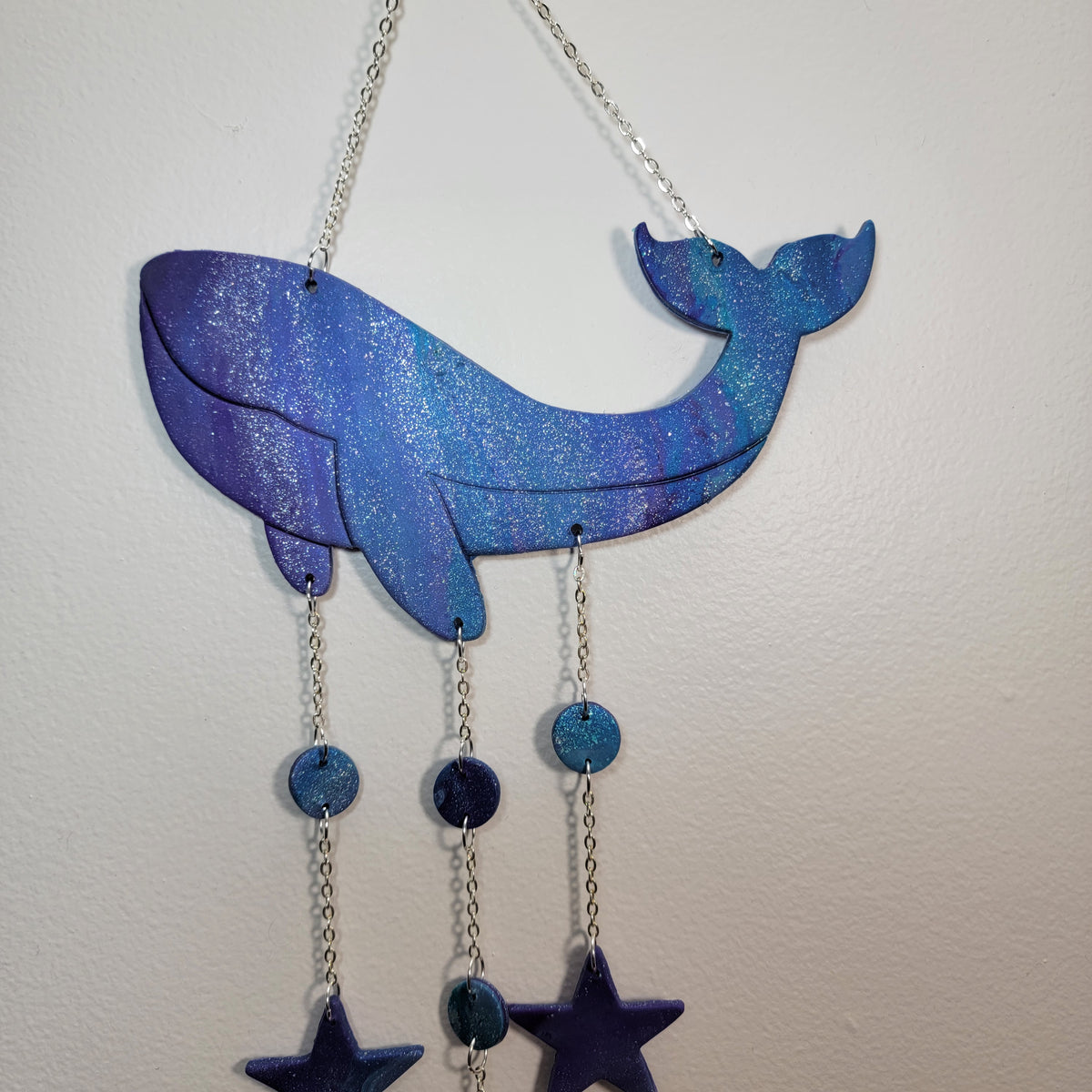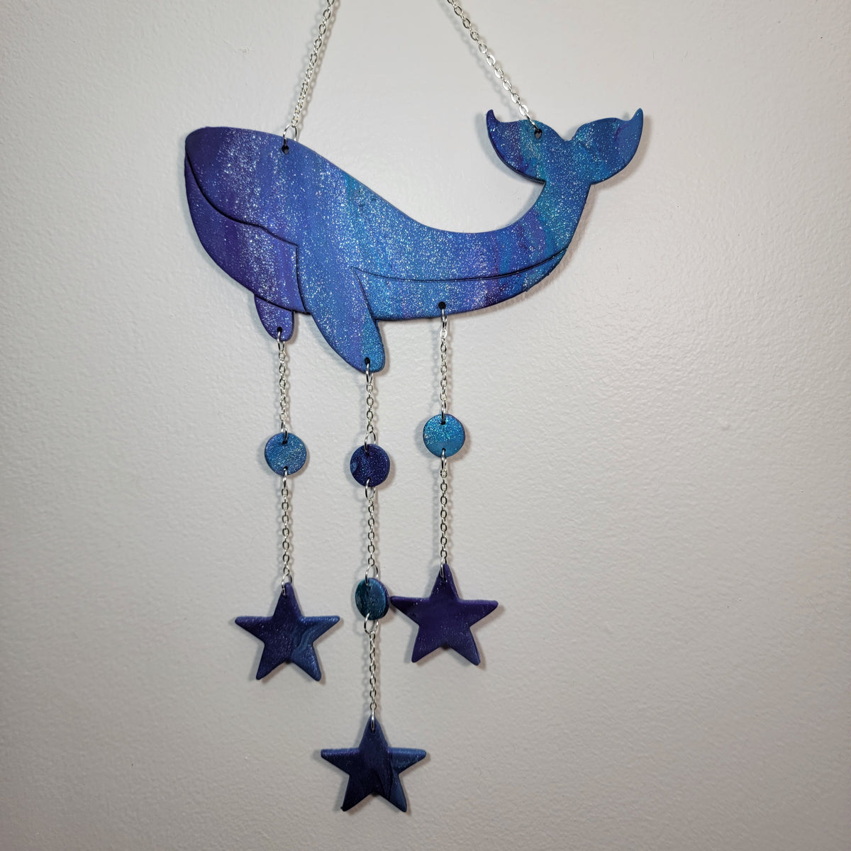 A magical whale wall hanging, trailing circles and stars. The whale is made from a beautiful mix of turquoise and purple polymer clay, with silver and silver foil mixed in.