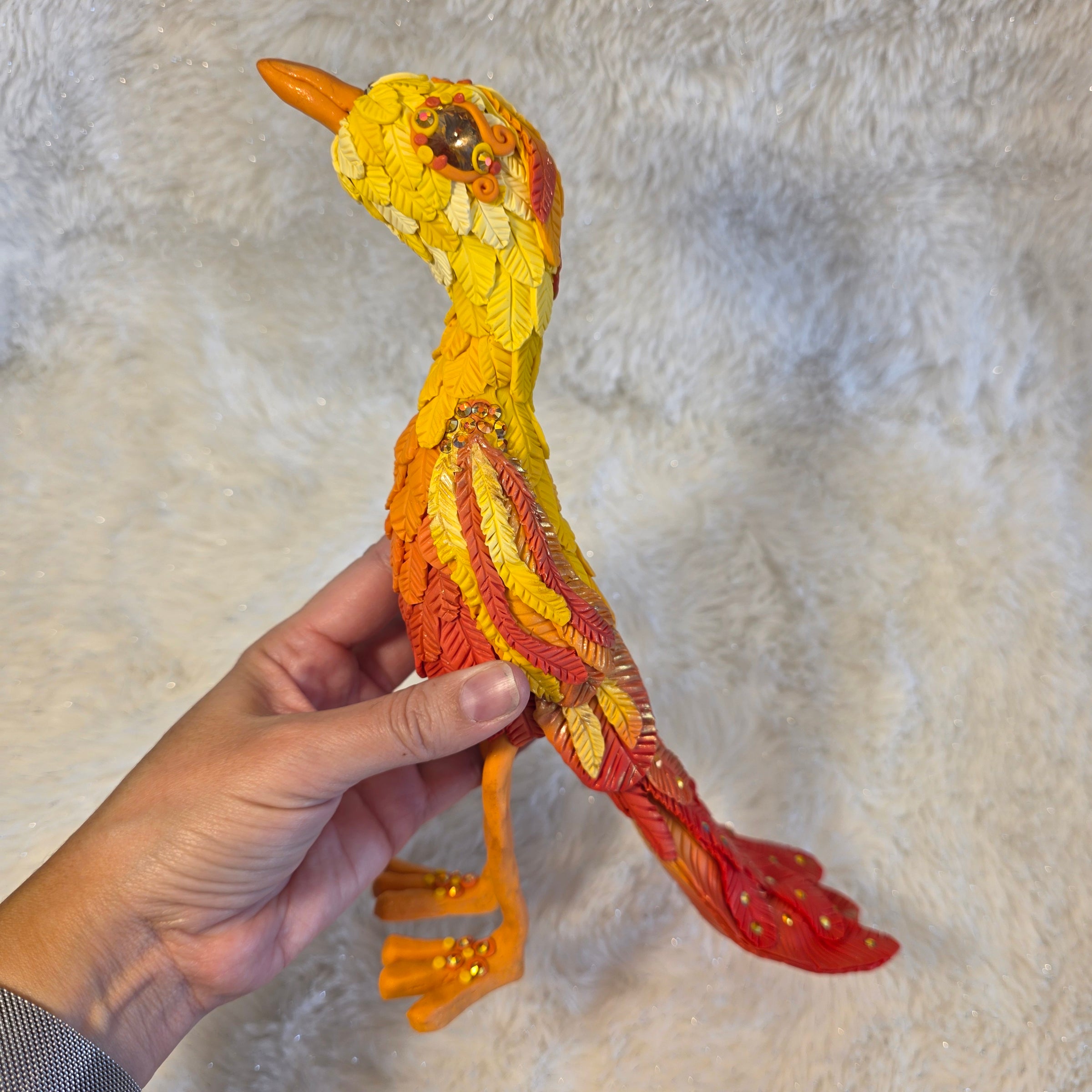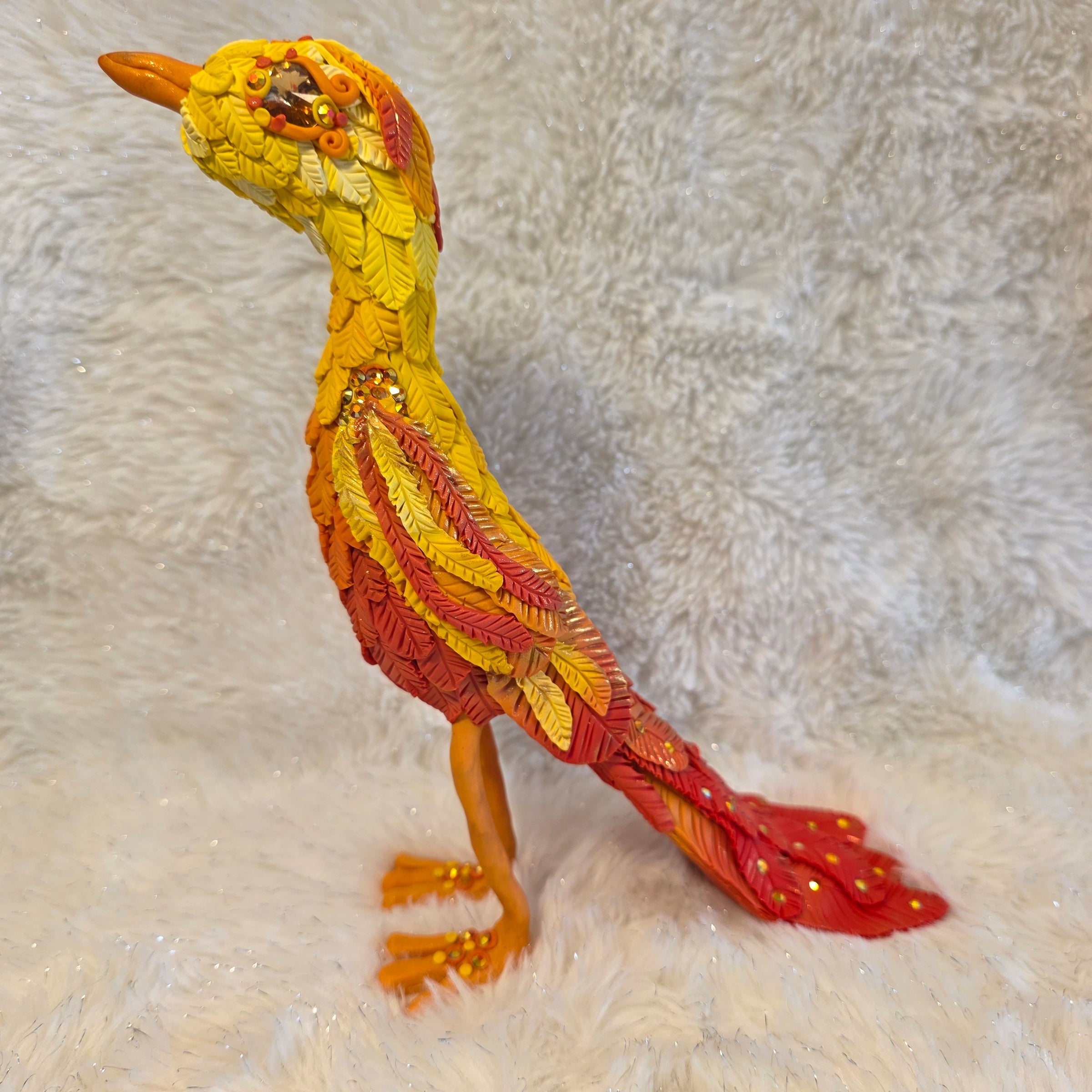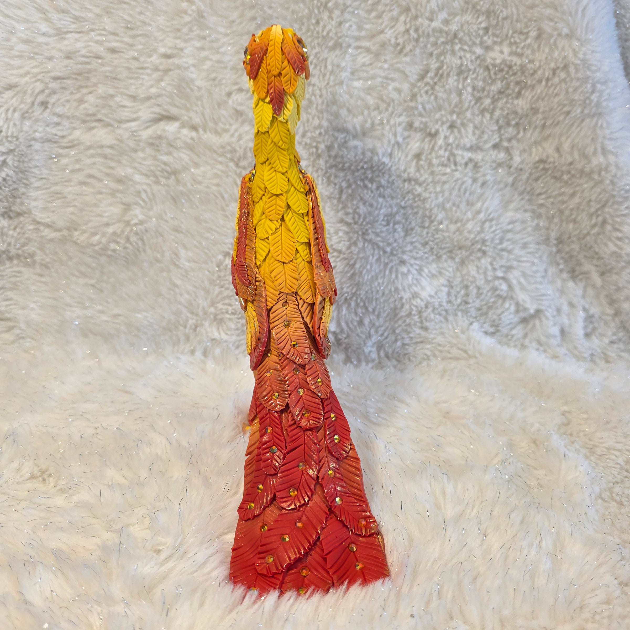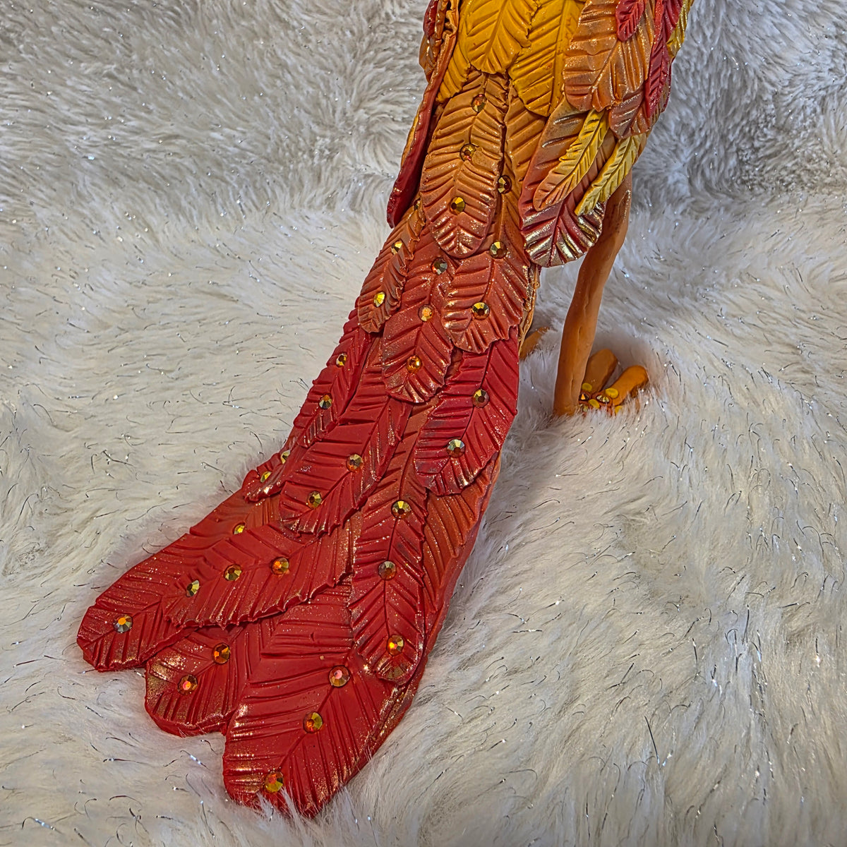 A tall, elegant phoenix with feathers ranging from yellow to red.  It has Prestige crystals for eyes, accented with swirls and rhinestones. Each feather was cut and textured by hand.  It stands on its own on long legs, with a dramatic tail trailing behind.  Its feathers are accented with rhinestones and chameleon powder, giving it a bit of extra magic.