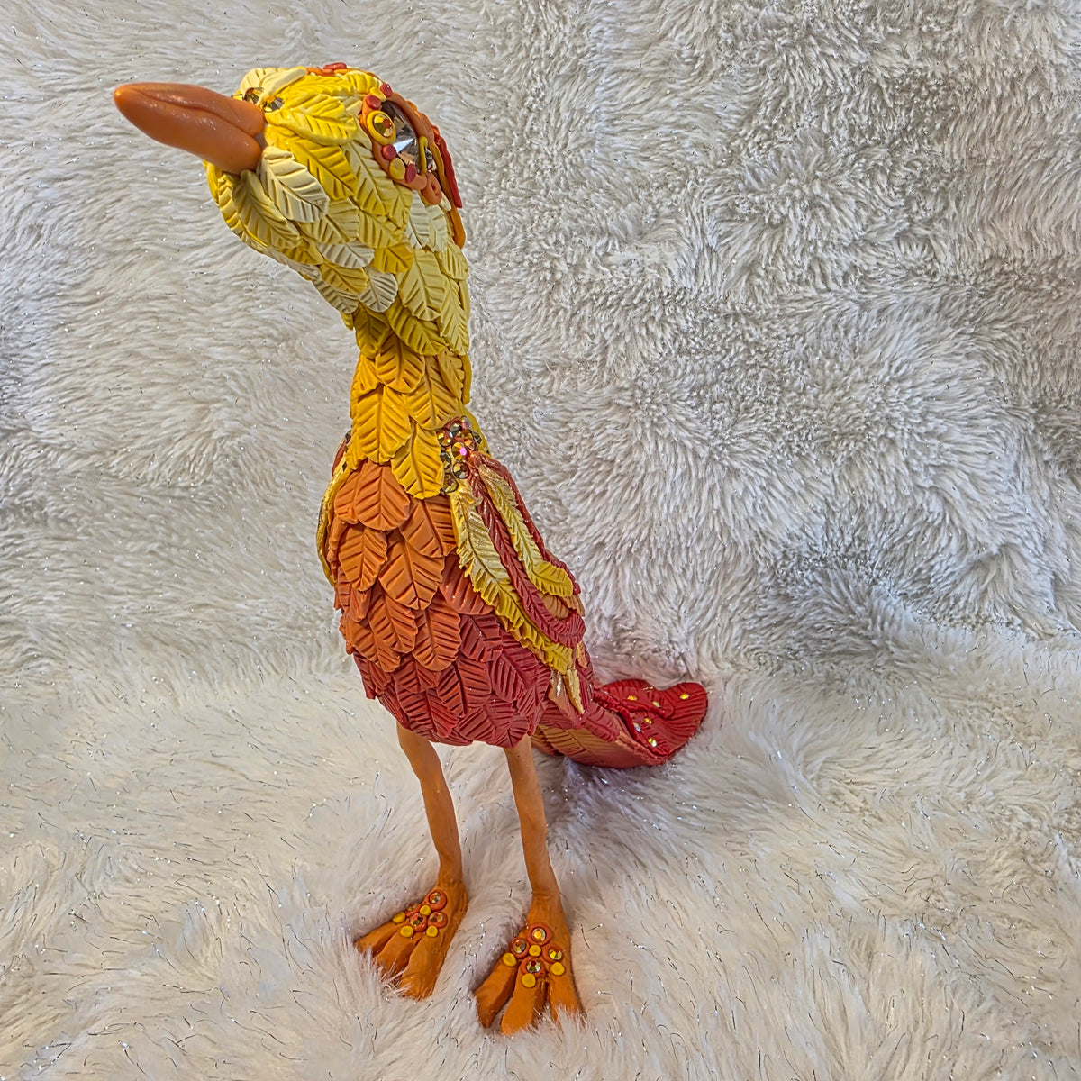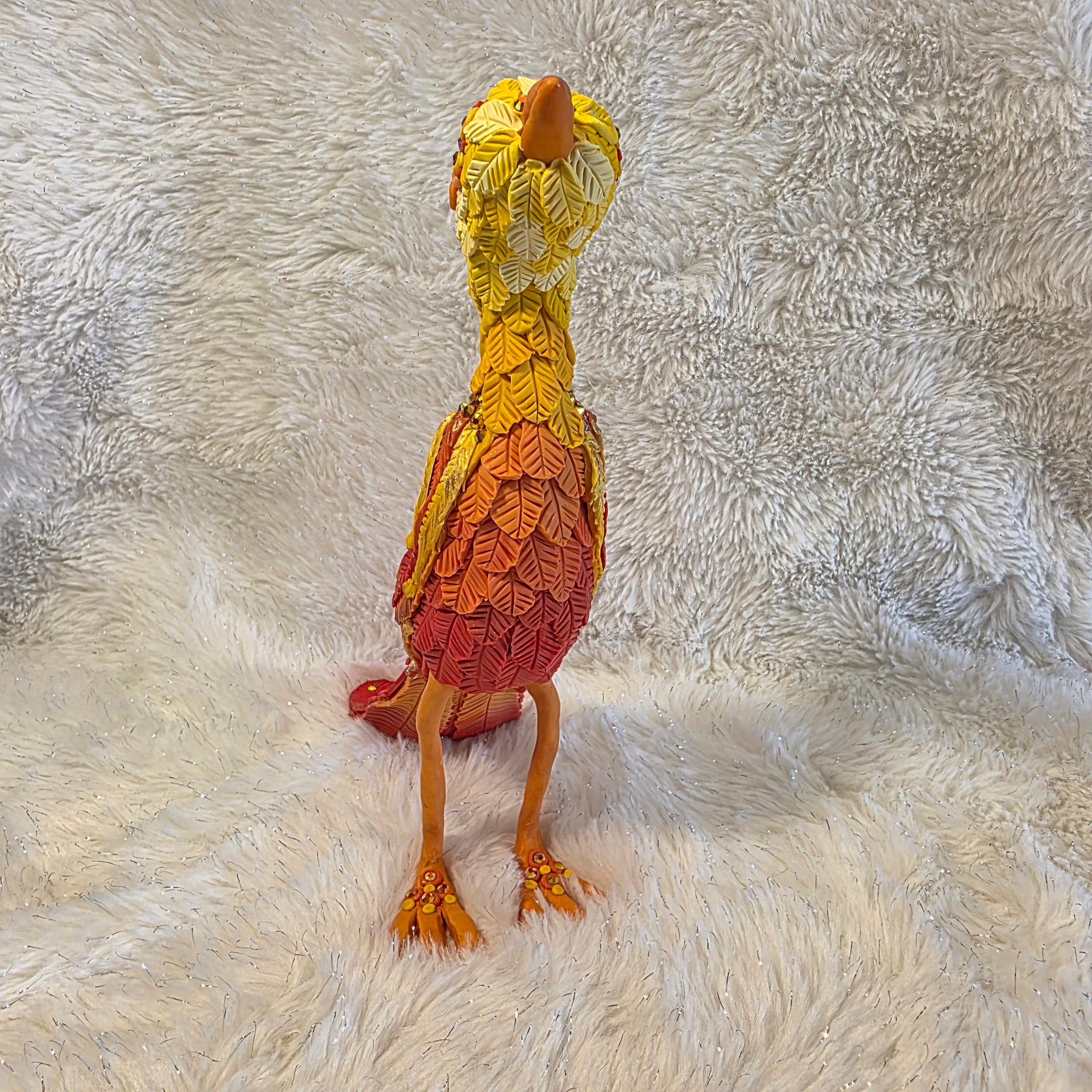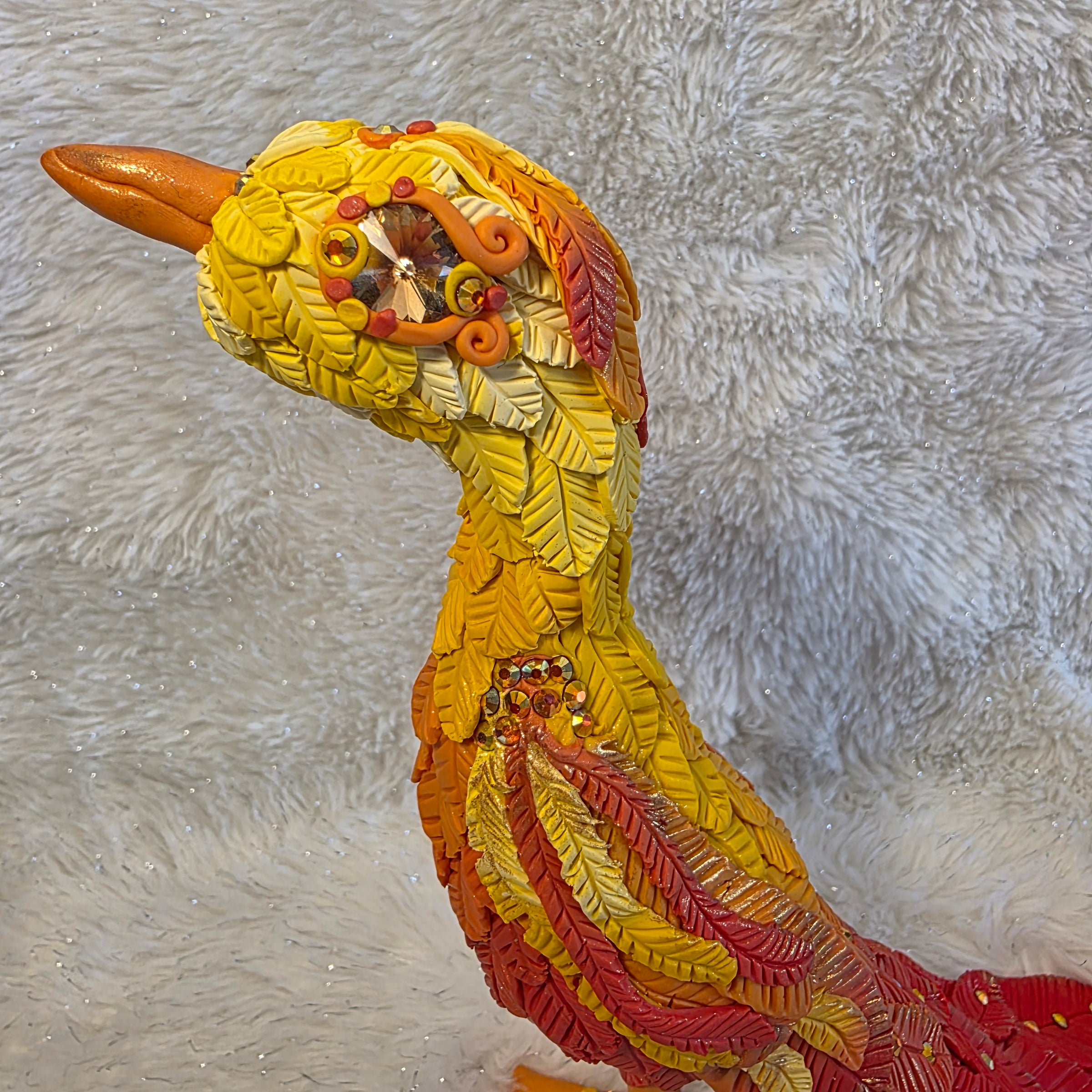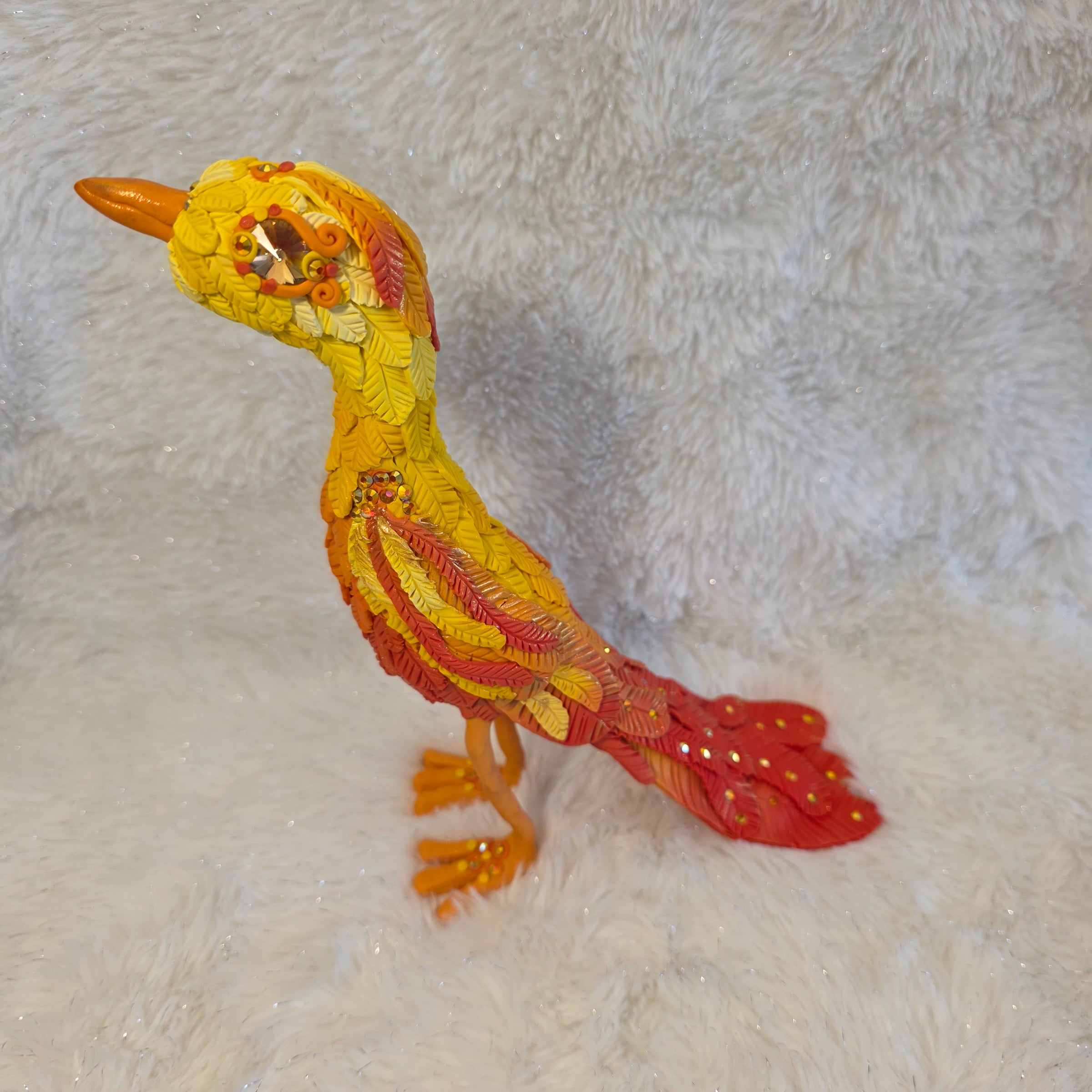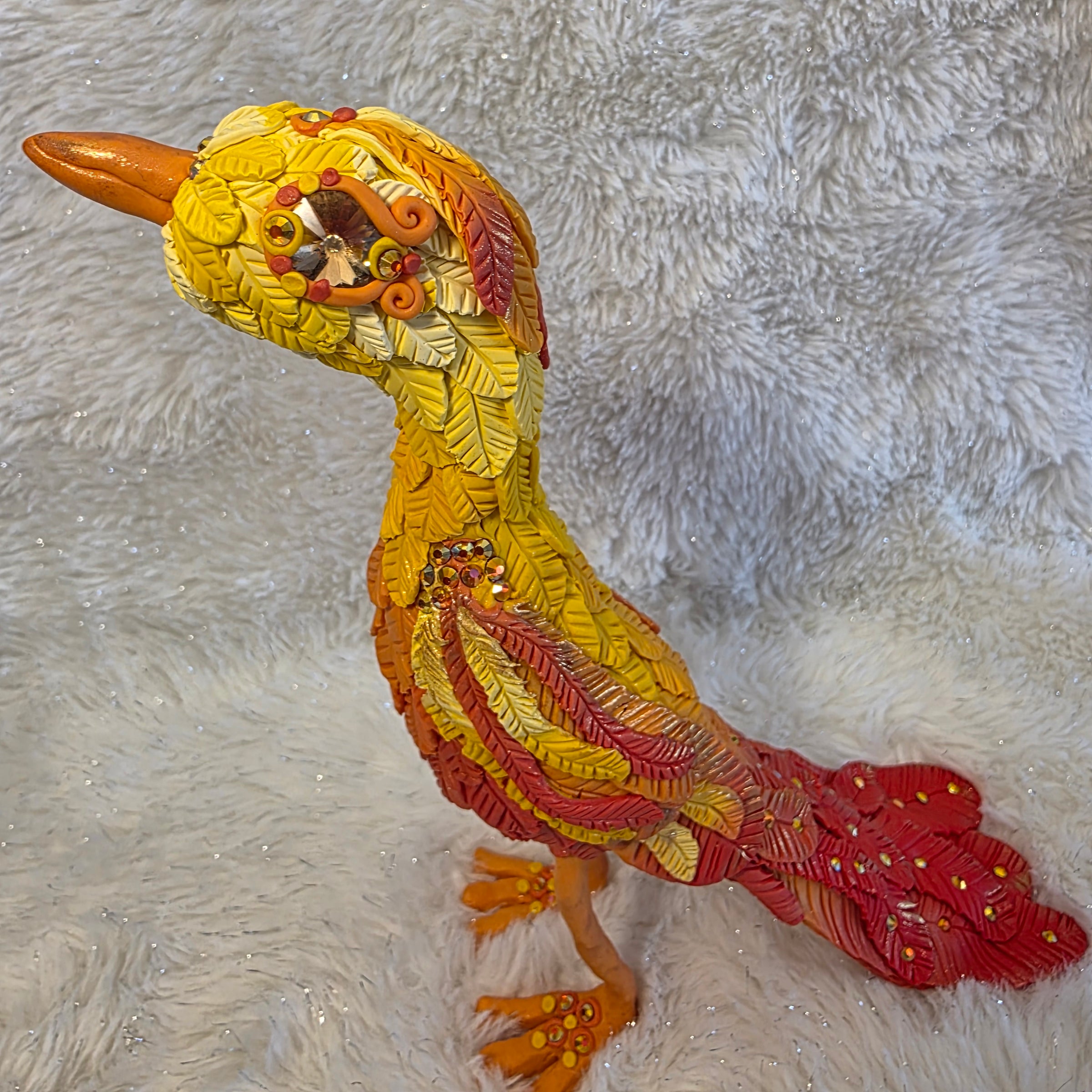A tall, elegant phoenix with feathers ranging from yellow to red.  It has Prestige crystals for eyes, accented with swirls and rhinestones. Each feather was cut and textured by hand.  It stands on its own on long legs, with a dramatic tail trailing behind.  Its feathers are accented with rhinestones and chameleon powder, giving it a bit of extra magic.