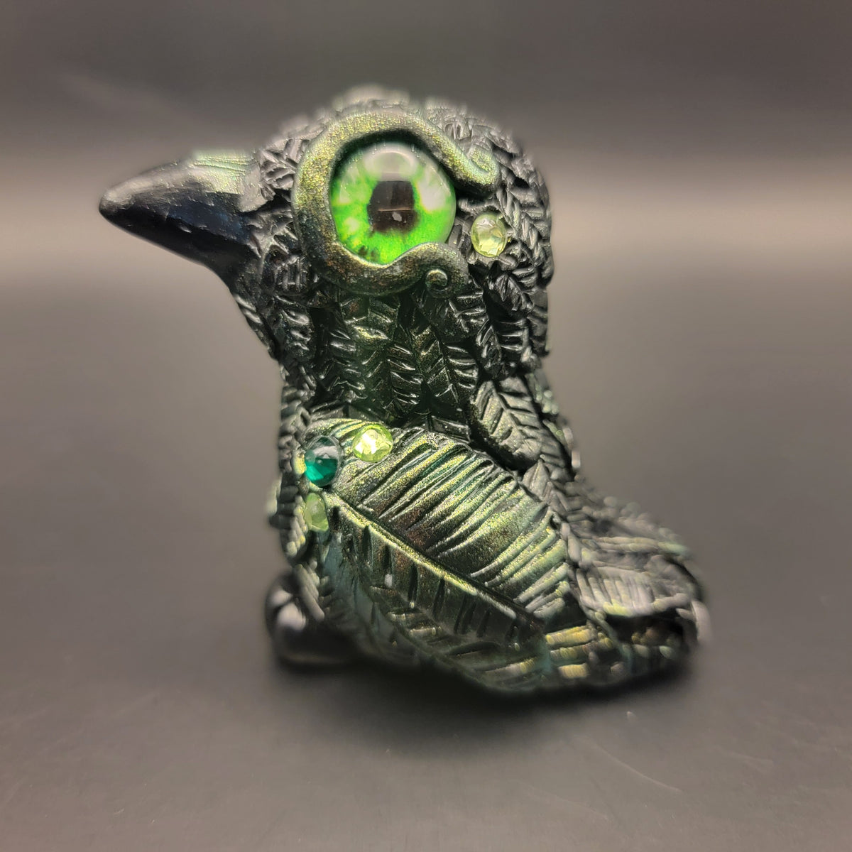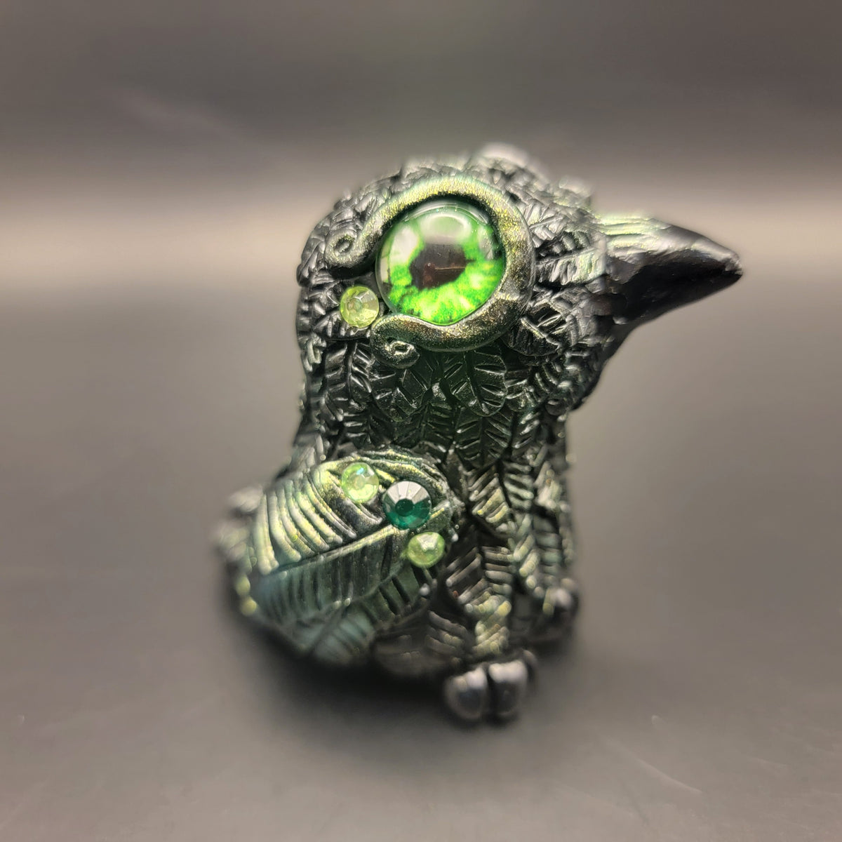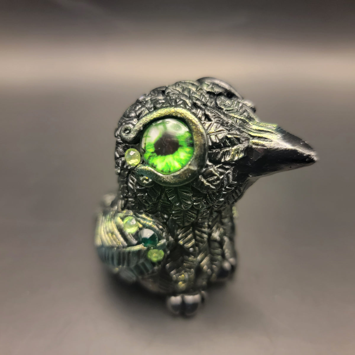 A one of a kind polymer clay crow! This little crow's feathers have been brushed with chameleon powder for a bit of extra sparkle, giving it a green shine over its black feathers. It has green glass eyes and light and dark green rhinestone accents next to its eyes and on its wings. Each feather on the crow is cut, textured, and placed by hand.