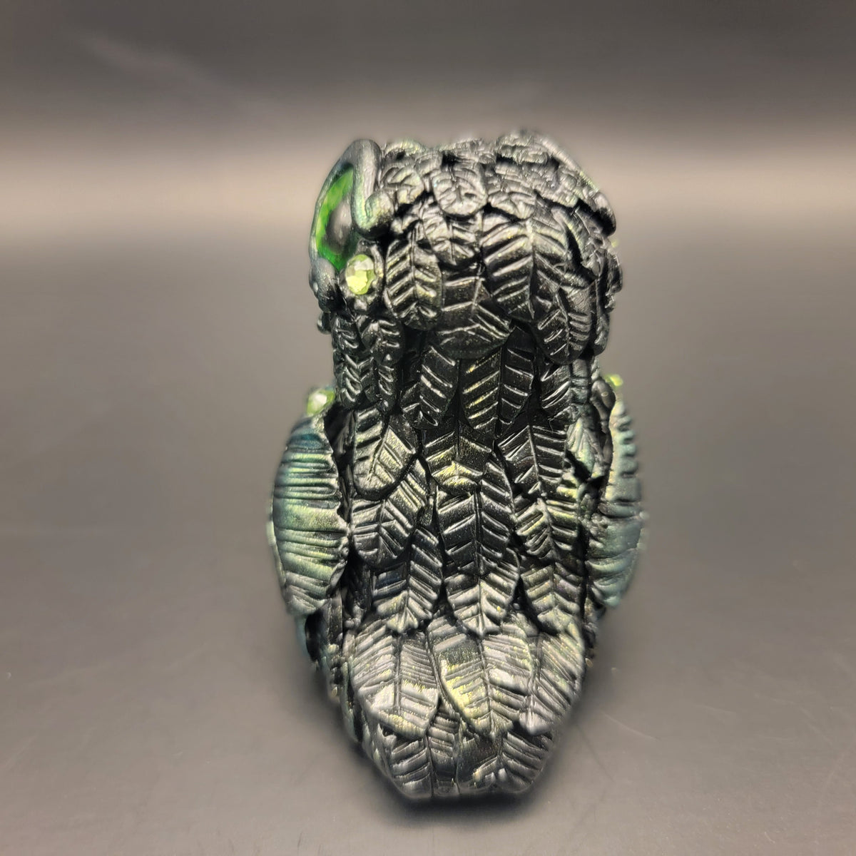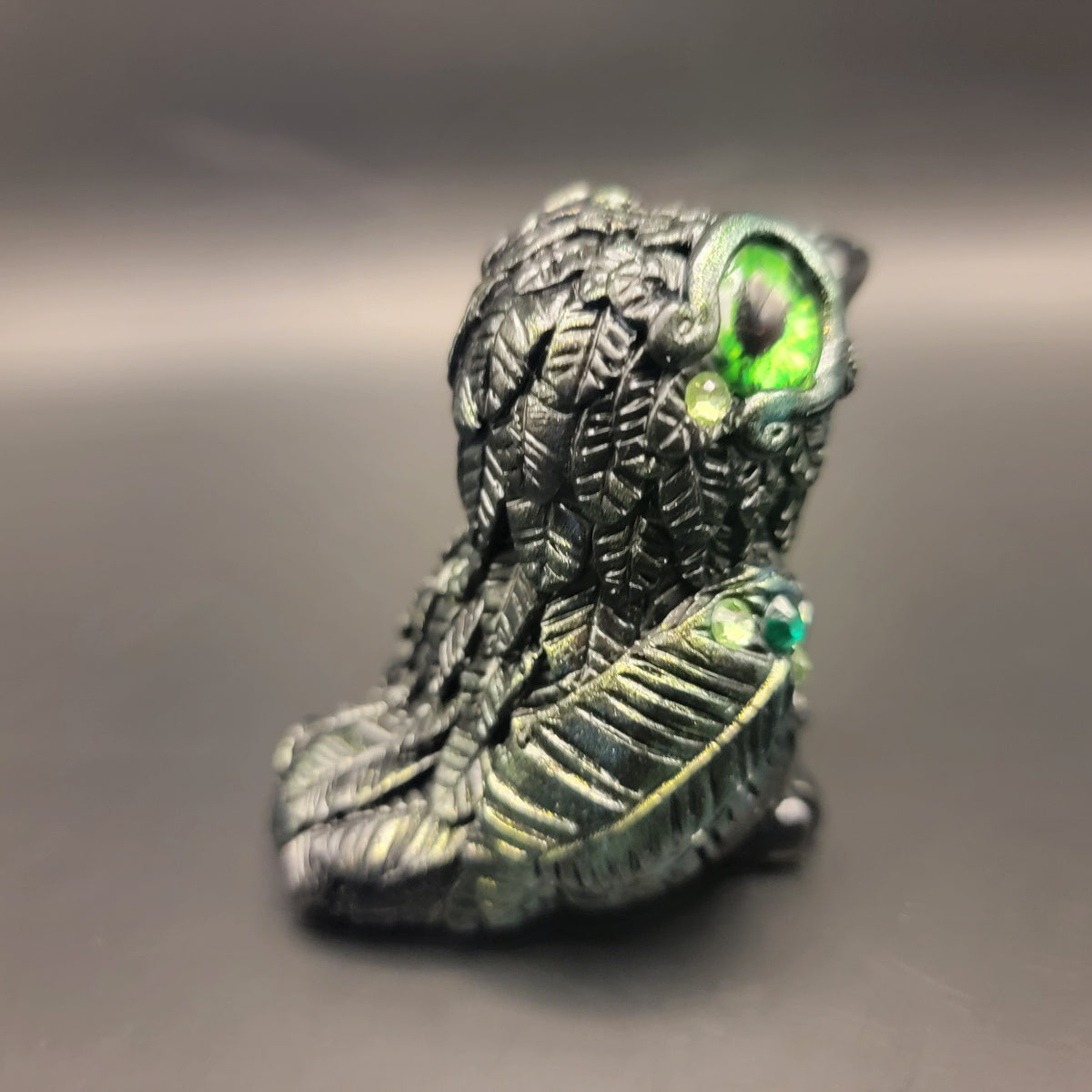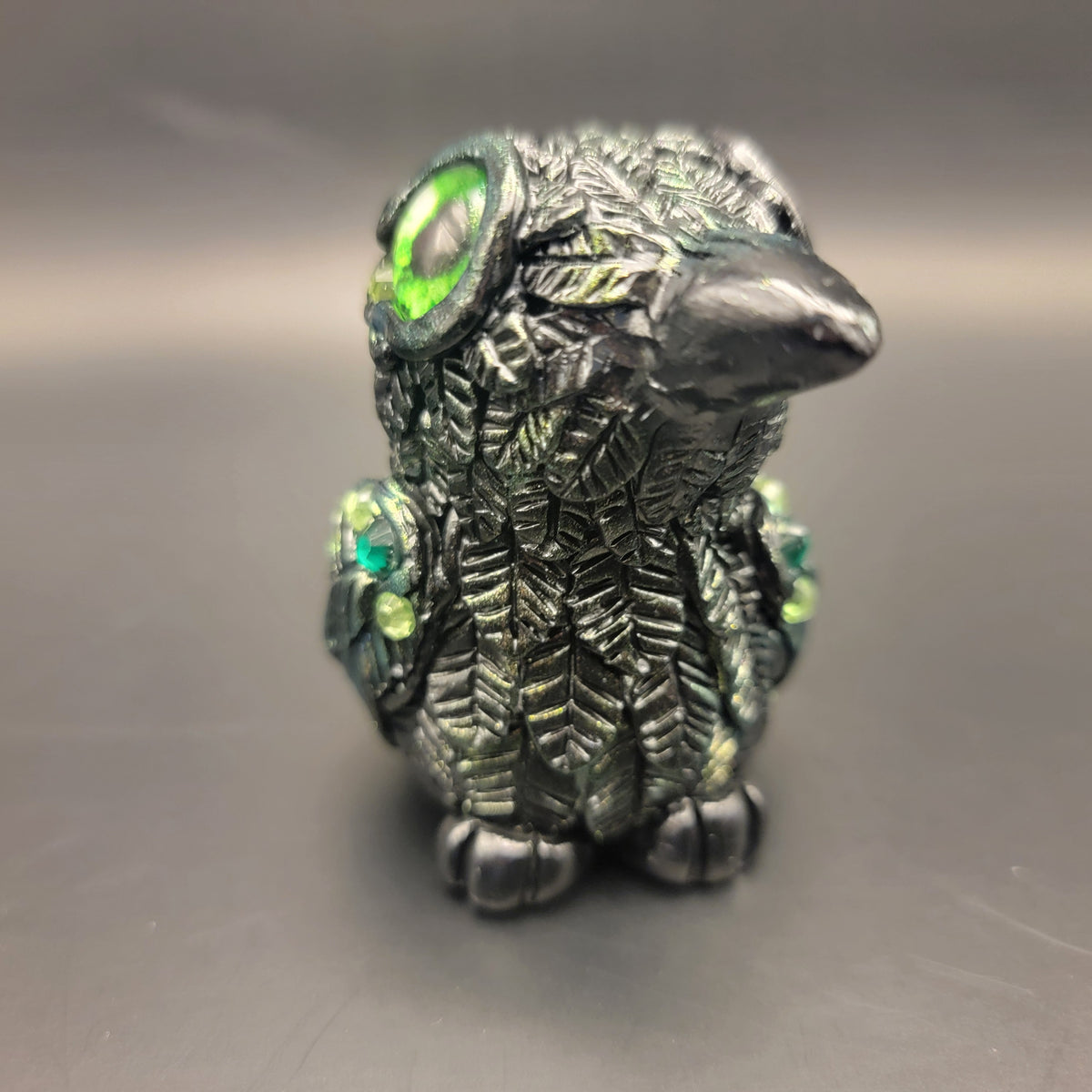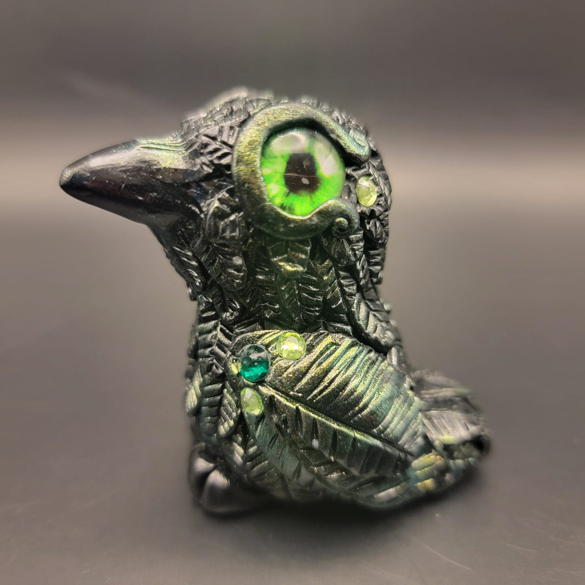 A one of a kind polymer clay crow! This little crow's feathers have been brushed with chameleon powder for a bit of extra sparkle, giving it a green shine over its black feathers. It has green glass eyes and light and dark green rhinestone accents next to its eyes and on its wings. Each feather on the crow is cut, textured, and placed by hand.