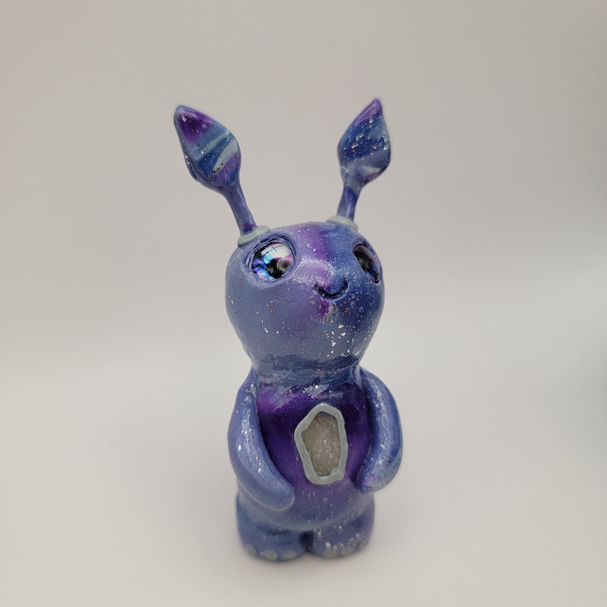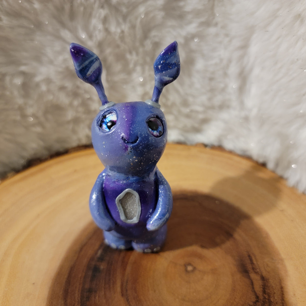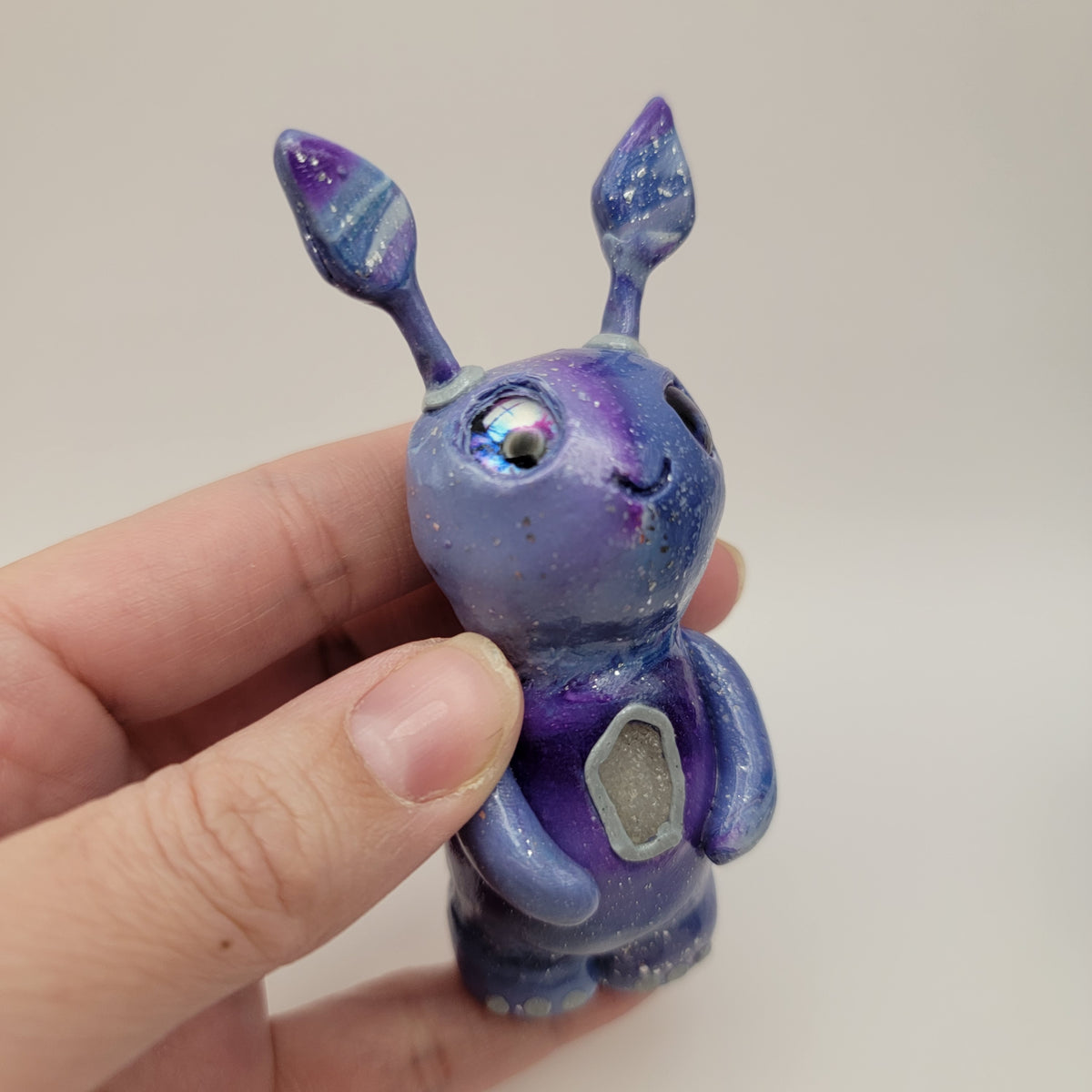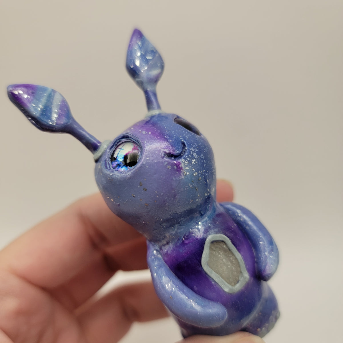 A sparkly little crystal sprite! This adorable polymer clay nature guardian is made with a mix of blue, purple, and silver clays with glitter and silver foil mixed throughout. It has a purple stripe down the center of its face and a good amount of sparkle, along with a piece of druzy in it's belly! This sprite glows a lot.
