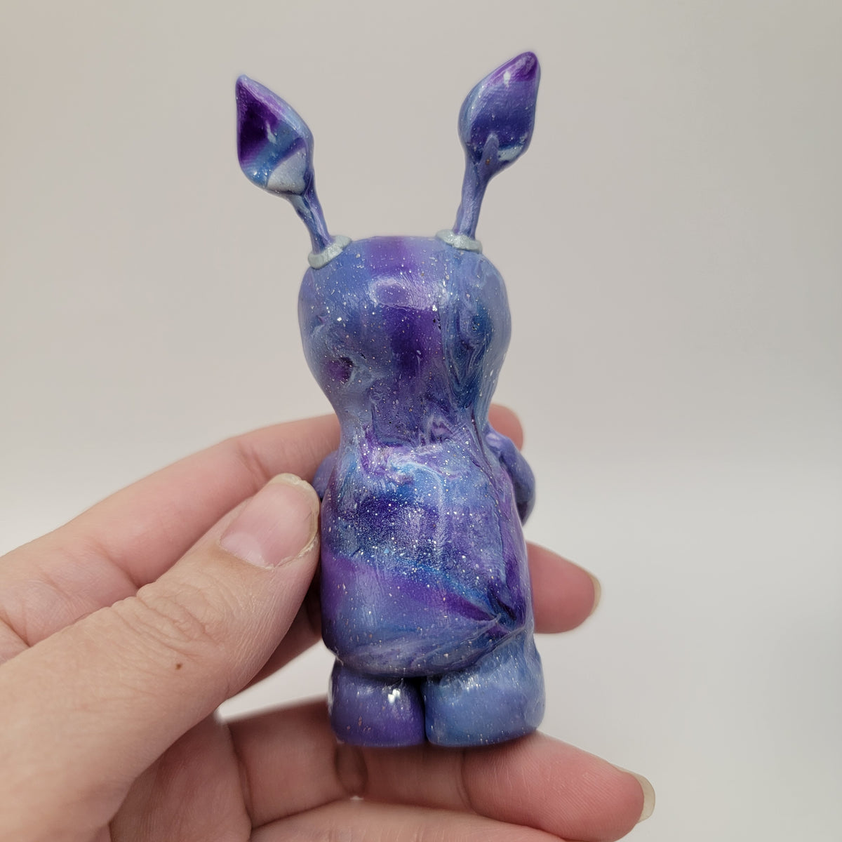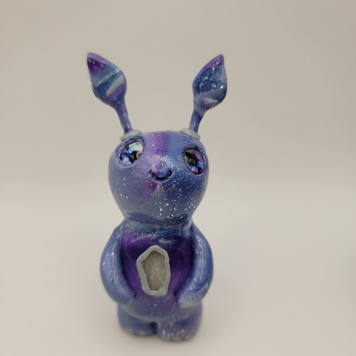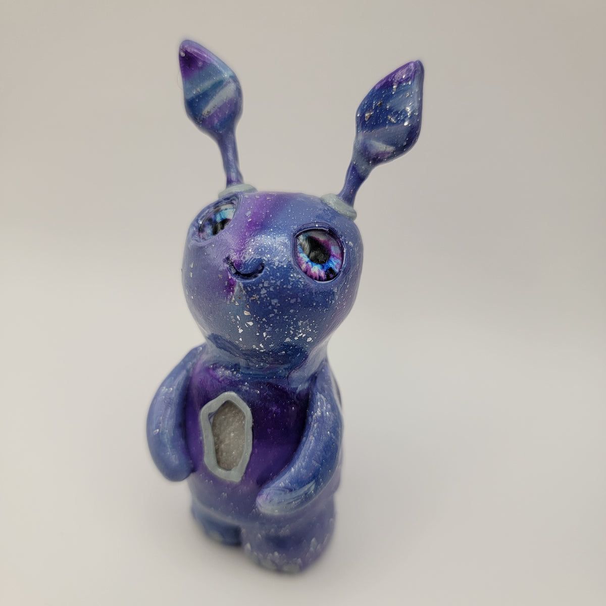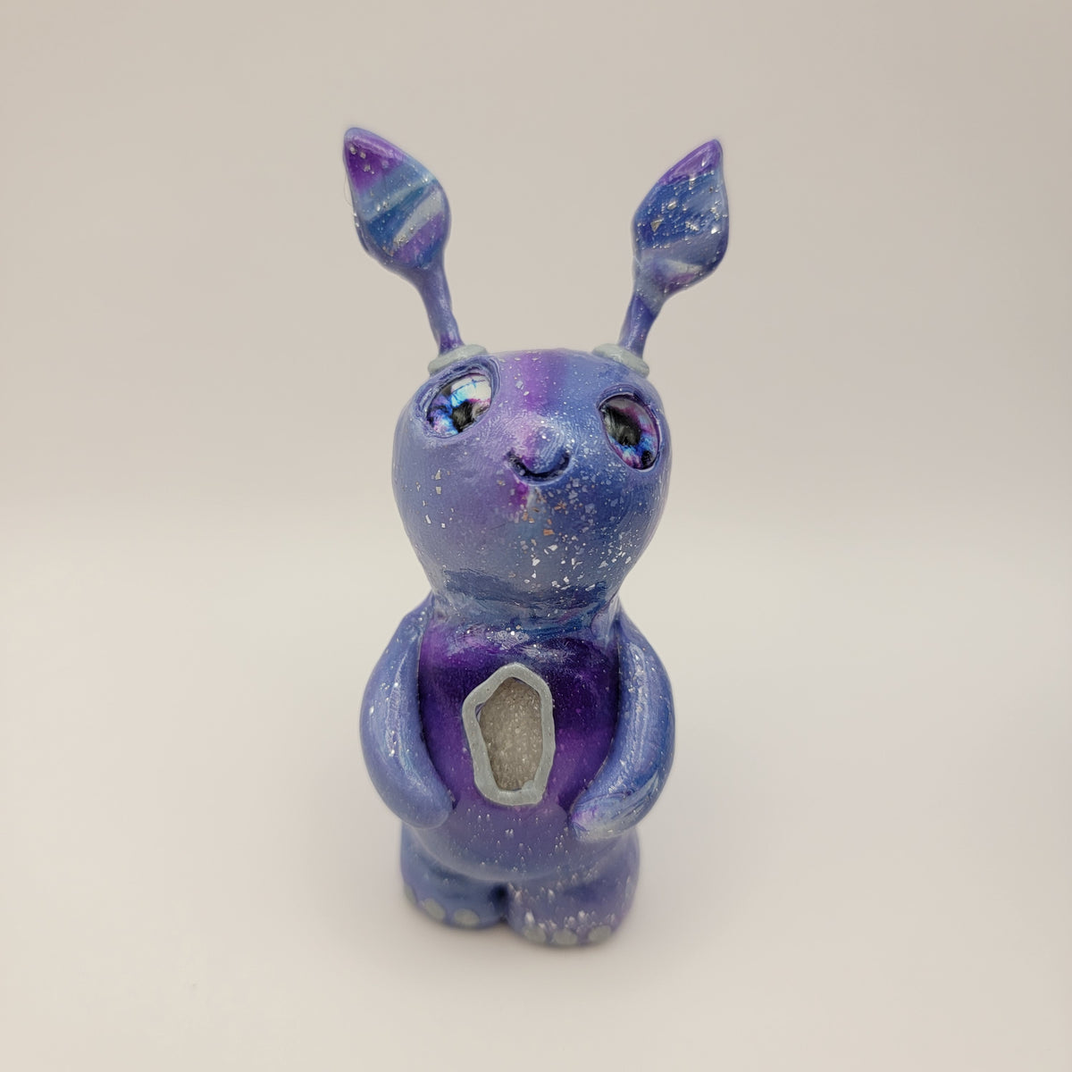A sparkly little crystal sprite! This adorable polymer clay nature guardian is made with a mix of blue, purple, and silver clays with glitter and silver foil mixed throughout. It has a purple stripe down the center of its face and a good amount of sparkle, along with a piece of druzy in it's belly! This sprite glows a lot.