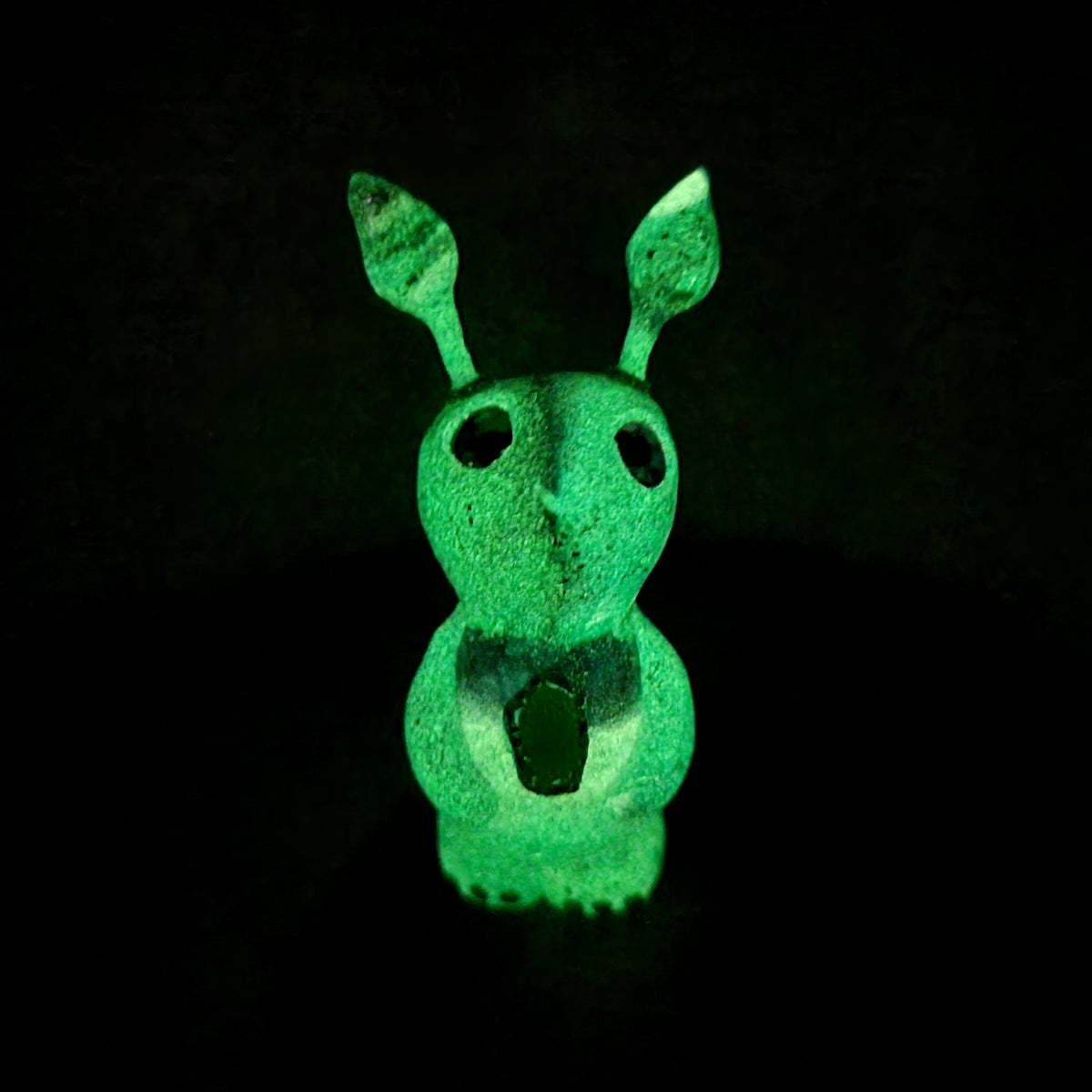Measures about 3.5 inches tall. Glowing photos taken after exposure to black light.