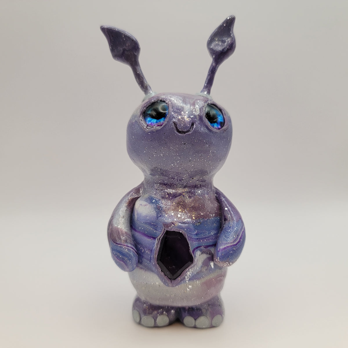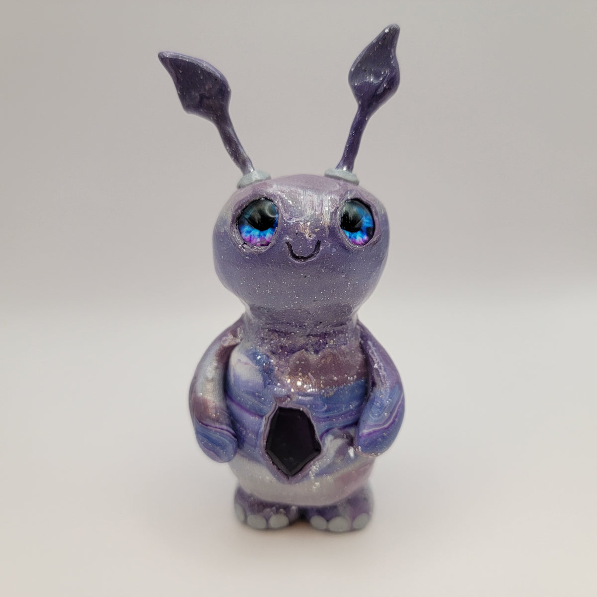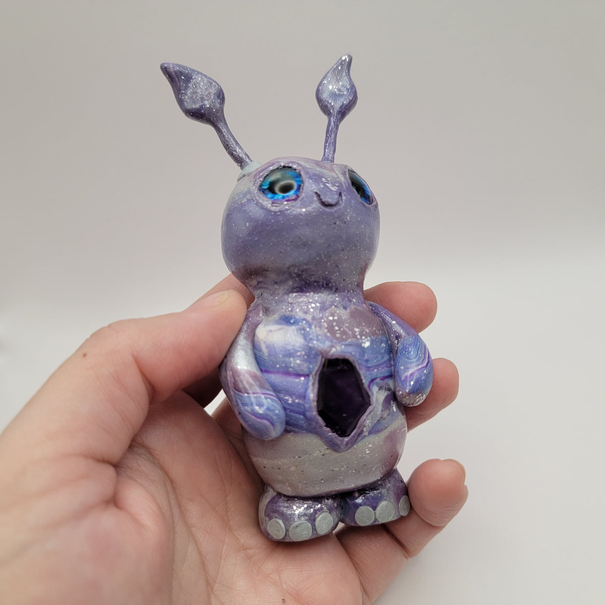 A delightful little crystal sprite! This adorable polymer clay nature guardian us made from a mix of blue, purple, and silver clay, along with all the sparkle! It has a lovely piece of amethyst in it's belly, and blue and purple glass eyes. This sprite has a fair amount fof glow also.
