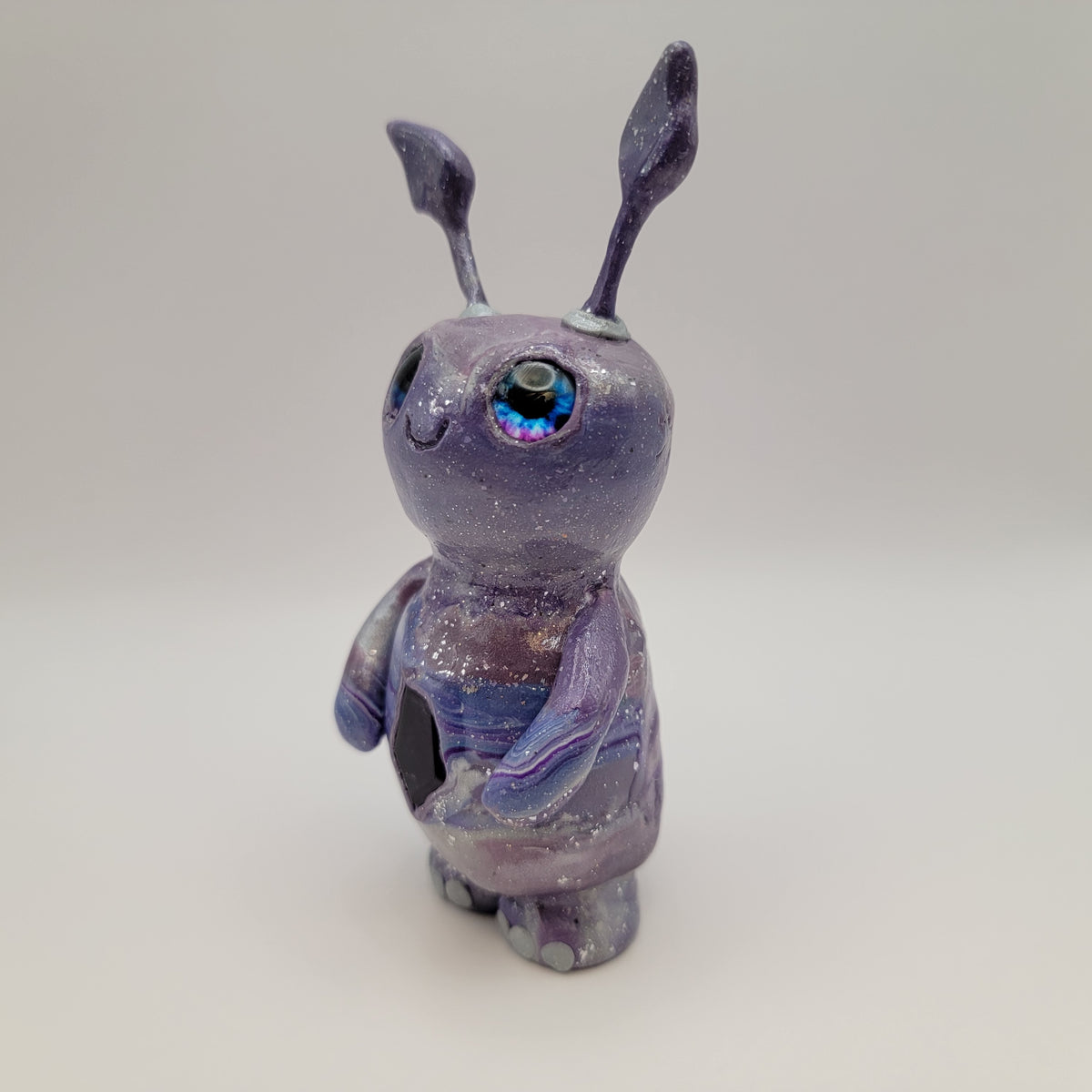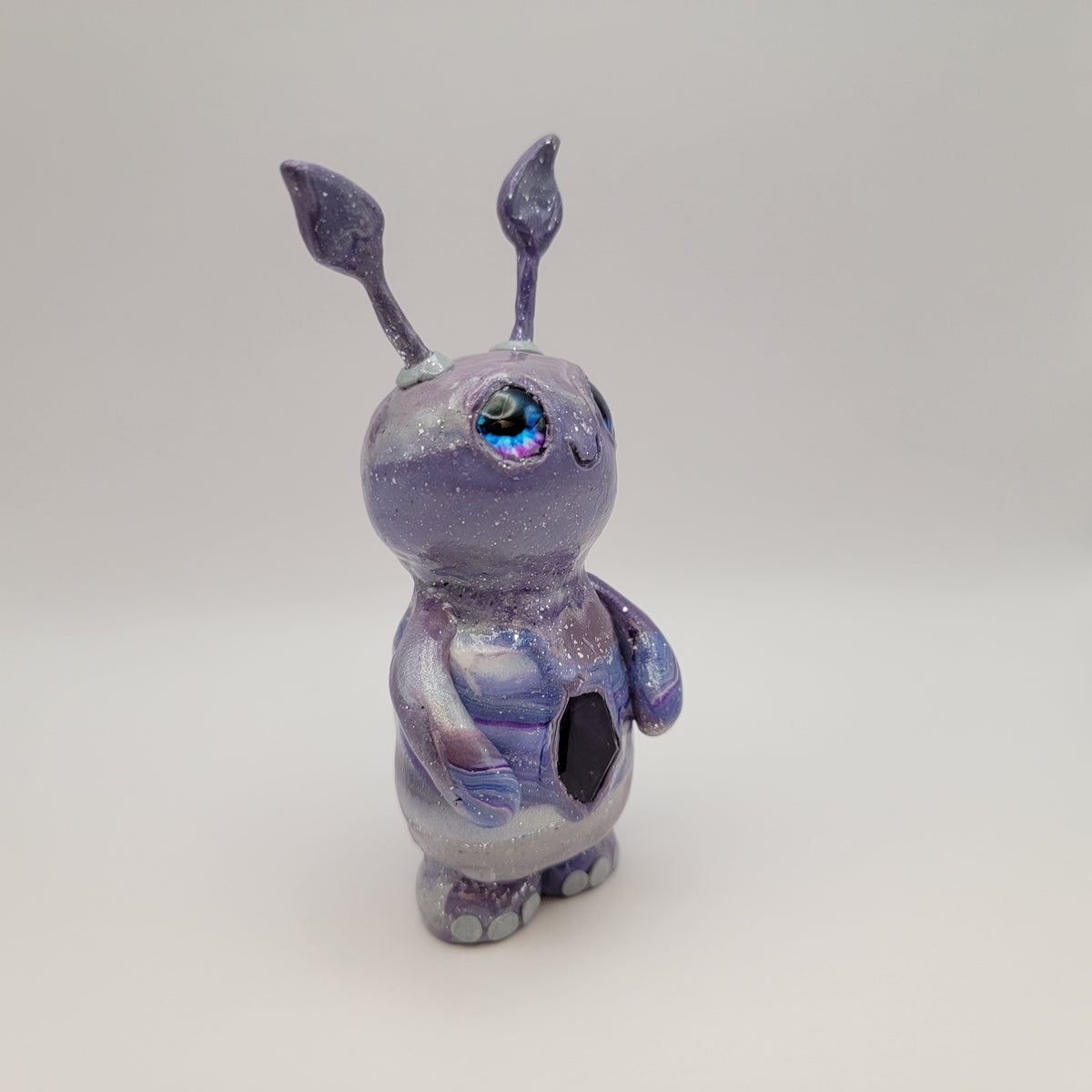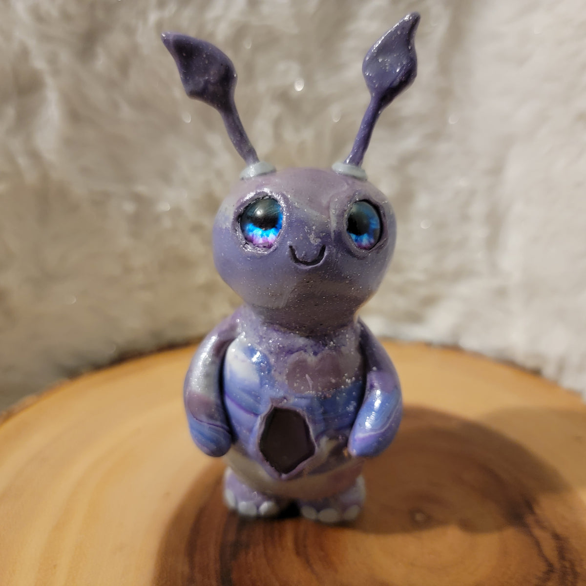 A delightful little crystal sprite! This adorable polymer clay nature guardian us made from a mix of blue, purple, and silver clay, along with all the sparkle! It has a lovely piece of amethyst in it's belly, and blue and purple glass eyes. This sprite has a fair amount fof glow also.