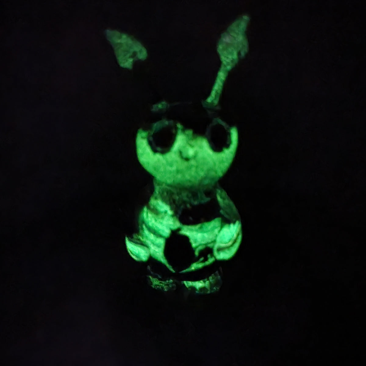 Measures about 4.4 inches tall. Glowing photos taken after exposure to black light.