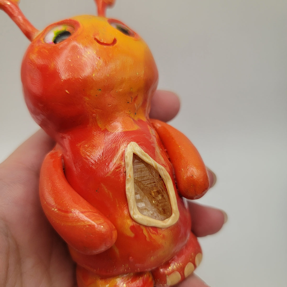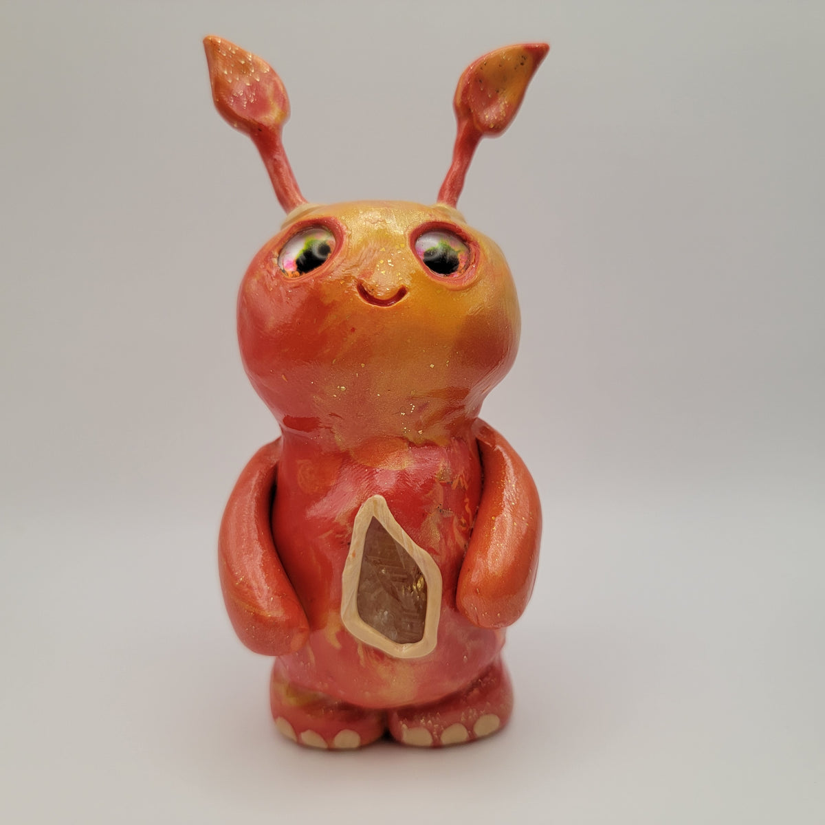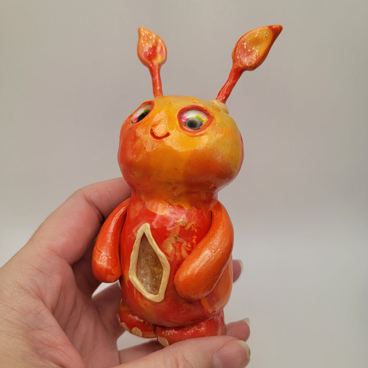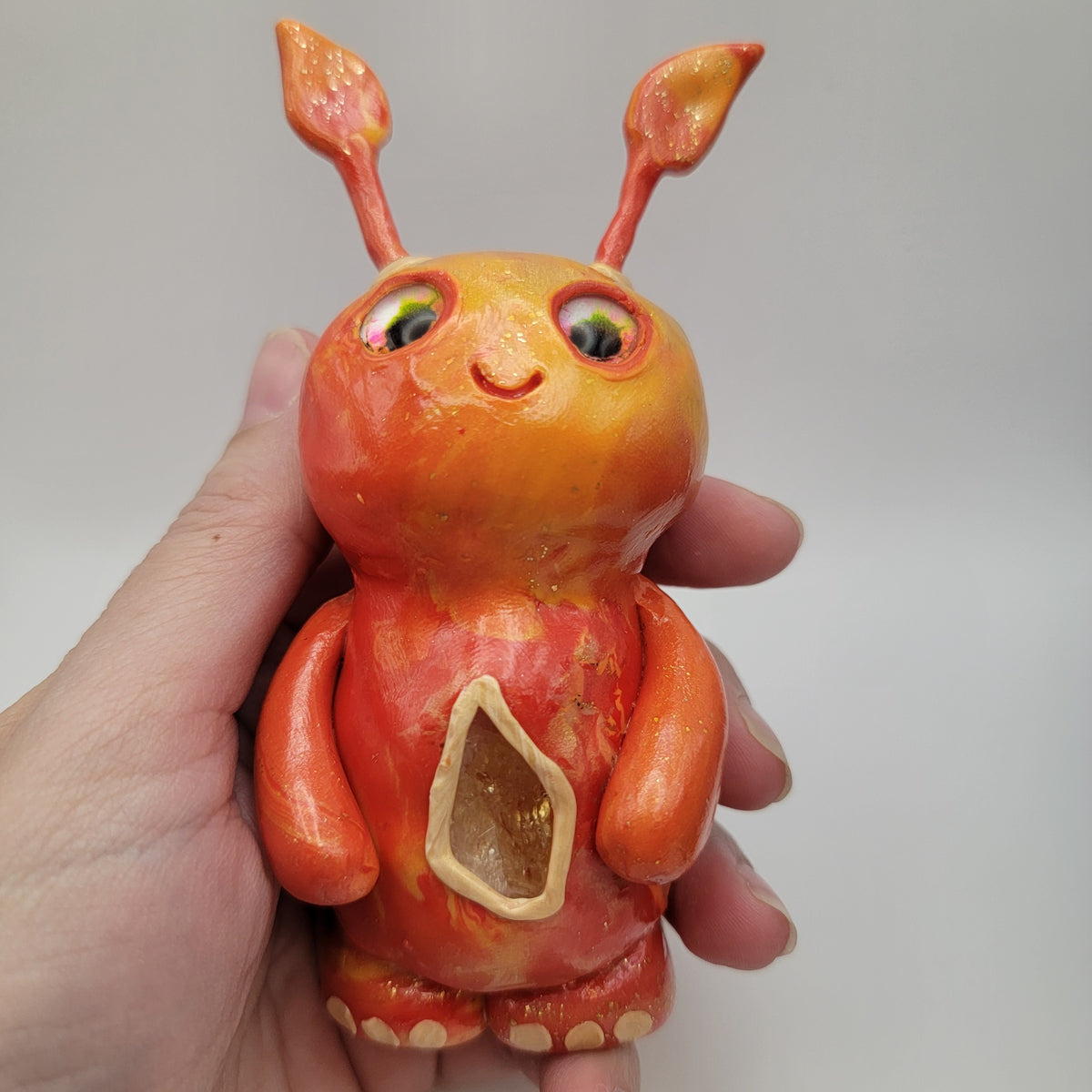 A firey crystal sprite! This adorable polymer clay nature guardian is made of a mix of red, orange, and yellow clay and features a citrine crystal. It has a colorful glow, and it one of the largest crystal sprites of this collection!