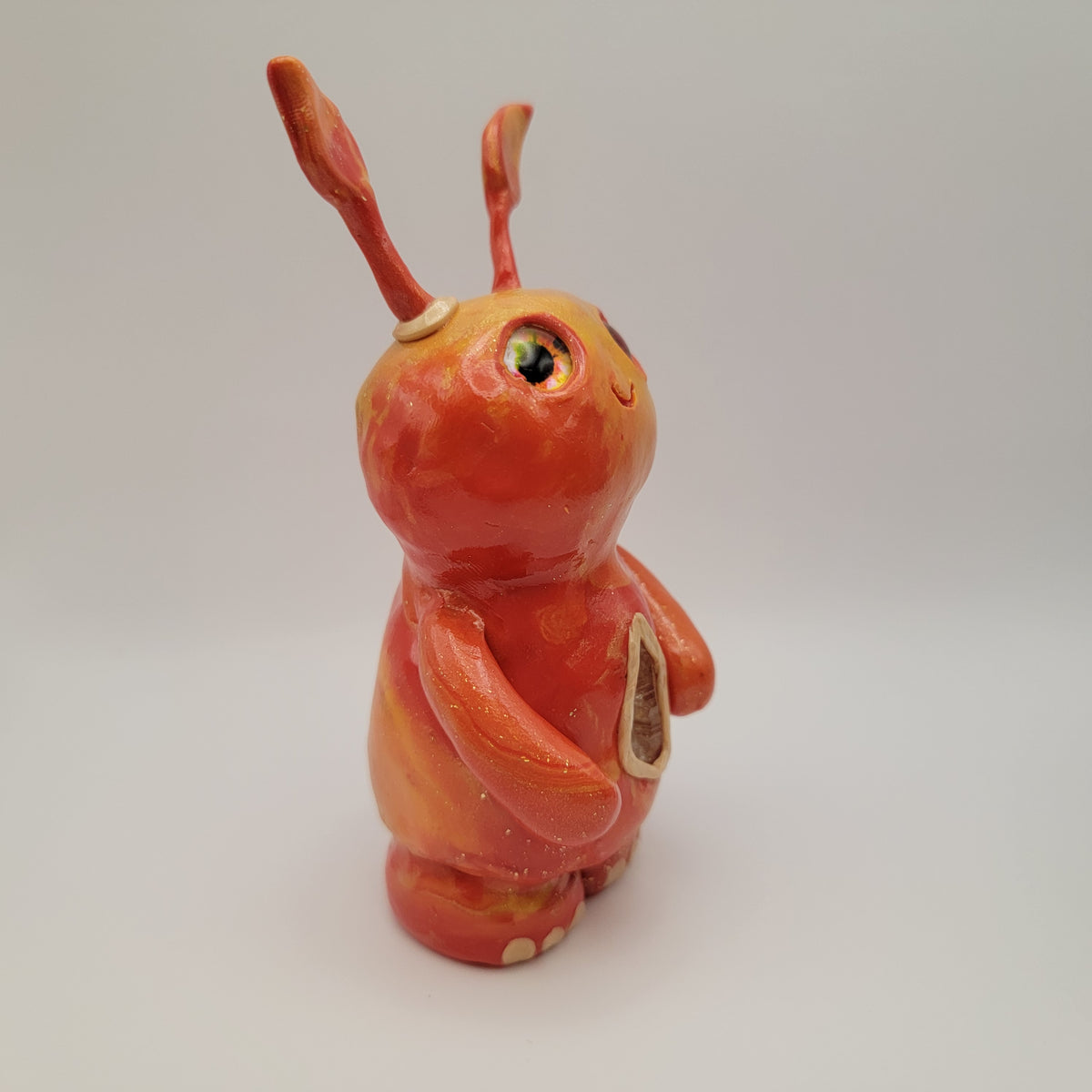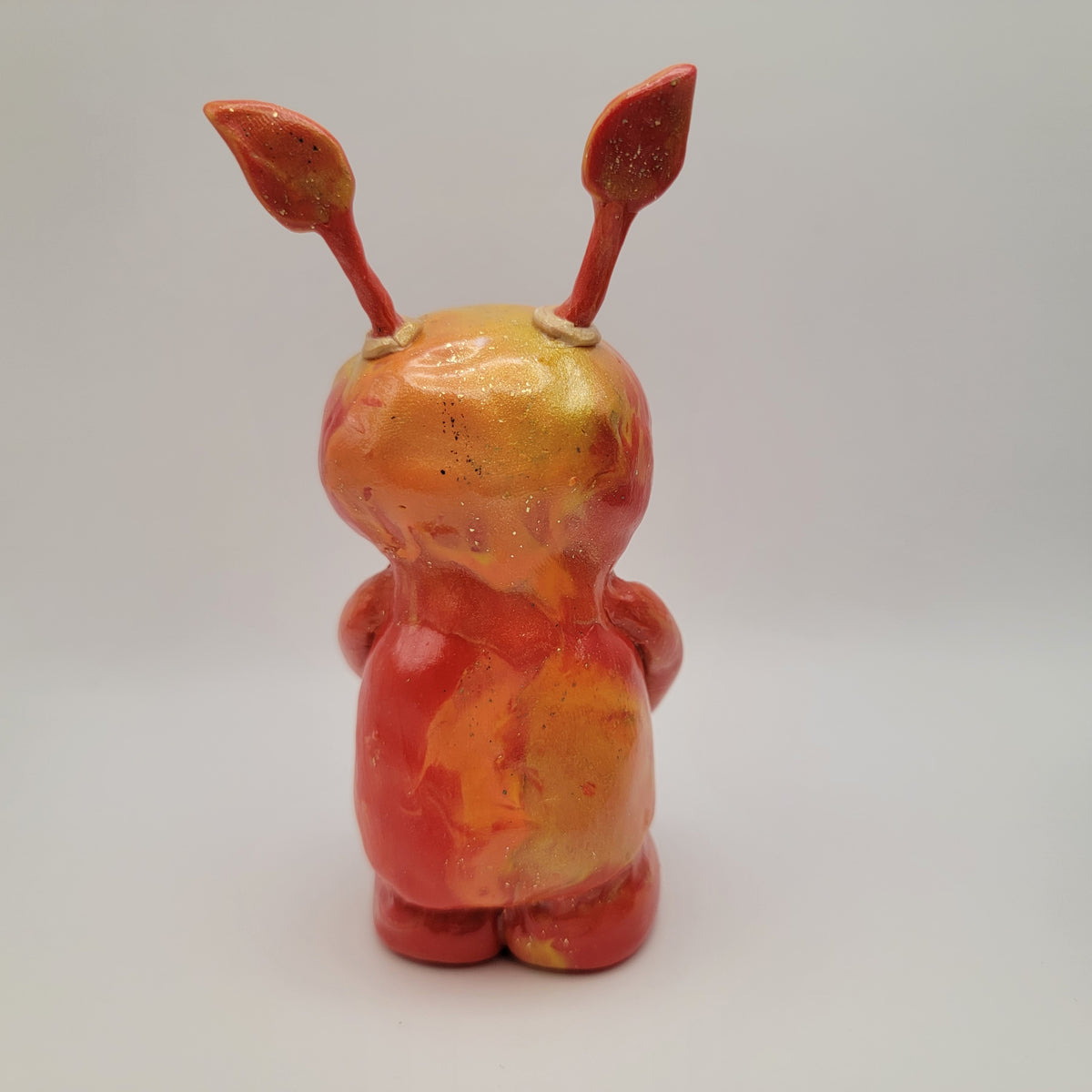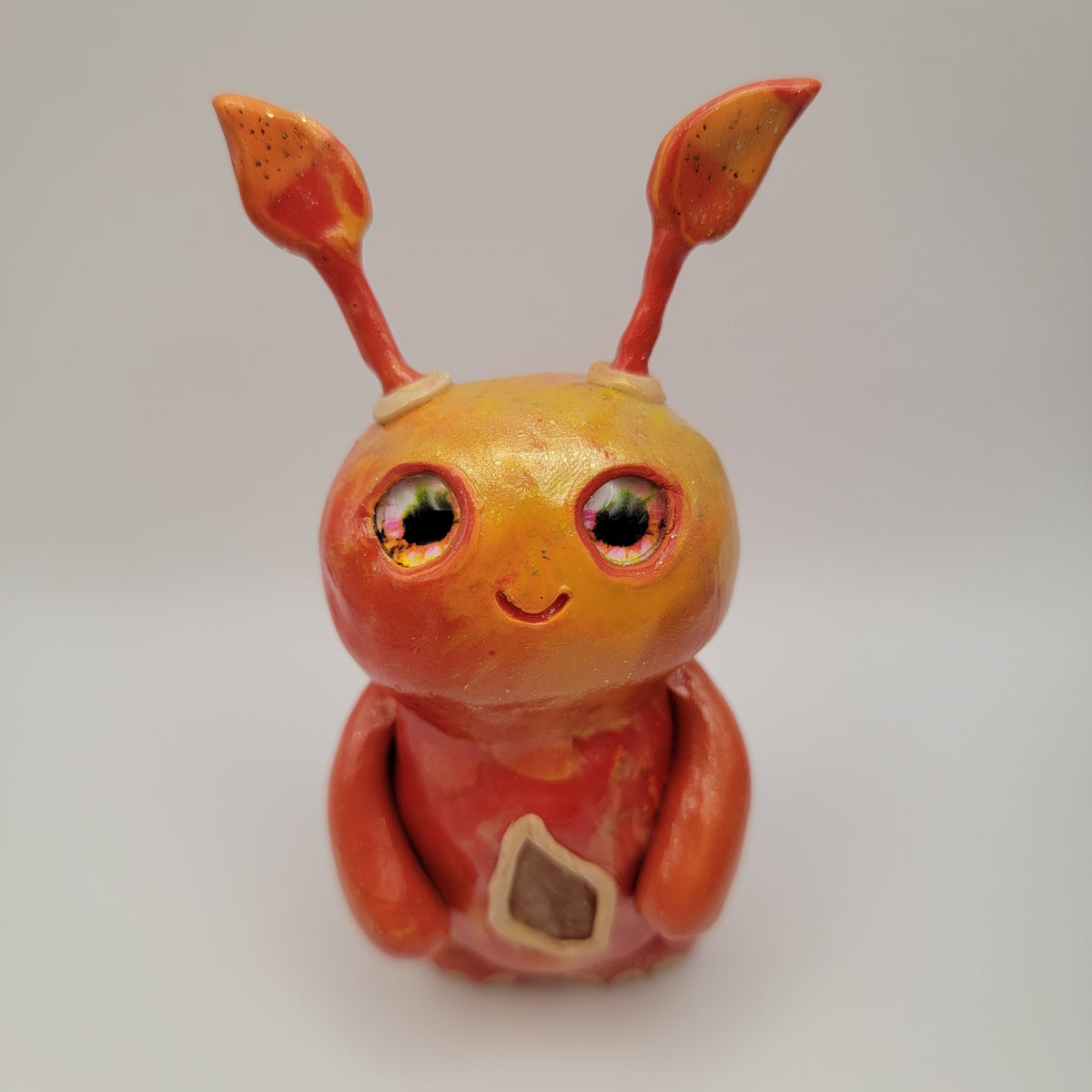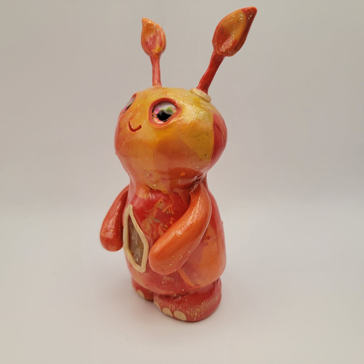 A firey crystal sprite! This adorable polymer clay nature guardian is made of a mix of red, orange, and yellow clay and features a citrine crystal. It has a colorful glow, and it one of the largest crystal sprites of this collection!