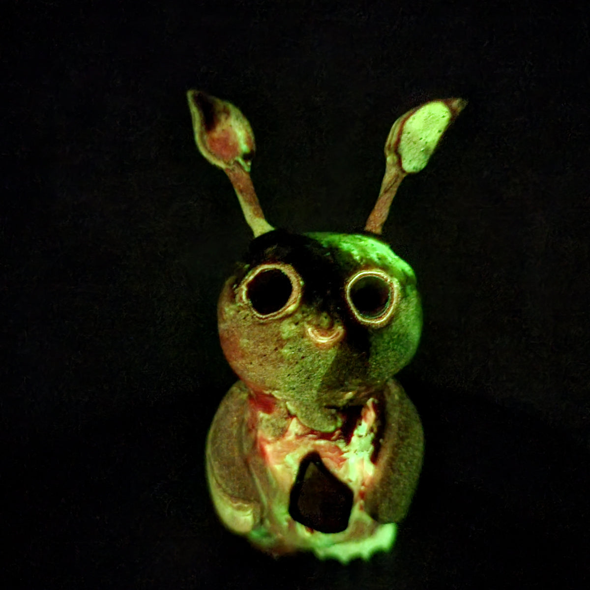 Measures about 4.5 inches tall. Glowing photos taken after exposure to black light.