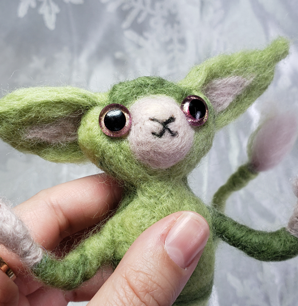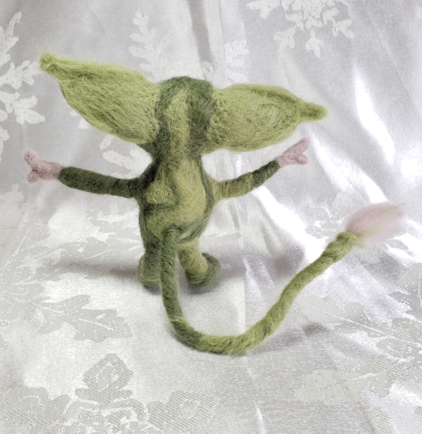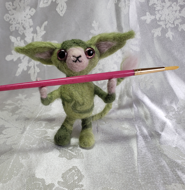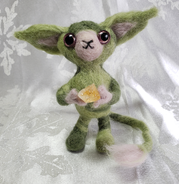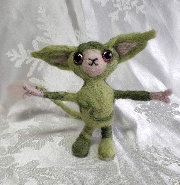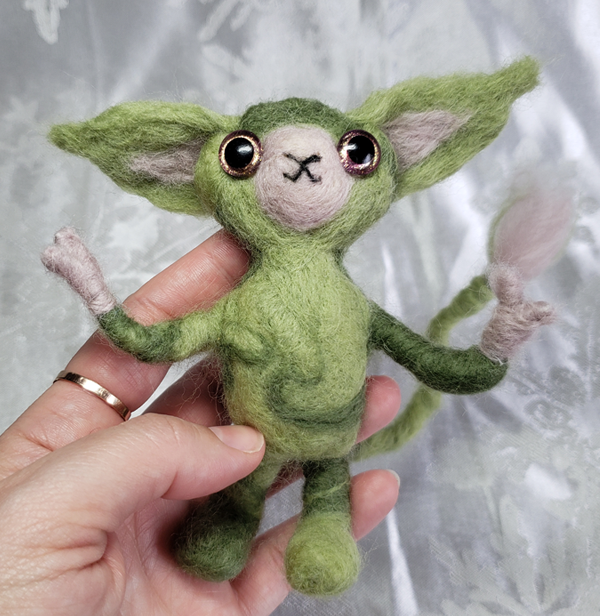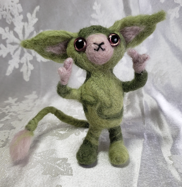 Made with wire, roving wool, and painted glass eyes.  Needle felted sculptures are not recommended for children.  Do not wet. To see more friendly gremlins (and other creatures), visit the needle felted sculptures page.