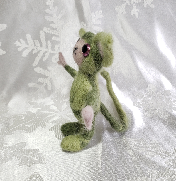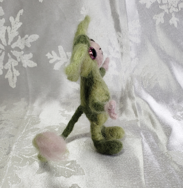 A friendly gremlin with iridescent pink eyes.  This needle felted sculpture is a mix of beautiful sage and olive green, with a light pinkish-beige face, hands, and fluffy tail.