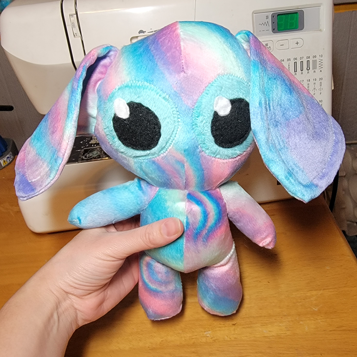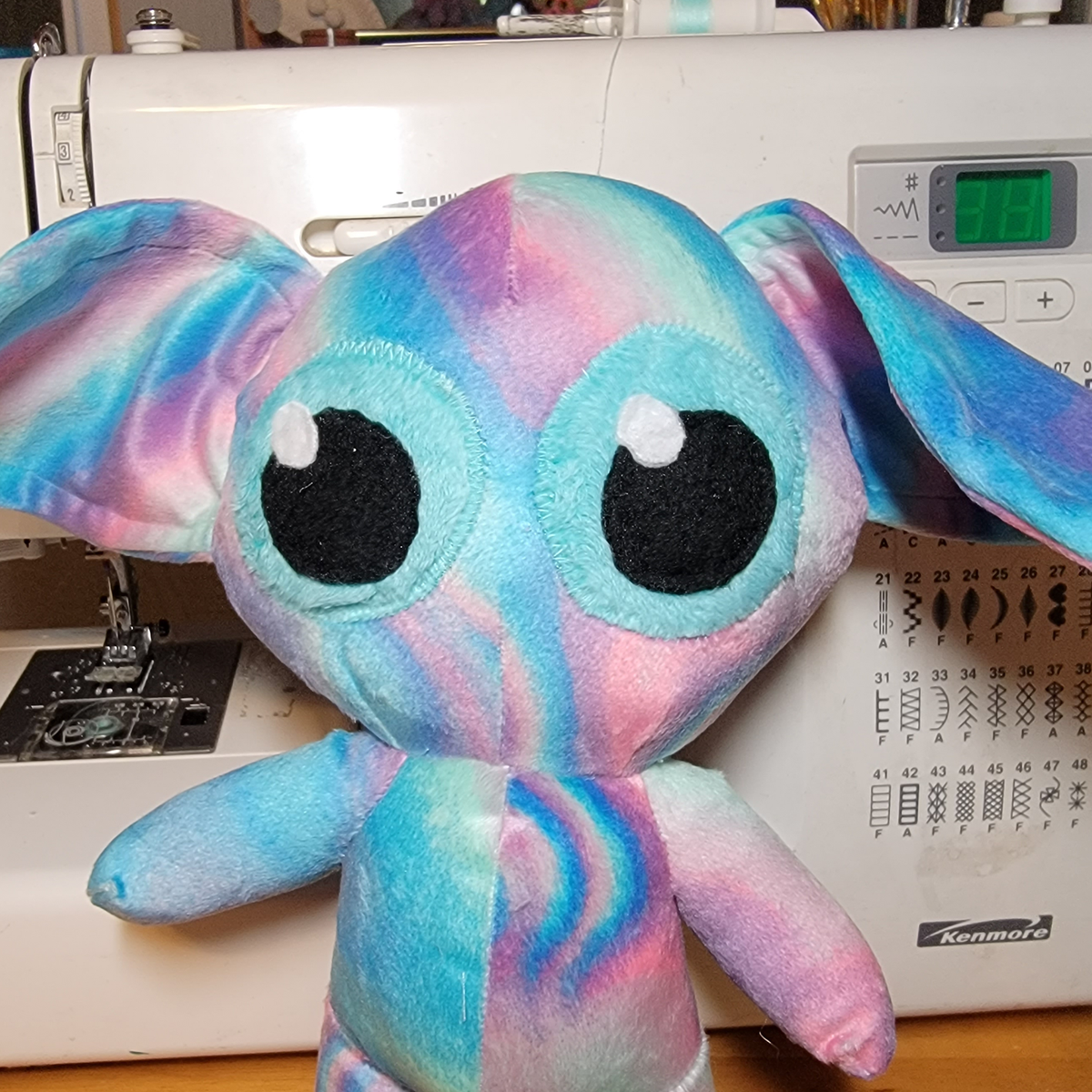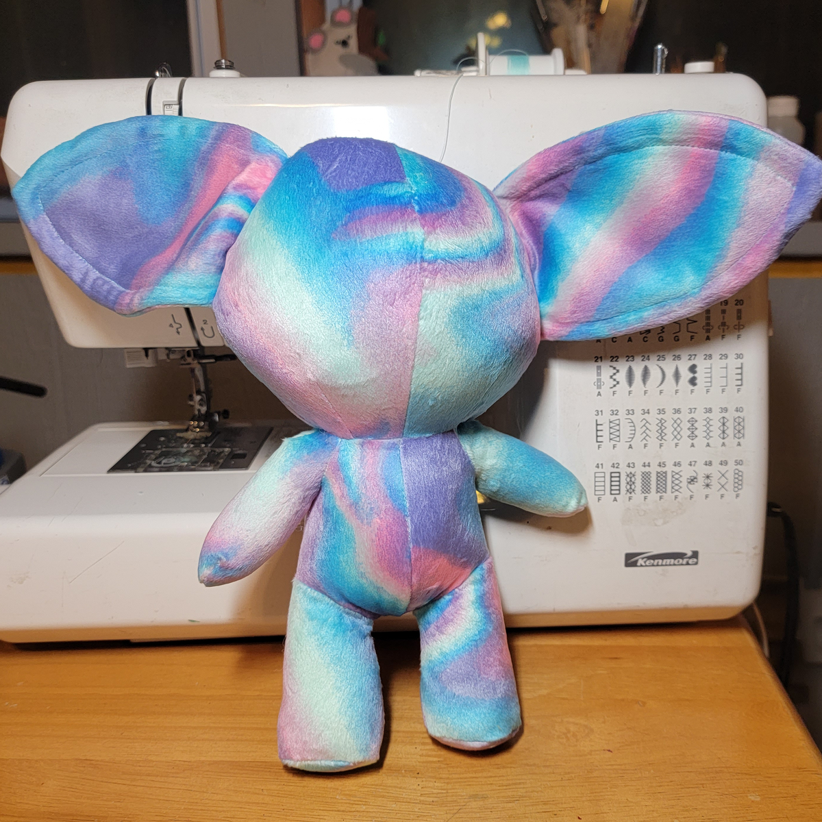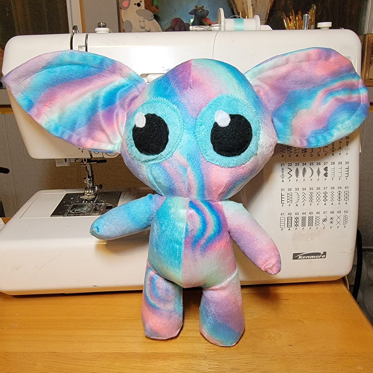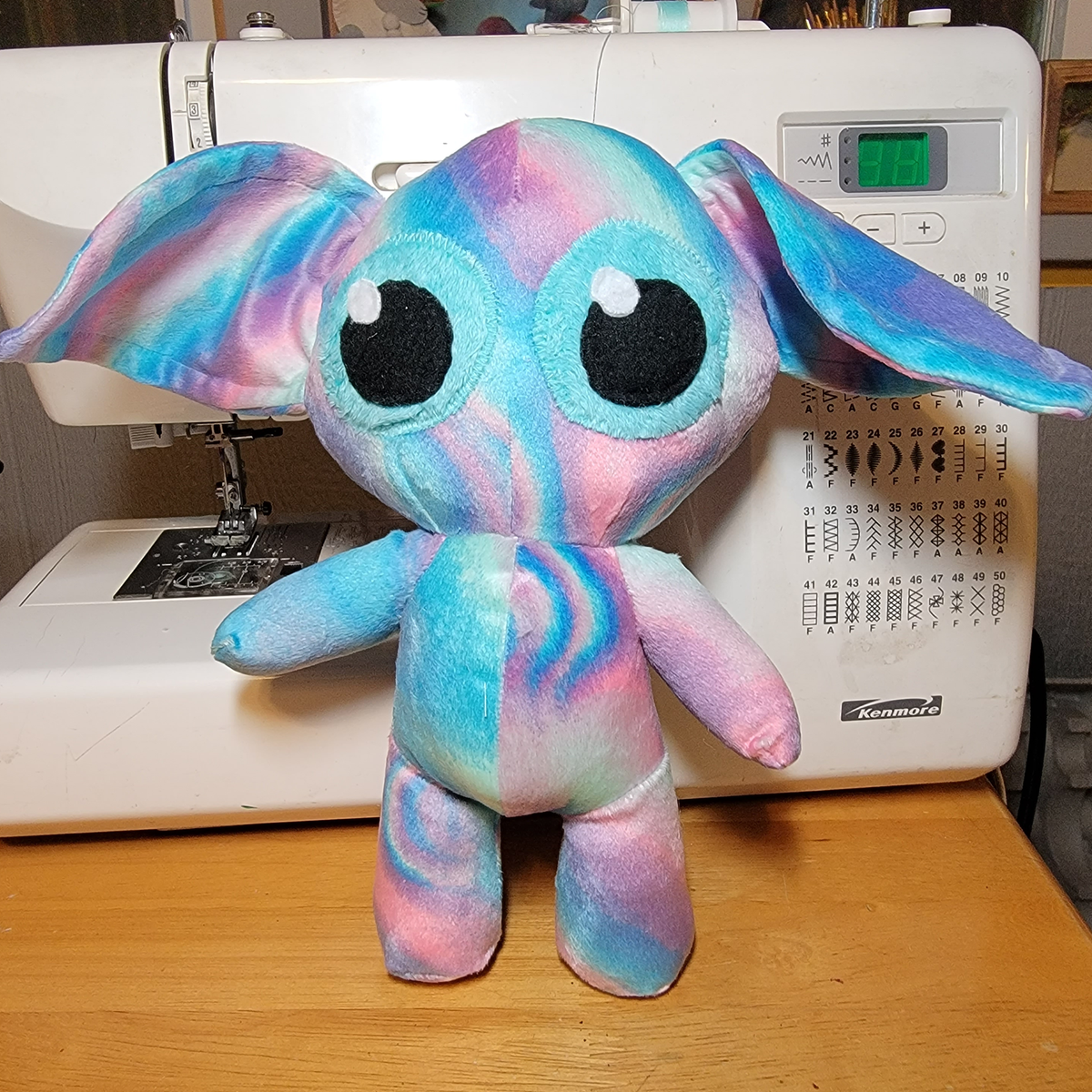 A soft, cuddly gremlin of a beautiful pastel rainbow fabric. Measures about 10 inches tall with an ear-span of about 14 inches.