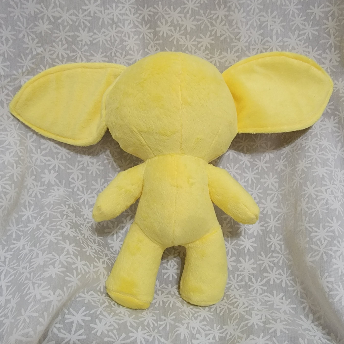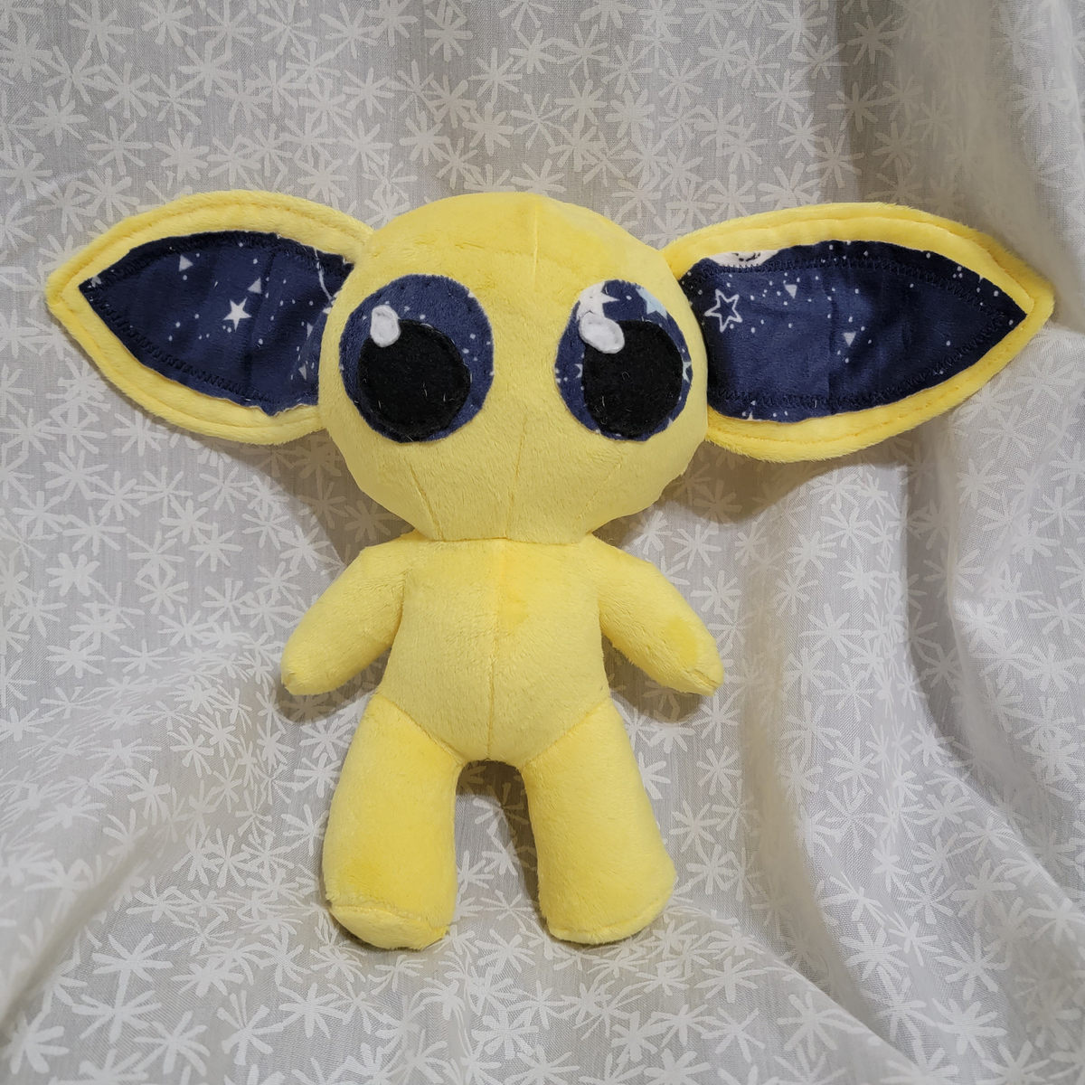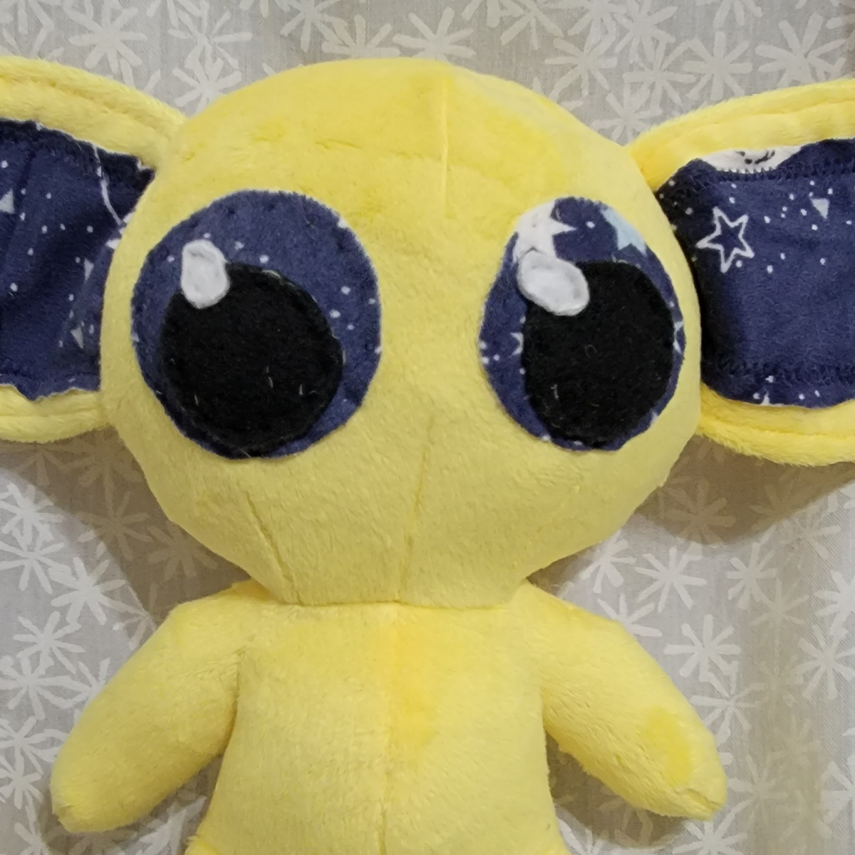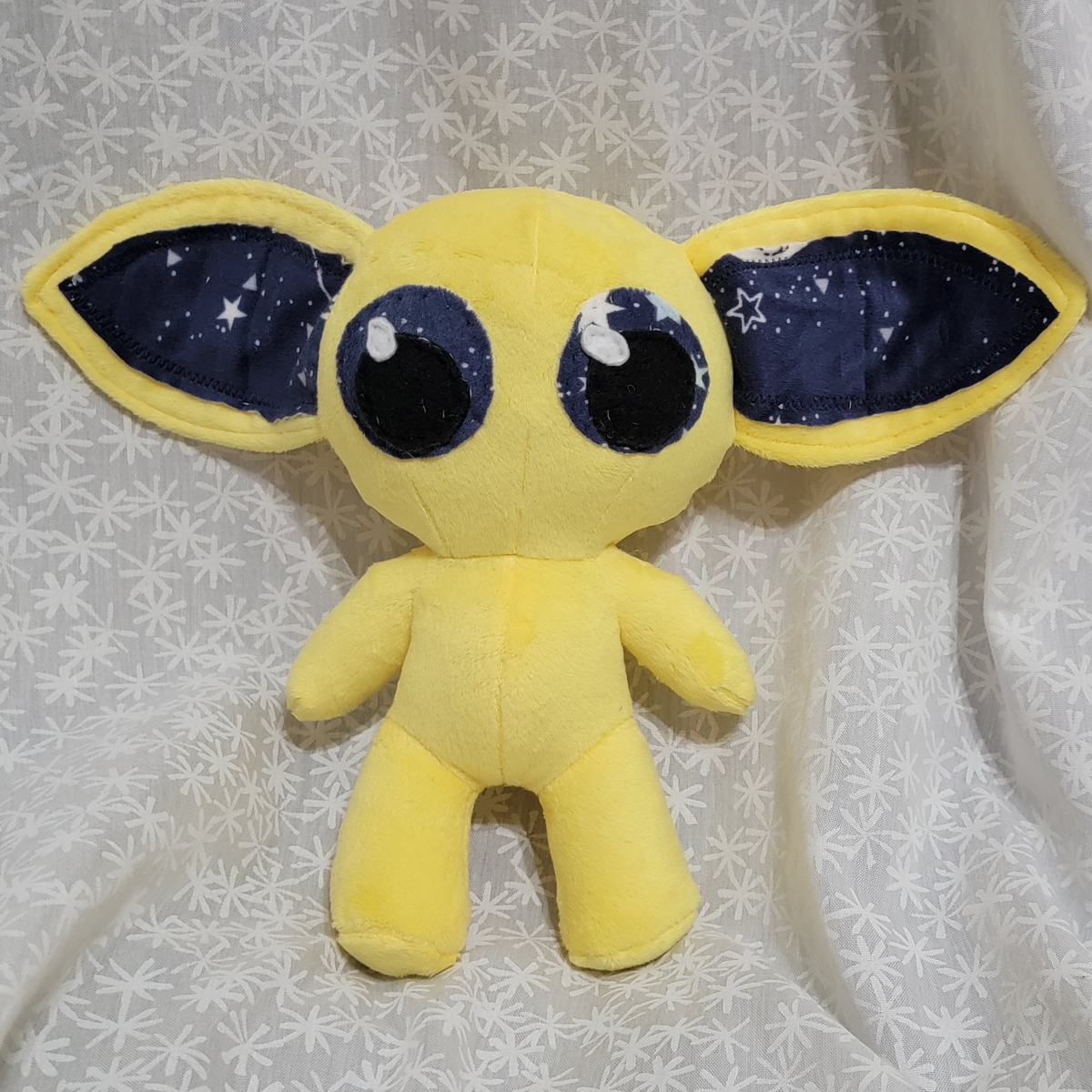 A soft, cuddly gremlin of a bright yellow fabric, with inner ears covered in moons & stars, with yellow inner ears. Measures about 10 inches tall with an ear-span of about 14 inches.