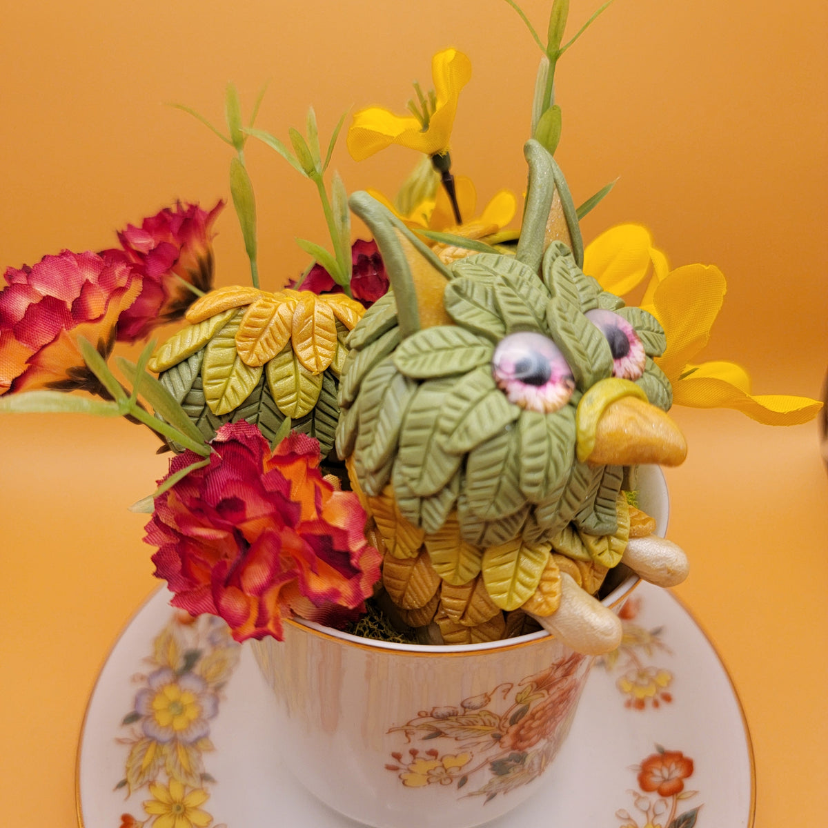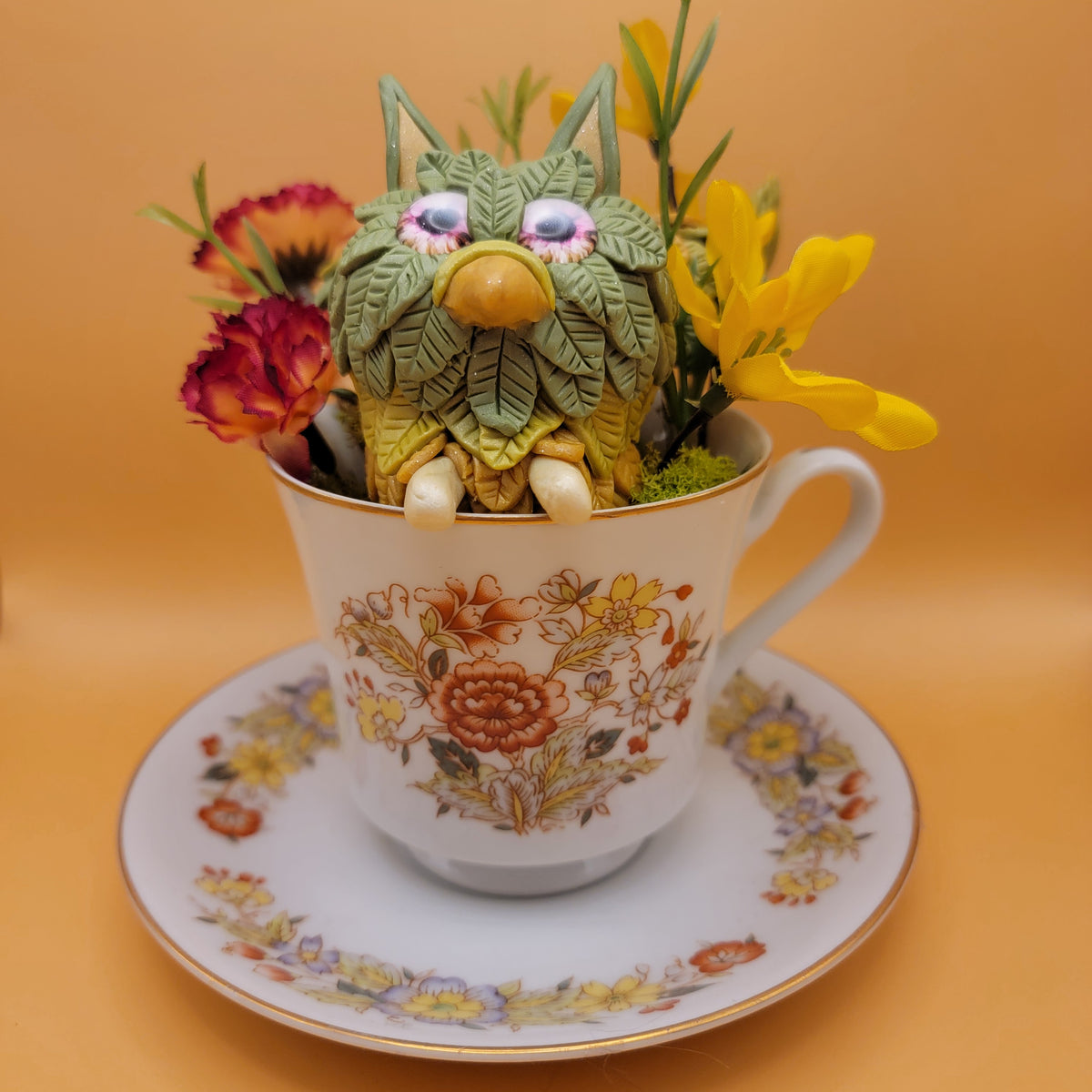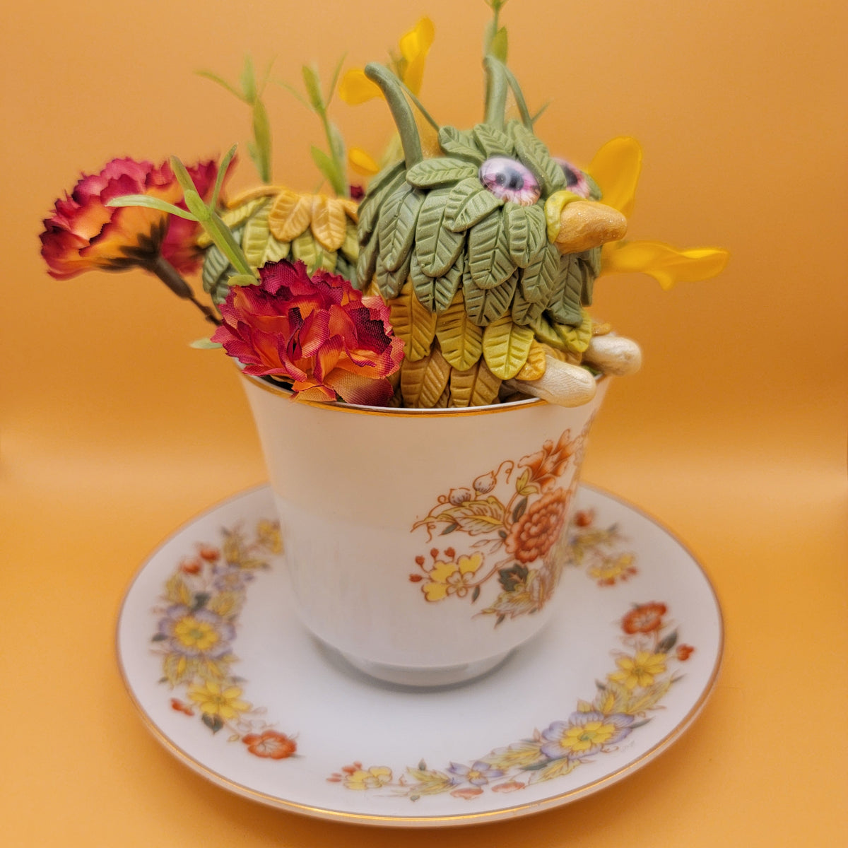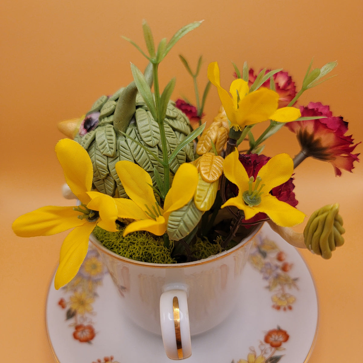 Autumn is a friendly polymer clay griffin in a teacup, surrounded by red and yellow flowers. Autumn has approximately 123 feathers, all cut and textured by hand, and is in a fun teacup with a floral design with a matching saucer.