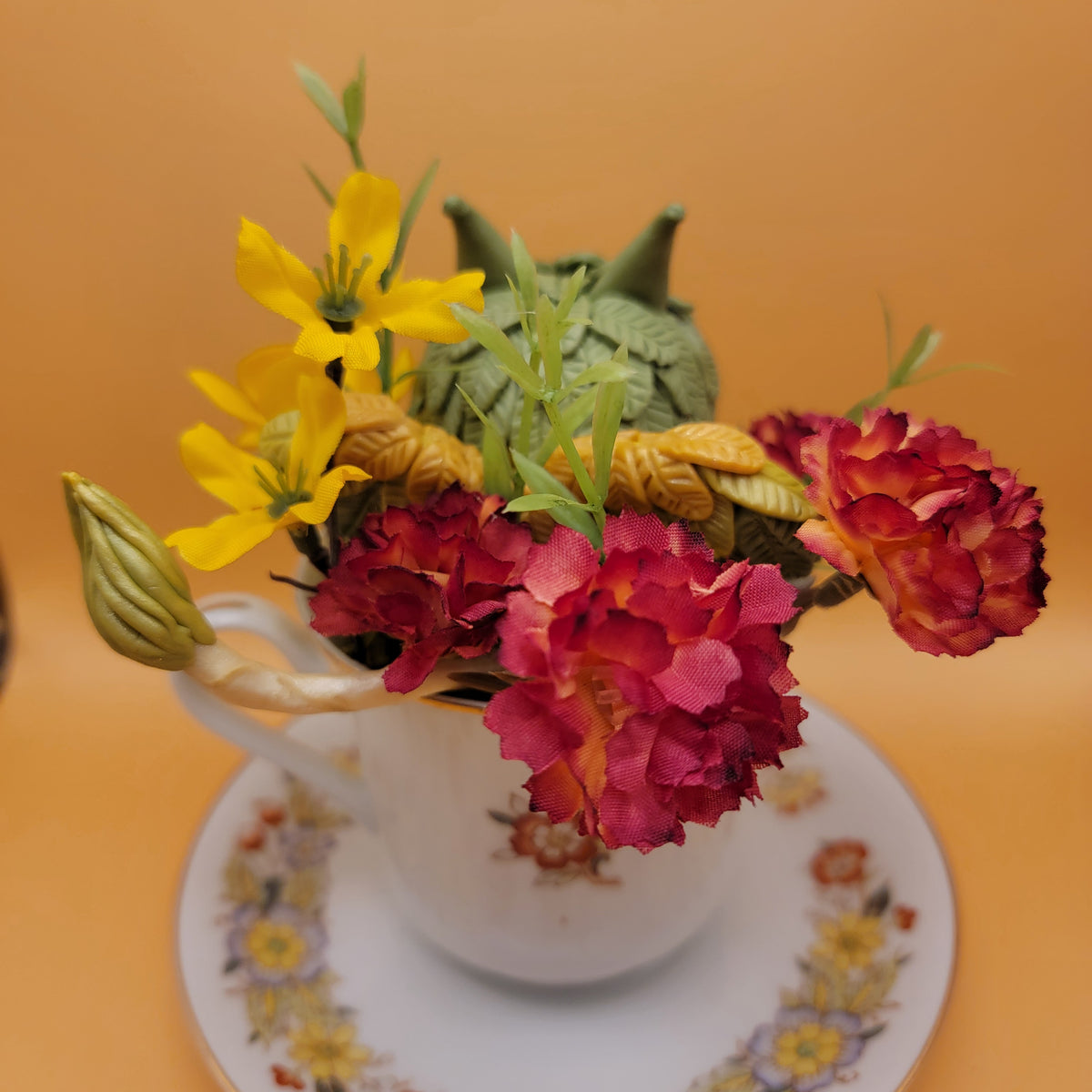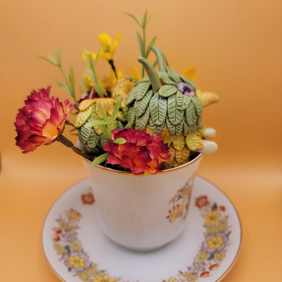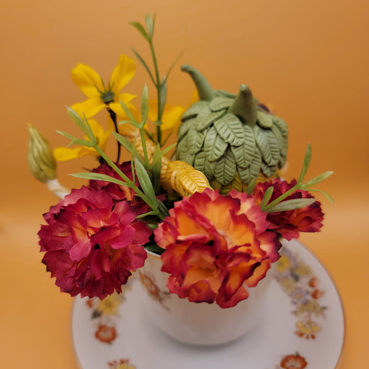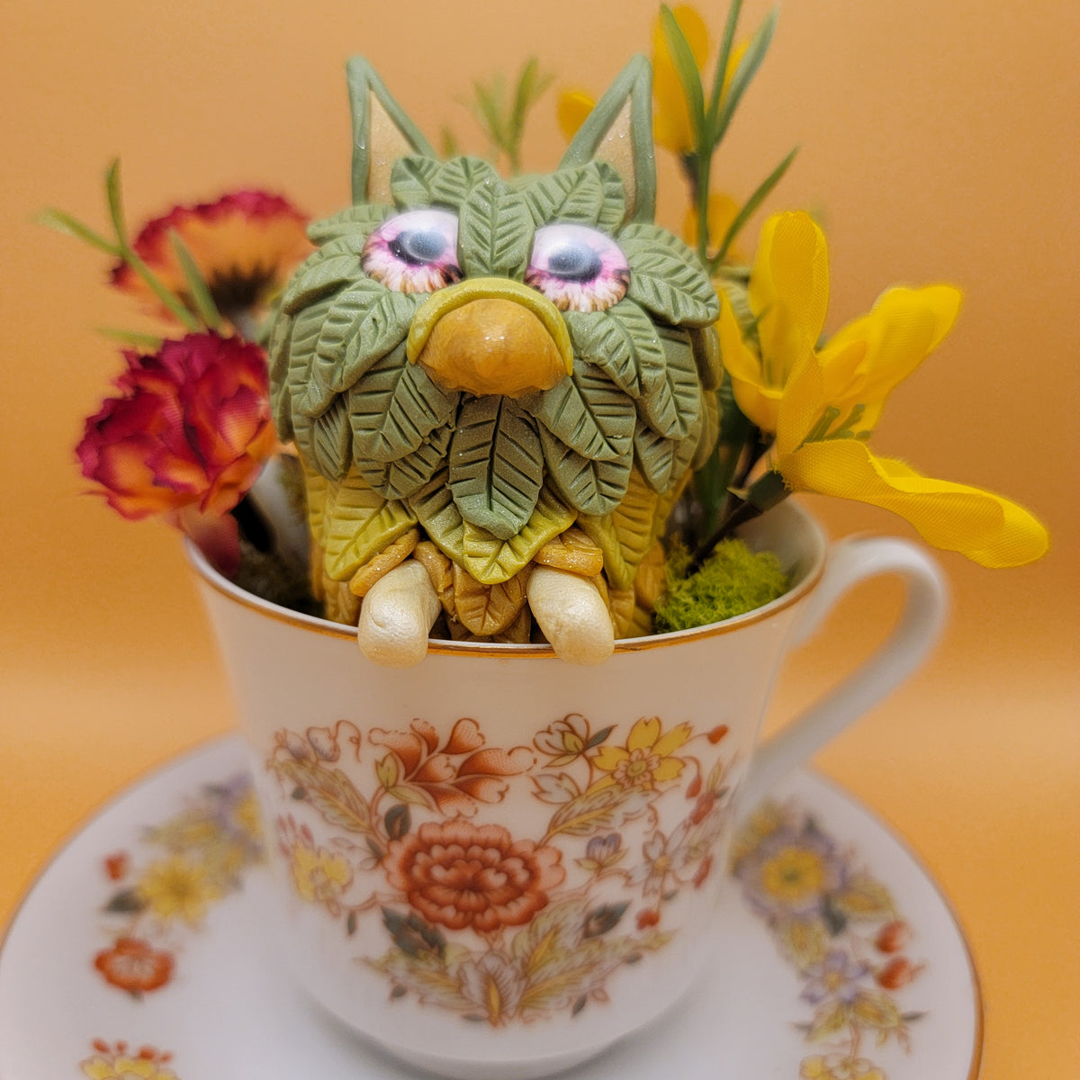 Autumn is a friendly polymer clay griffin in a teacup, surrounded by red and yellow flowers. Autumn has approximately 123 feathers, all cut and textured by hand, and is in a fun teacup with a floral design with a matching saucer.