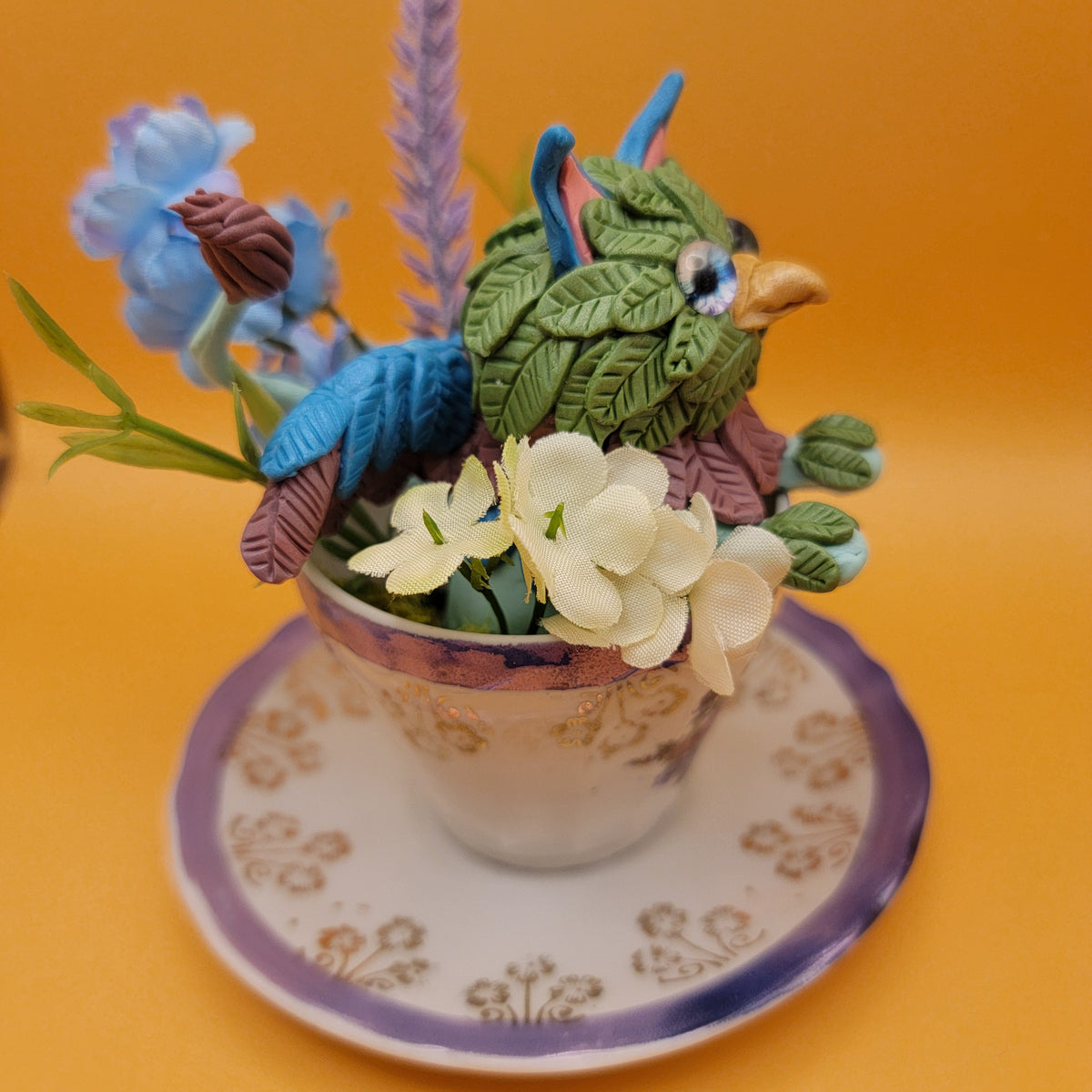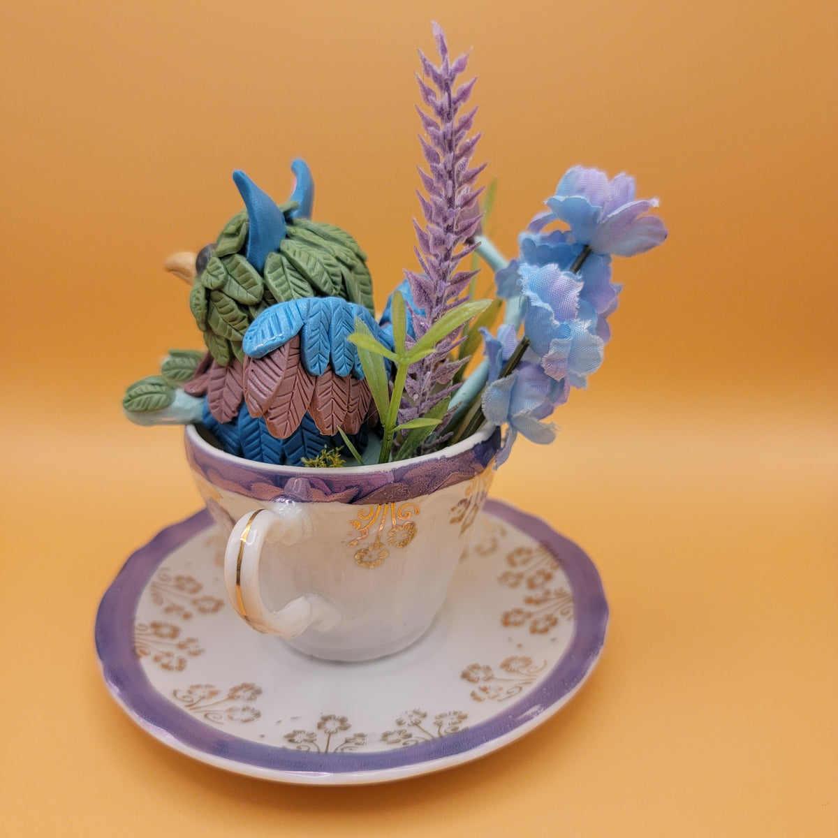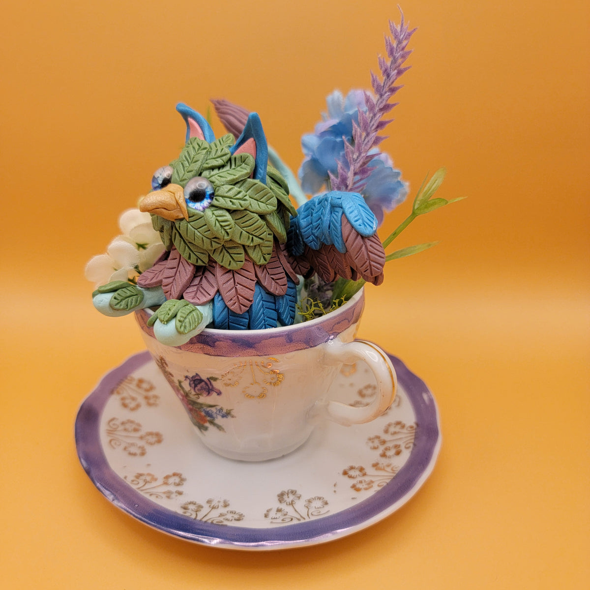 Paulie is a playful mini teacup griffin in a demitasse teacup. It is green, purple, and turquoise, surrounded by flowers. Paulie is the smallest of the griffin bunch, this little polymer clay griffin has approximately 102 feathers, each one cut and textured by hand.
