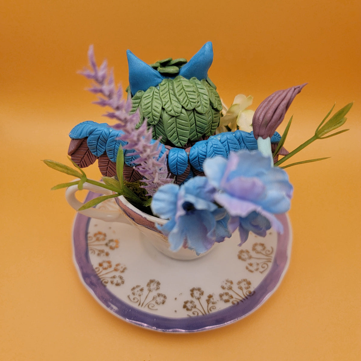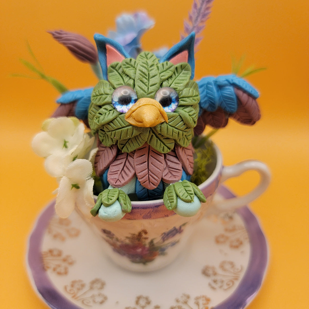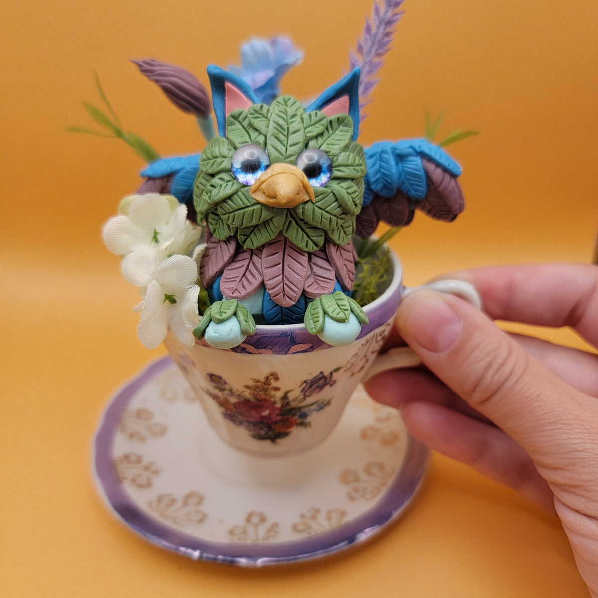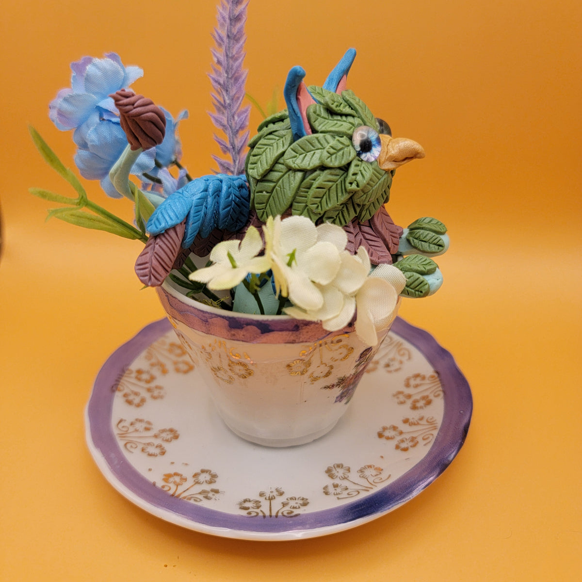 Paulie is a playful mini teacup griffin in a demitasse teacup. It is green, purple, and turquoise, surrounded by flowers. Paulie is the smallest of the griffin bunch, this little polymer clay griffin has approximately 102 feathers, each one cut and textured by hand.
