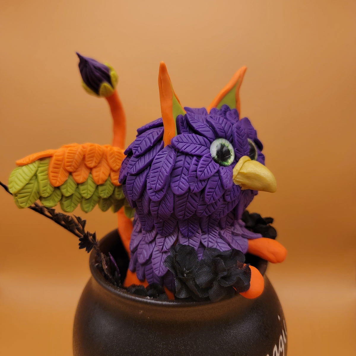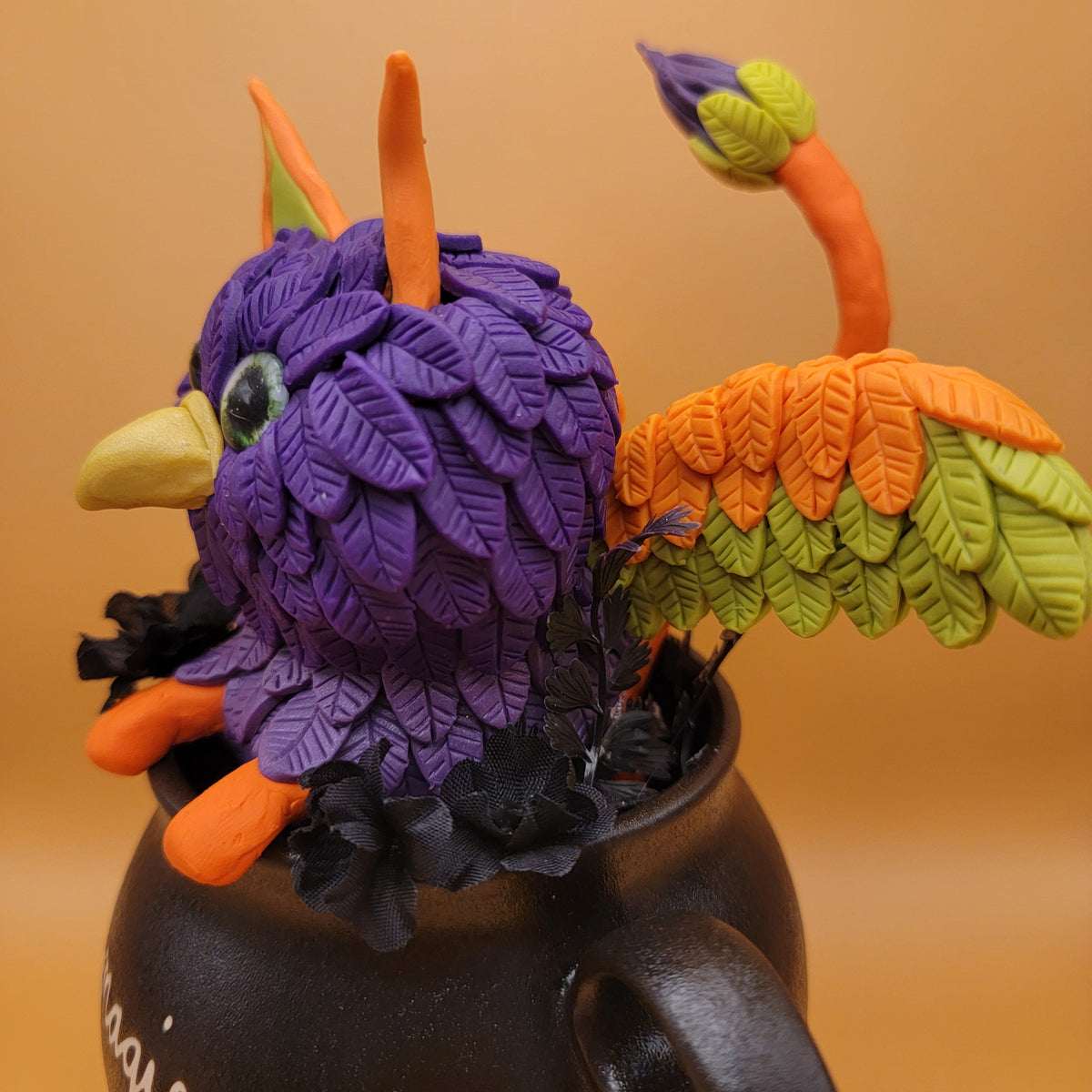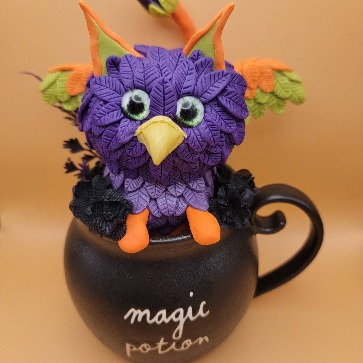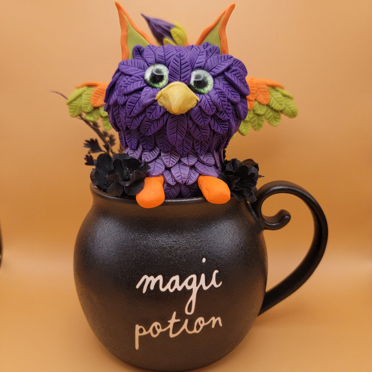 A beautiful purple, orange, and green griffin in a black cauldron-like mug that says "magic potion". This griffin has approximately 285 glowing feathers - each one cut and textured by hand. It is surrounded by a small amount of black flowers. Nightshade has a lovely glow effect - see the second photo to get a sense of the glow. Glowing photo was taken after exposure to black light.