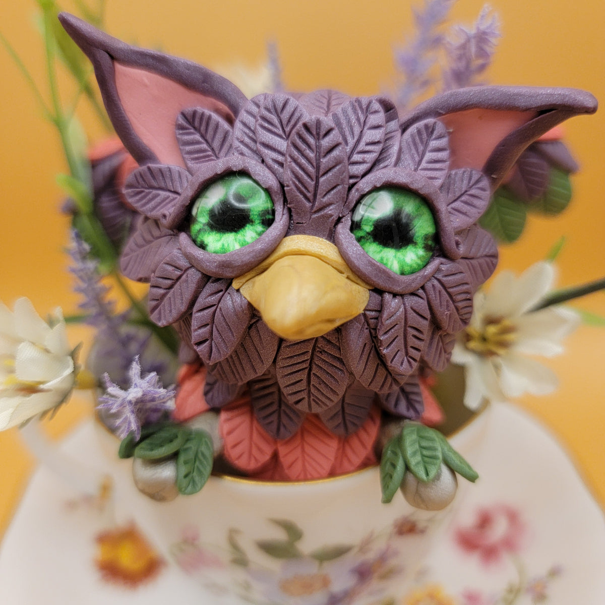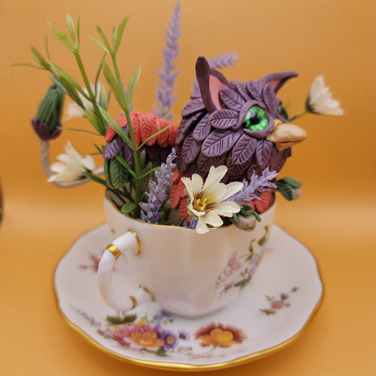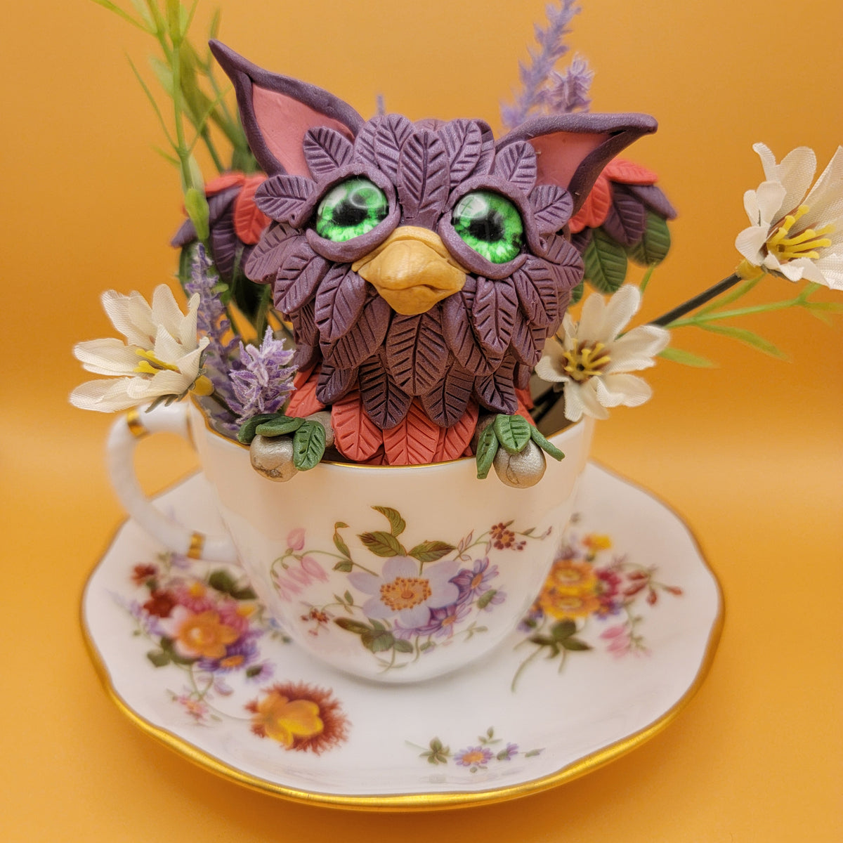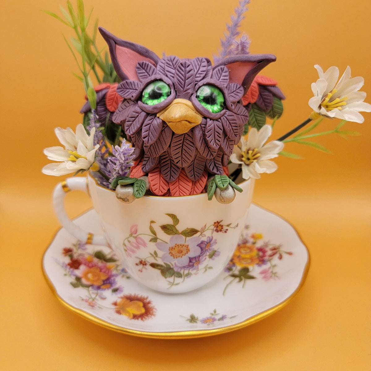 Petunia is a polymer clay griffin in a teacup, surrounded by white and purple flowers. Petunia has approximately 174 beautiful purple, pink, and green feathers - all cut and textured by hand. Petunia's teacup has a bright and cheerful floral design, and has a matching saucer.