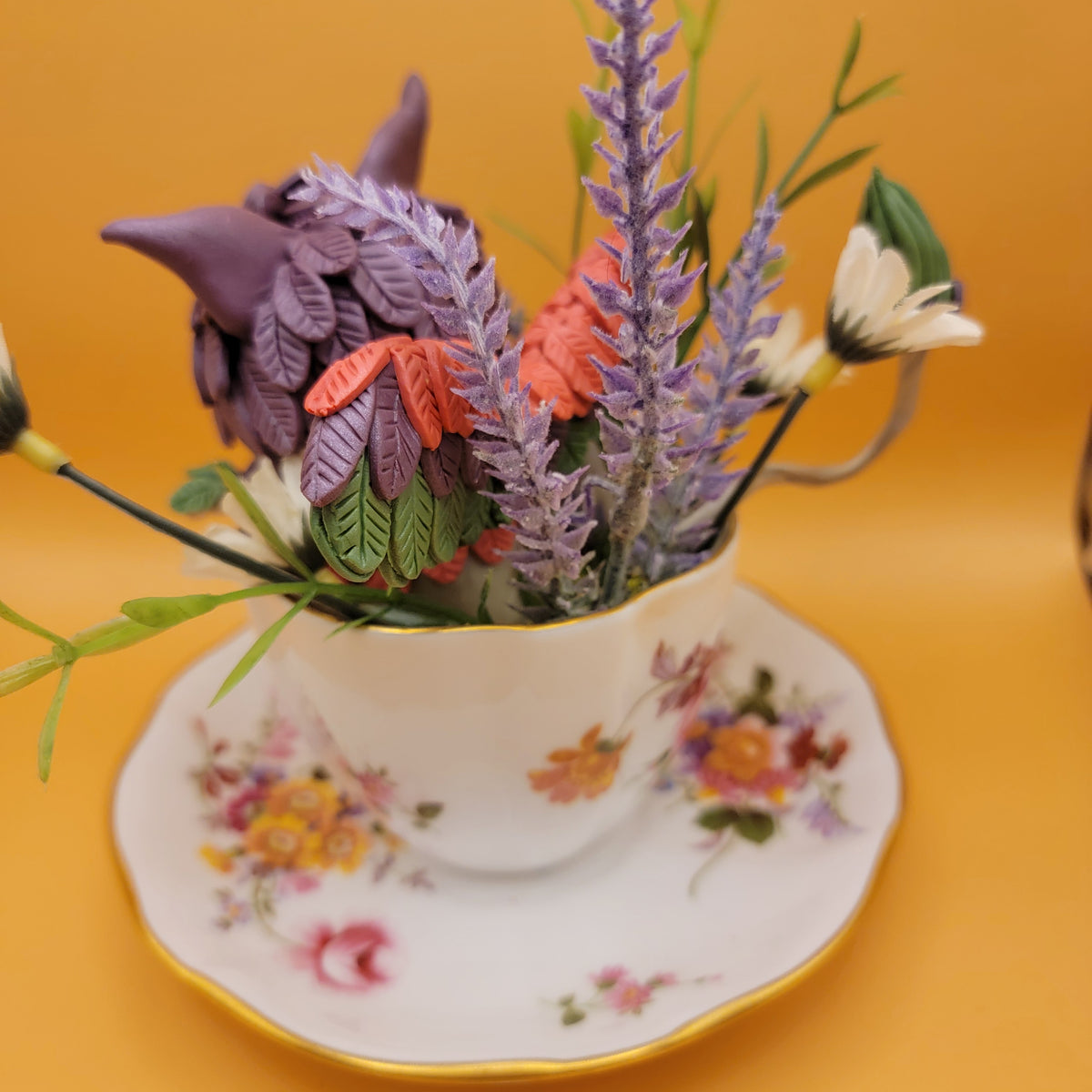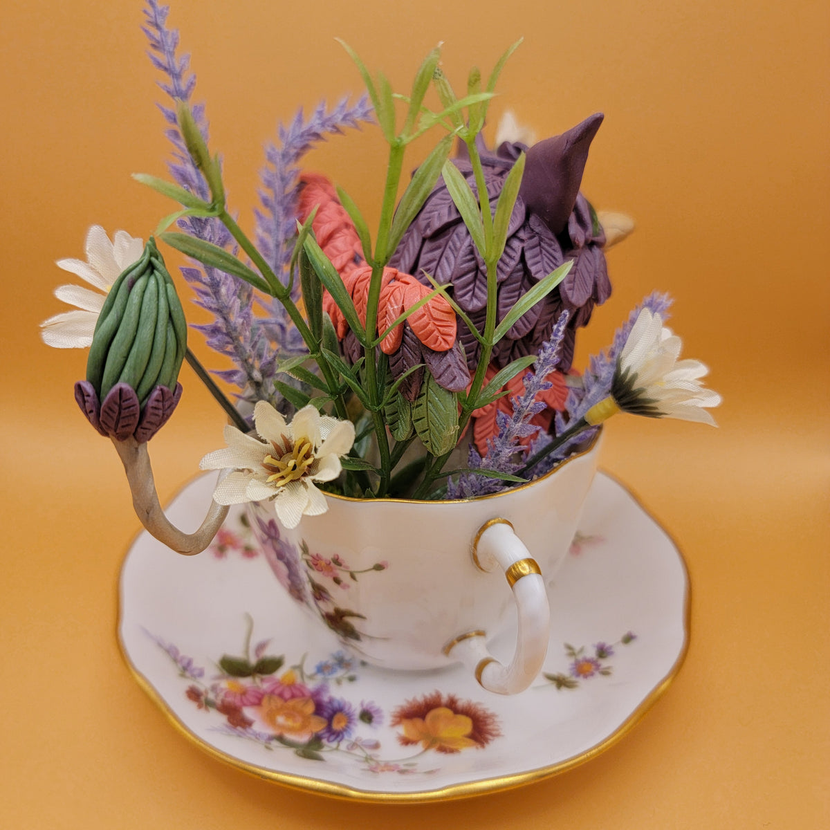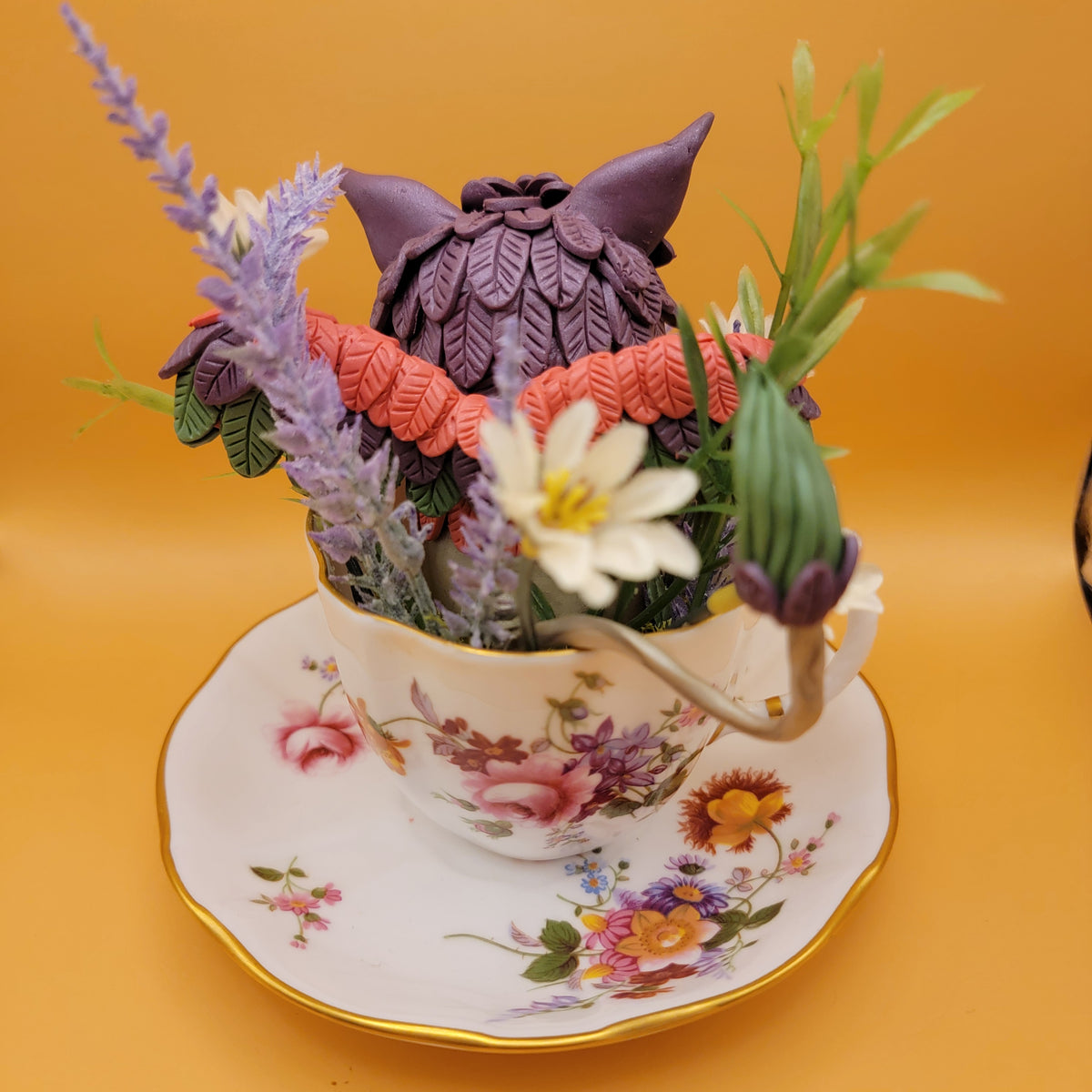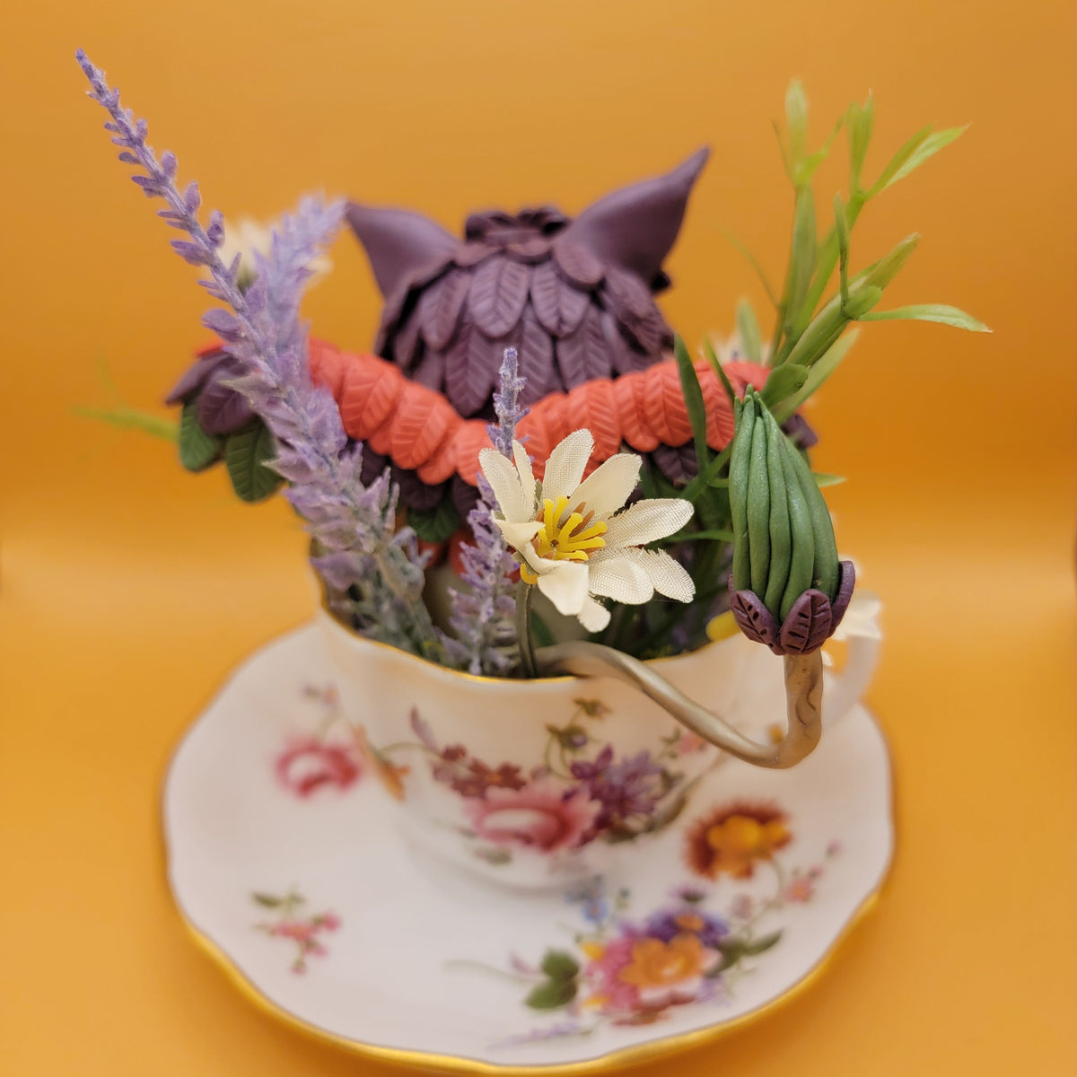Petunia is a polymer clay griffin in a teacup, surrounded by white and purple flowers. Petunia has approximately 174 beautiful purple, pink, and green feathers - all cut and textured by hand. Petunia's teacup has a bright and cheerful floral design, and has a matching saucer.