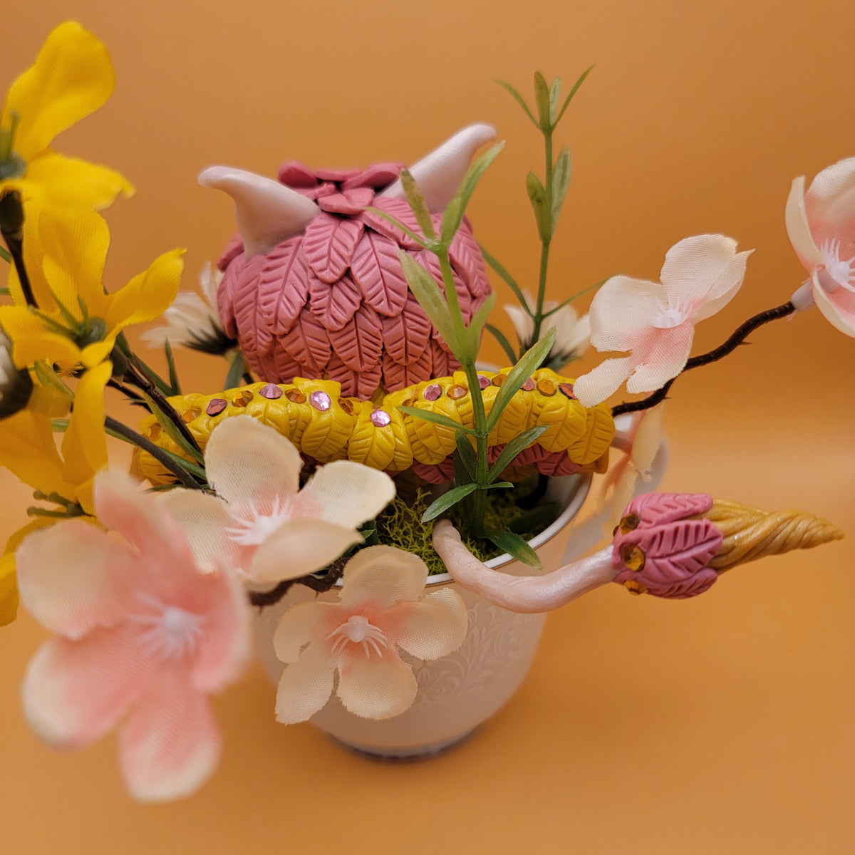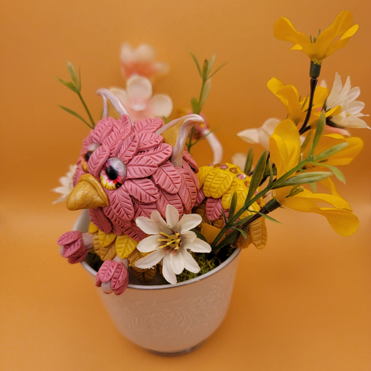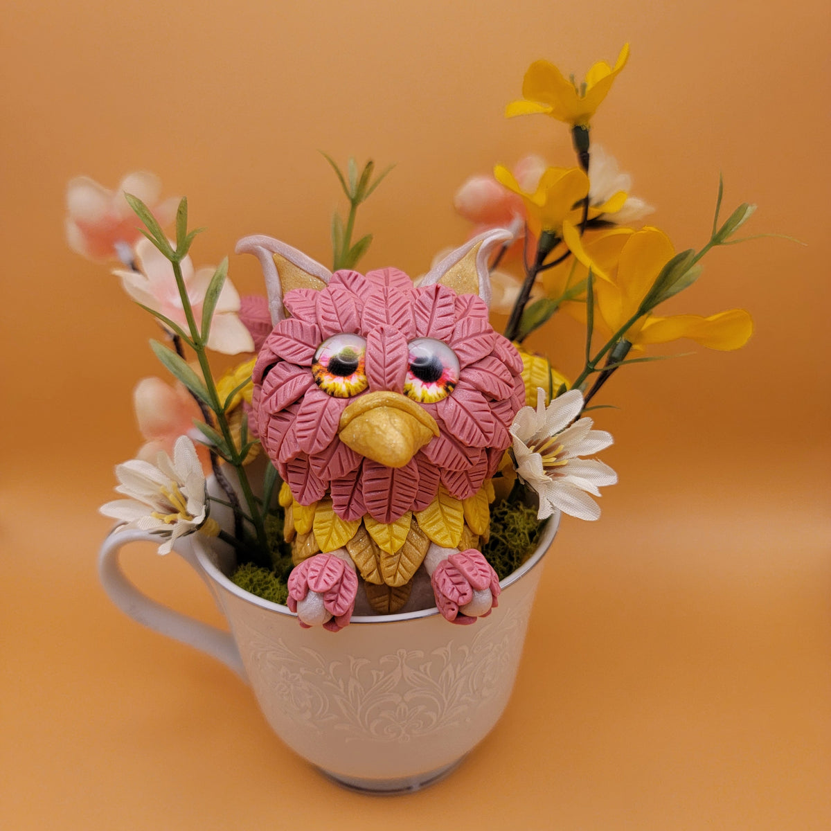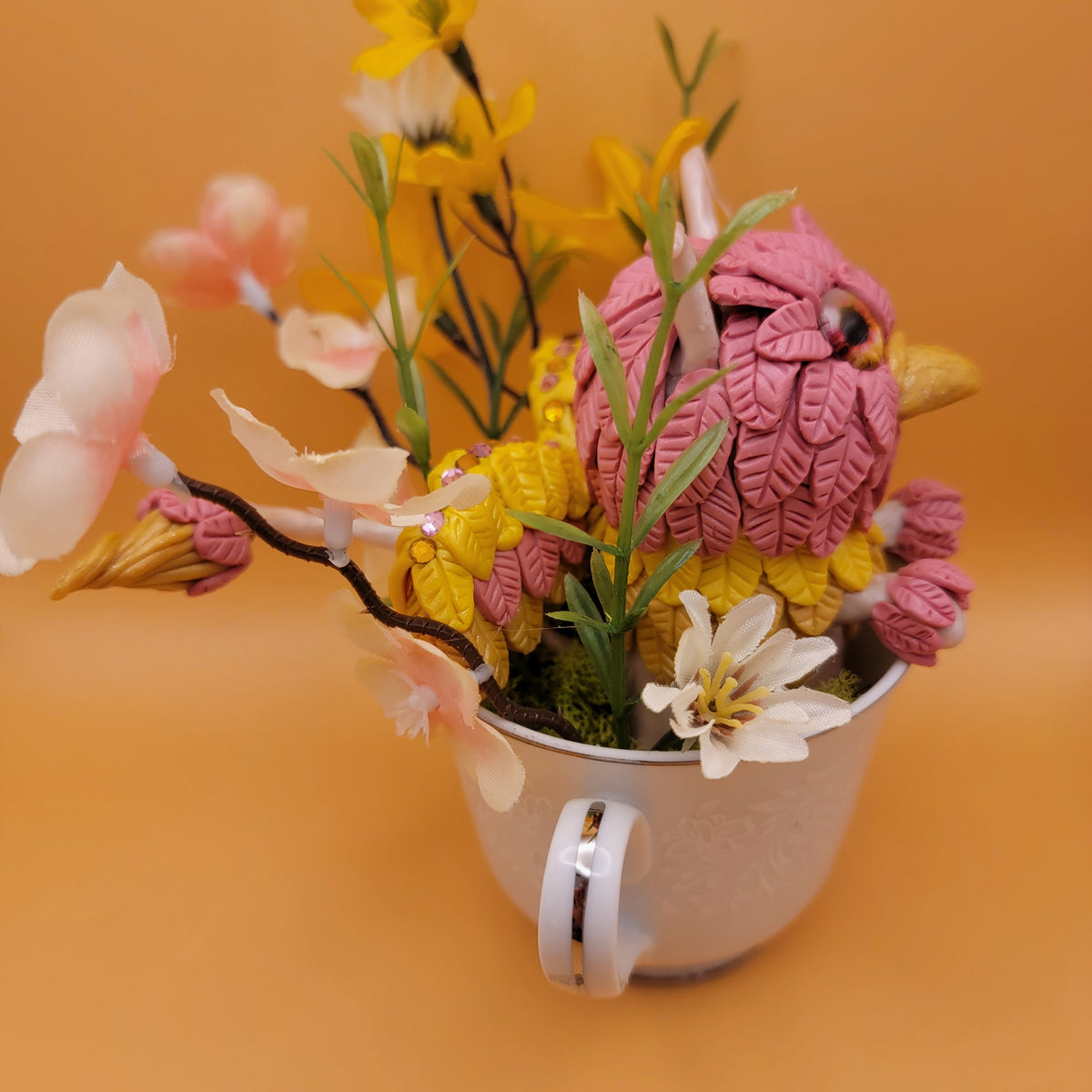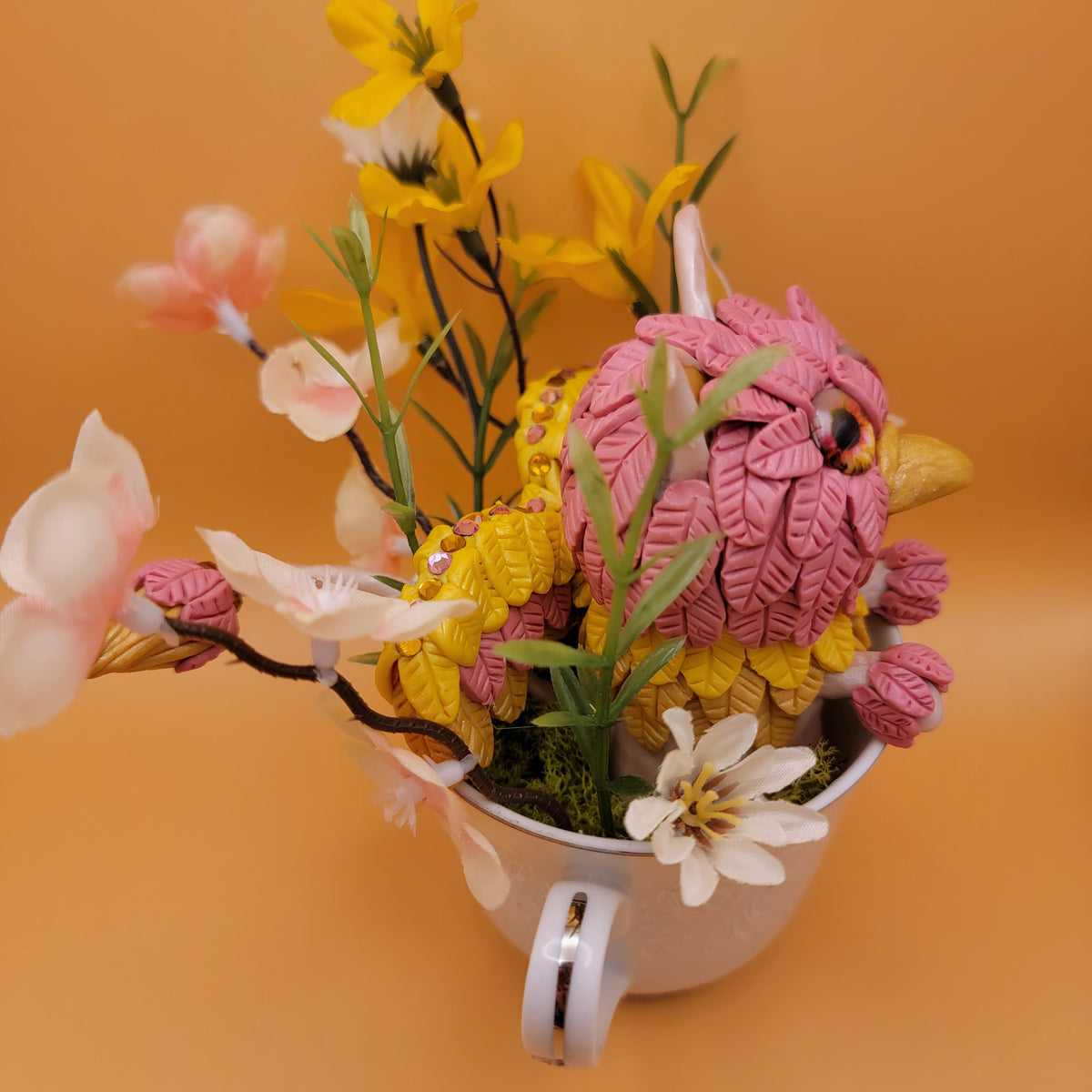 Pip is a cheerful polymer clay griffin in a teacup, surrounded by white and yellow flowers. Pip has approximately 183 pink, yellow, and gold feathers, all cut and textured by hand. Pip's wings are accented by rhinestones, for a bit of extra sparkle. Pip sits in a patterned white teacup, and has no saucer.