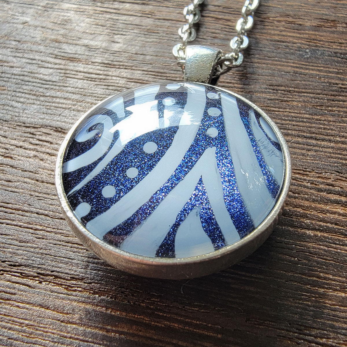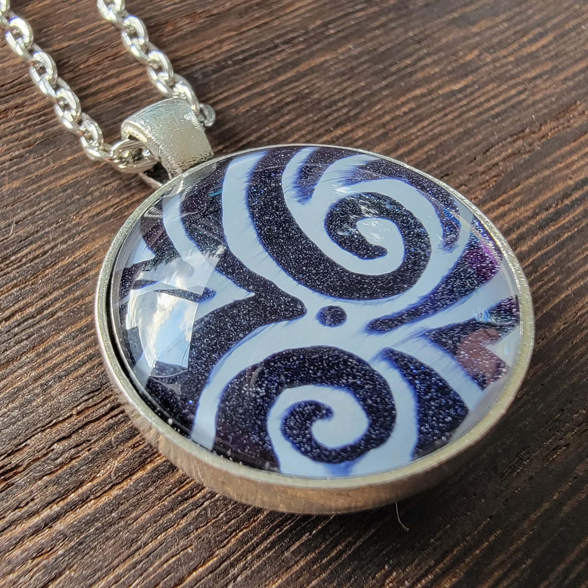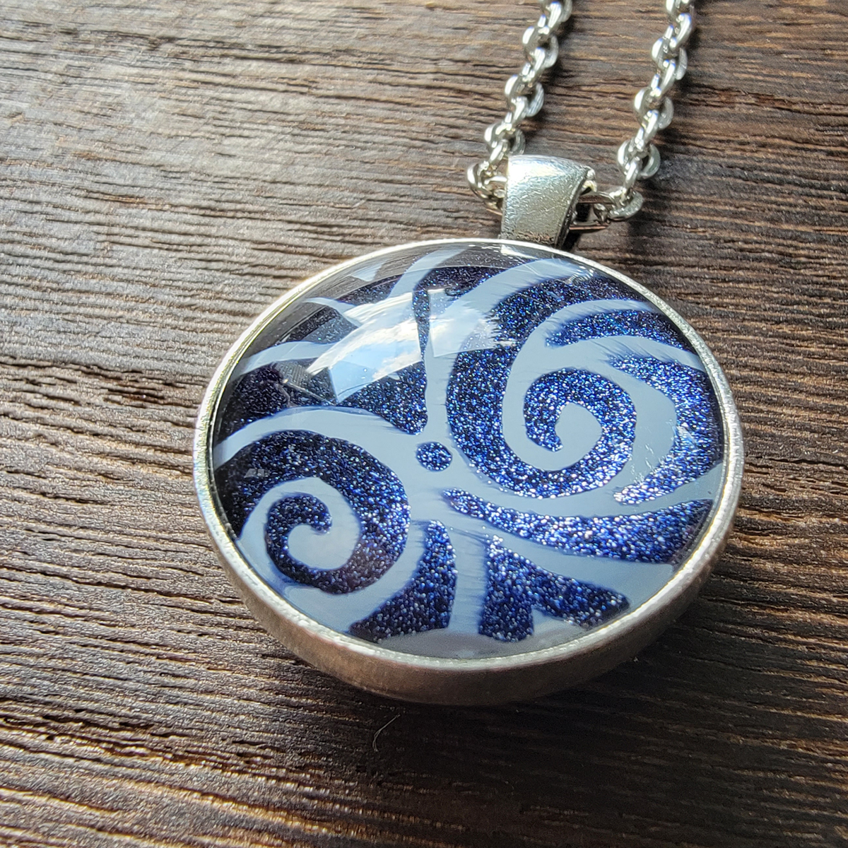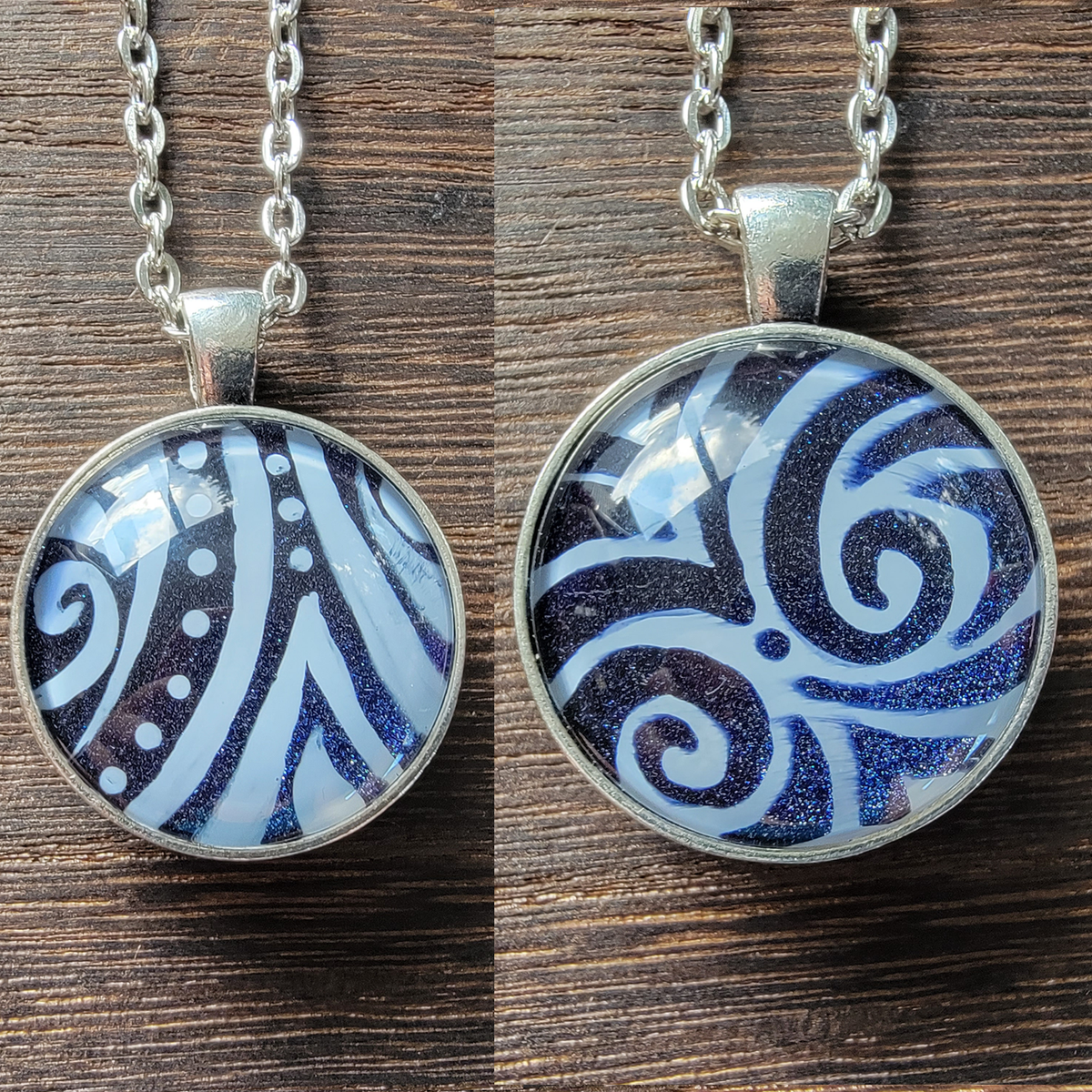 A unique necklace with two hand-painted cabochons. One side has a light blue swirls against a navy shimmering background, the other has navy shimmer swirls against a light blue background. Set in a silver toned setting, and comes on a matching 24 inch chain. Cabochon measures 25mm.