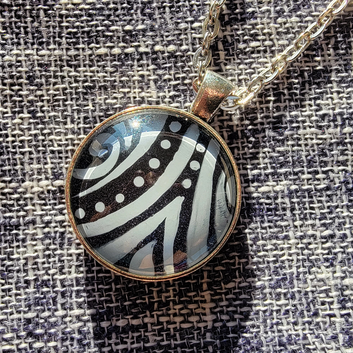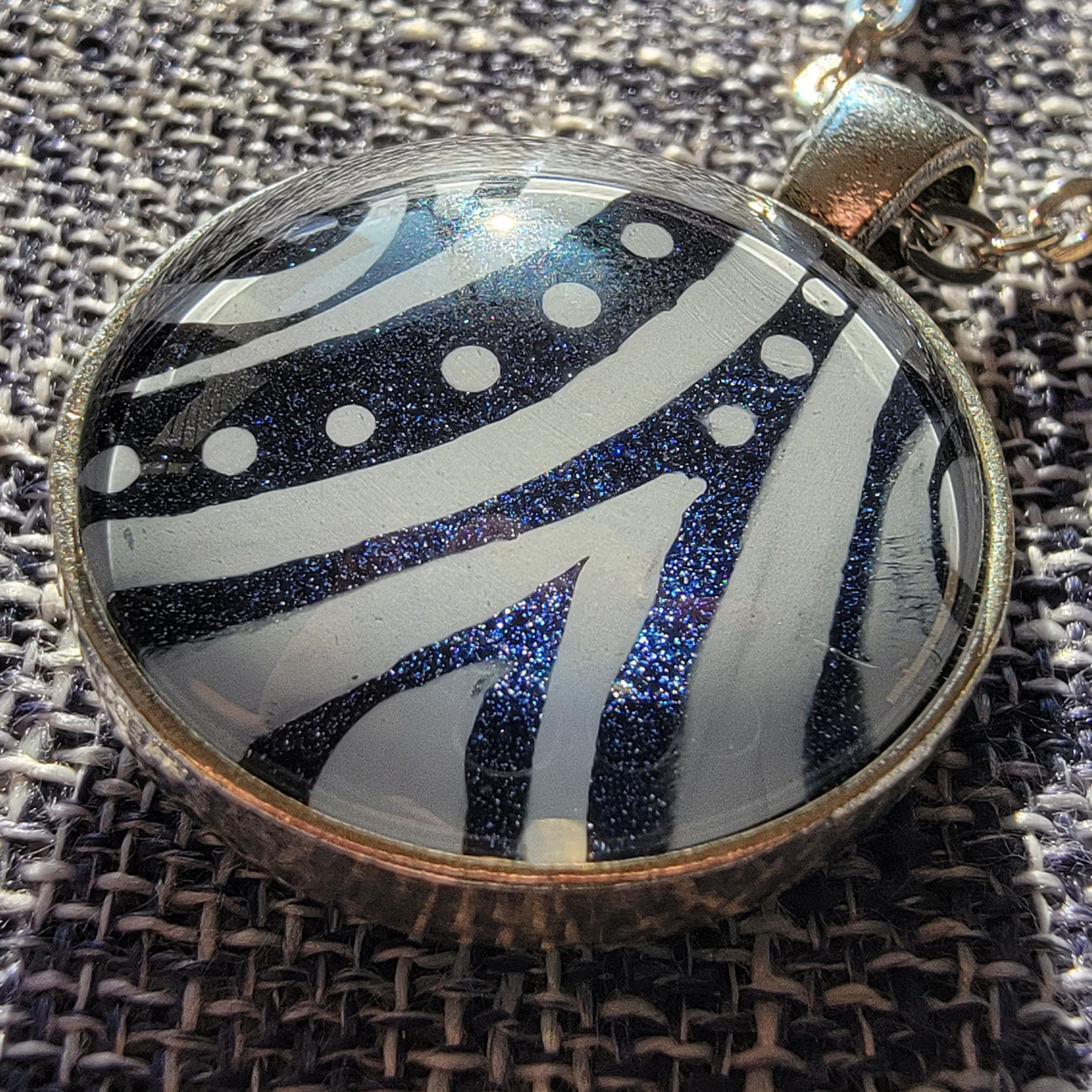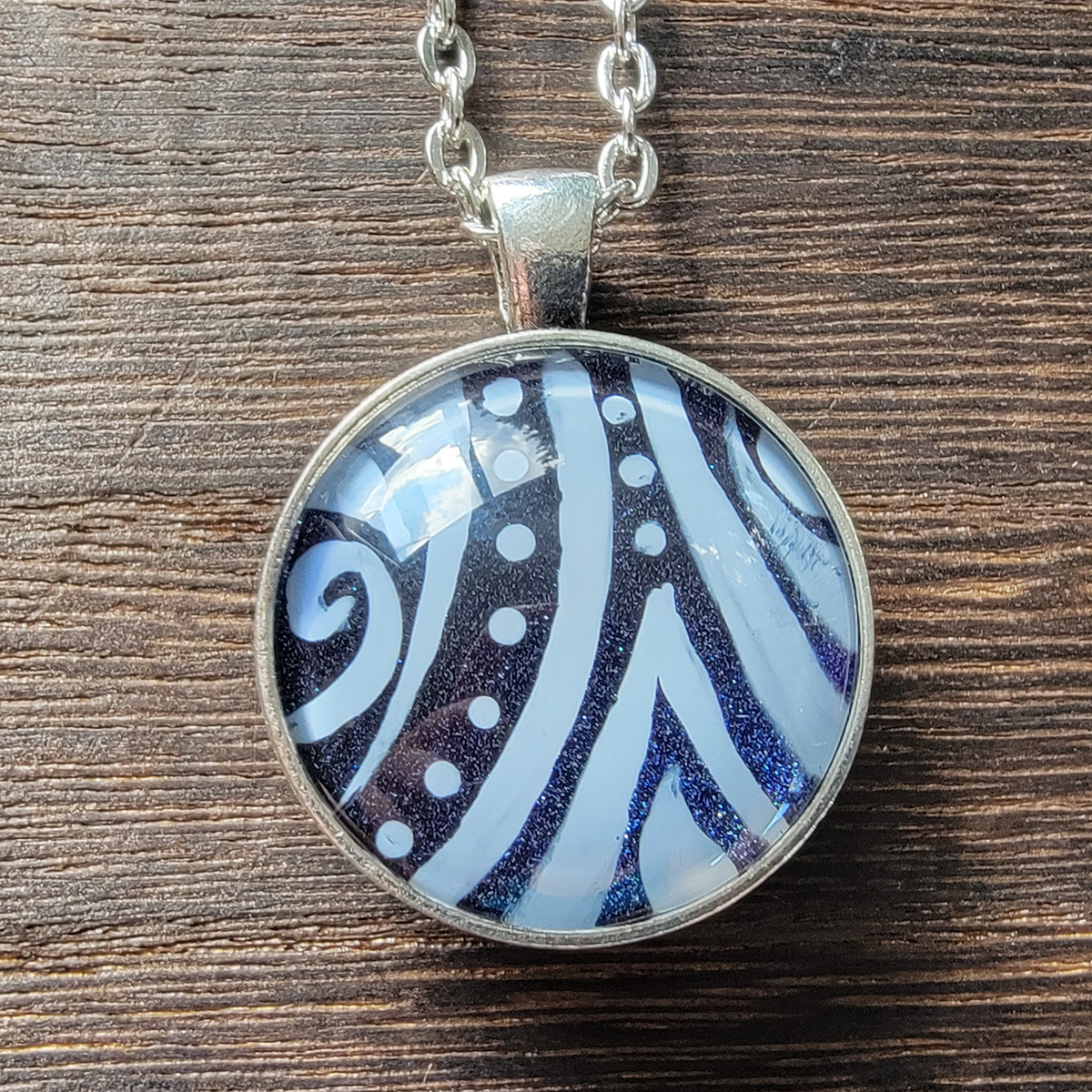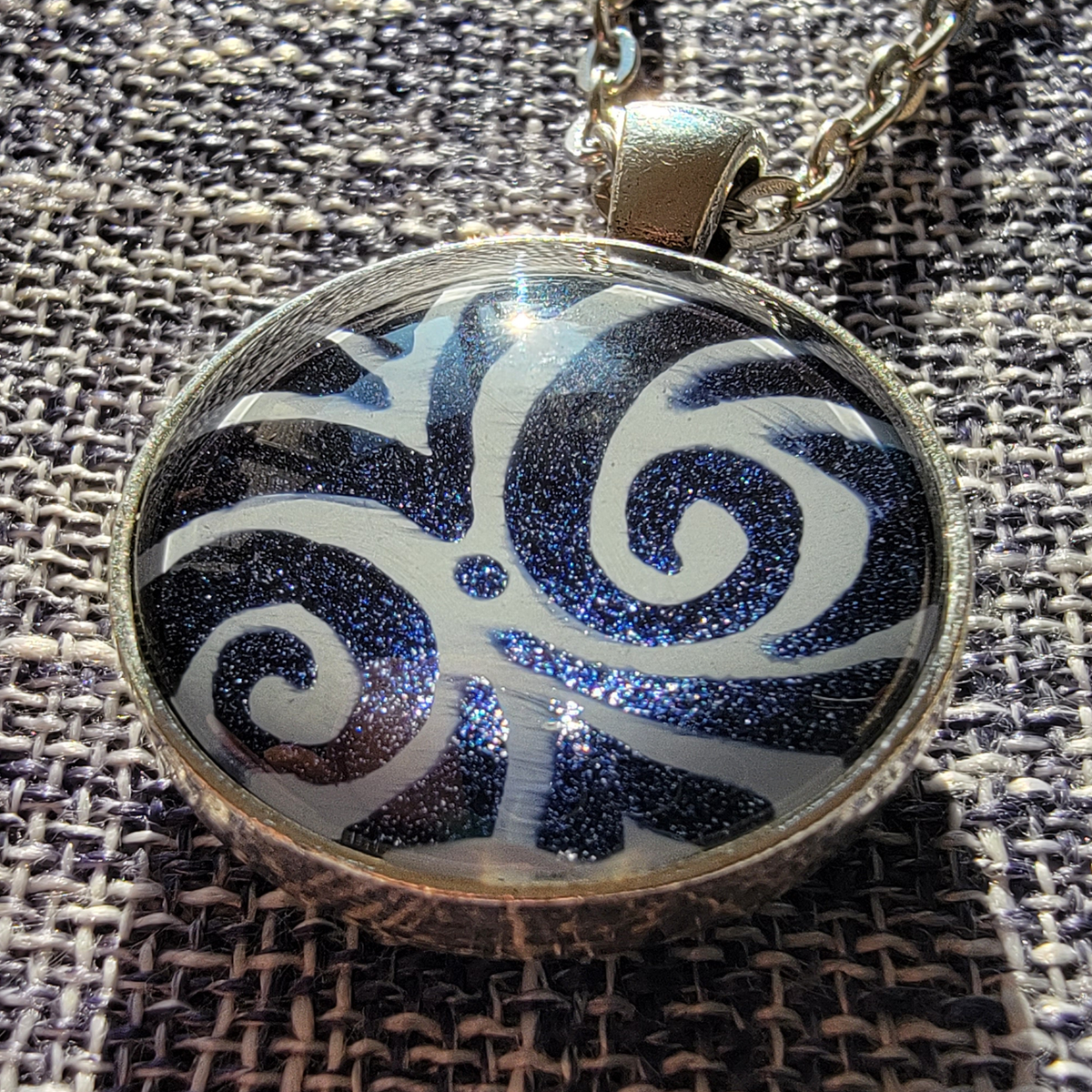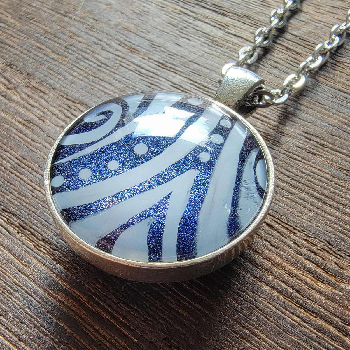 A unique necklace with two hand-painted cabochons. One side has a light blue swirls against a navy shimmering background, the other has navy shimmer swirls against a light blue background. Set in a silver toned setting, and comes on a matching 24 inch chain. Cabochon measures 25mm.