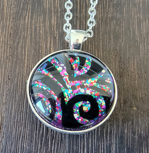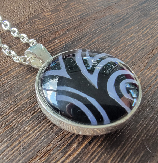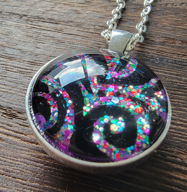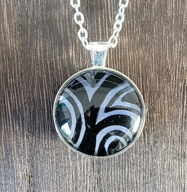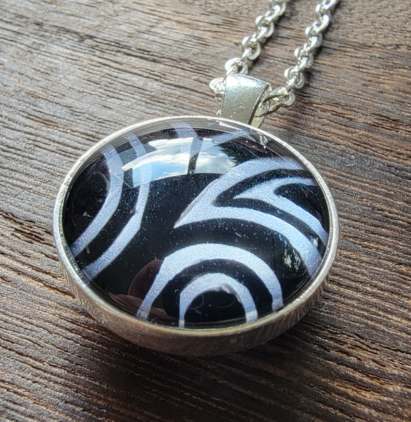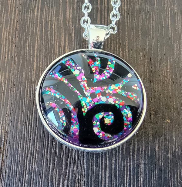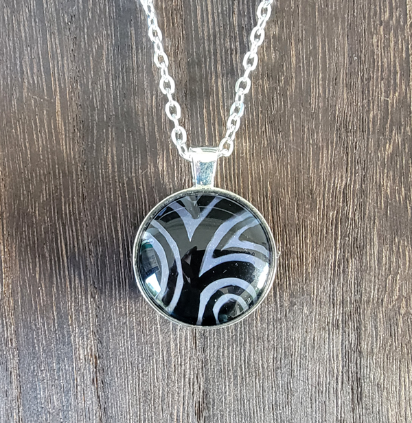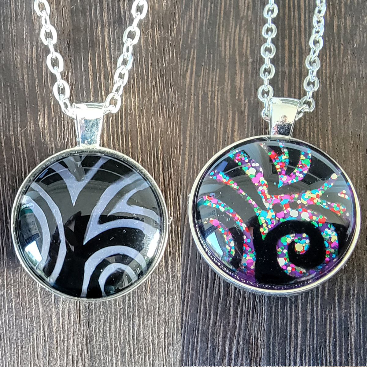 A unique necklace with two hand-painted cabochons. One side has black swirls set against a silvery-lavender, and the other side has black swirls against a riot of glitter. Set in a silver toned setting, and comes on a matching 24 inch chain. Cabochon measures 25mm.