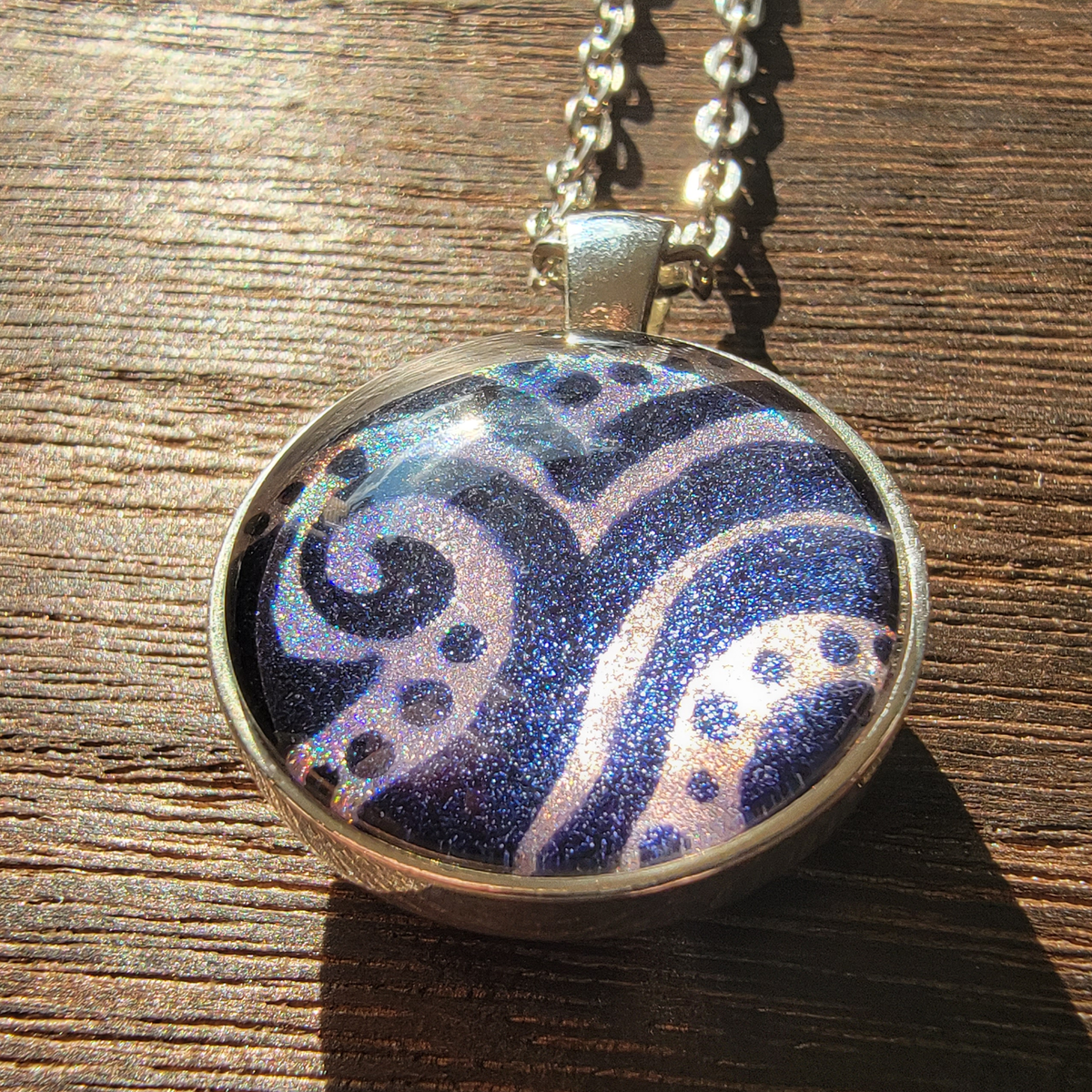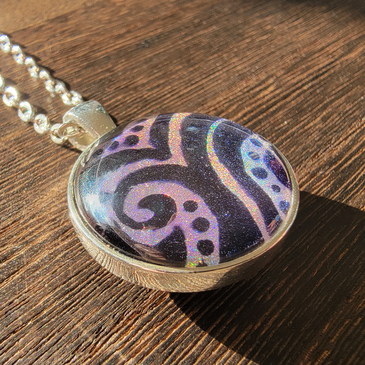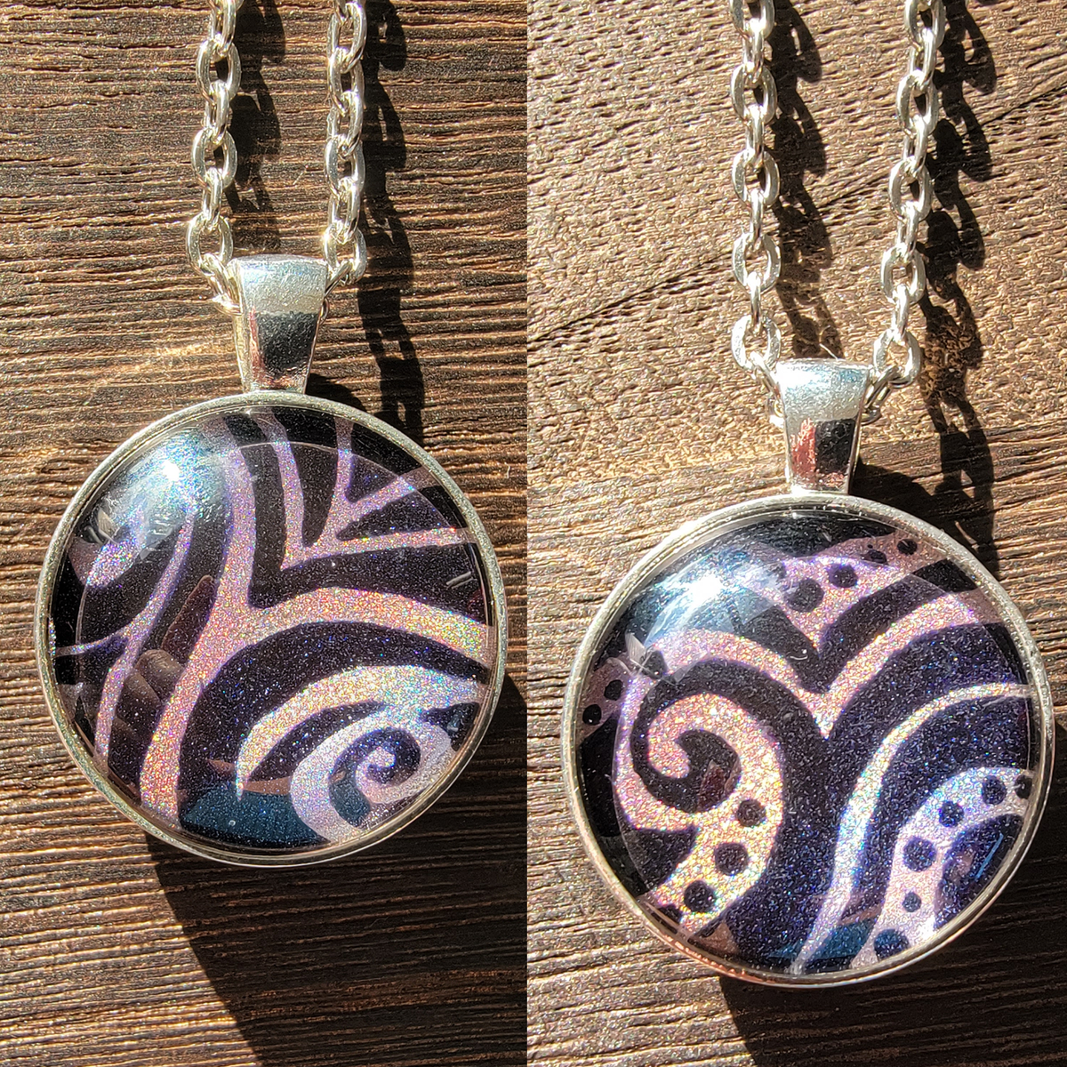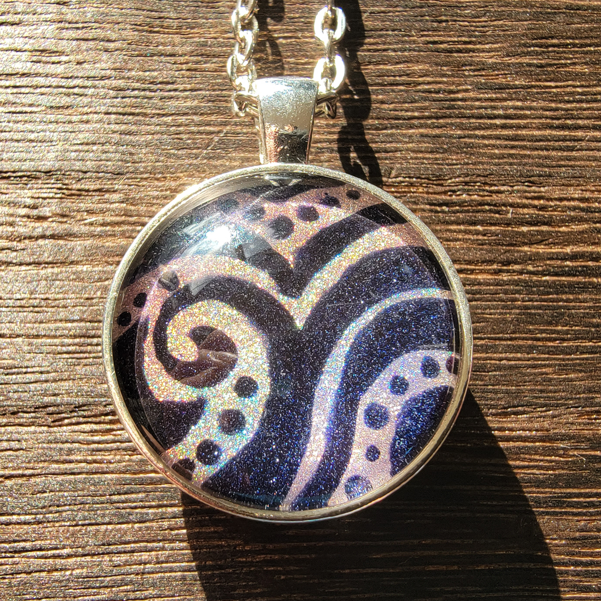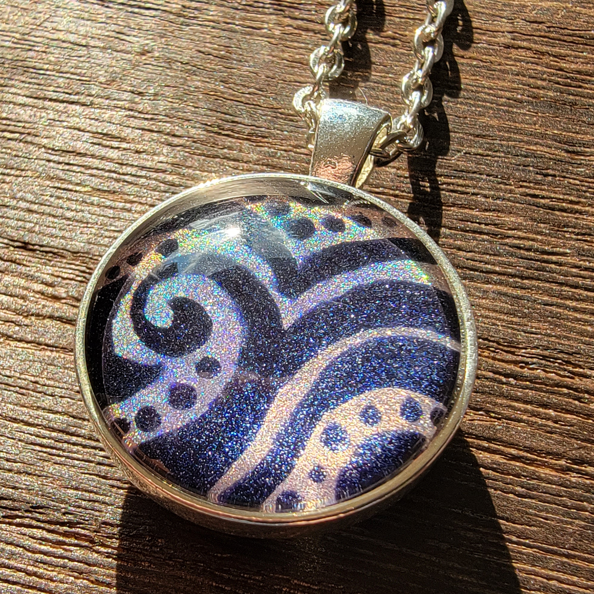 A unique necklace with two hand-painted cabochons.  Each side has navy shimmer swirls against an iridescent shimmer background that picks up the light and changes colors.  Set in a silver toned setting, and comes on a matching 24 inch chain.  Cabochon measures 25mm.