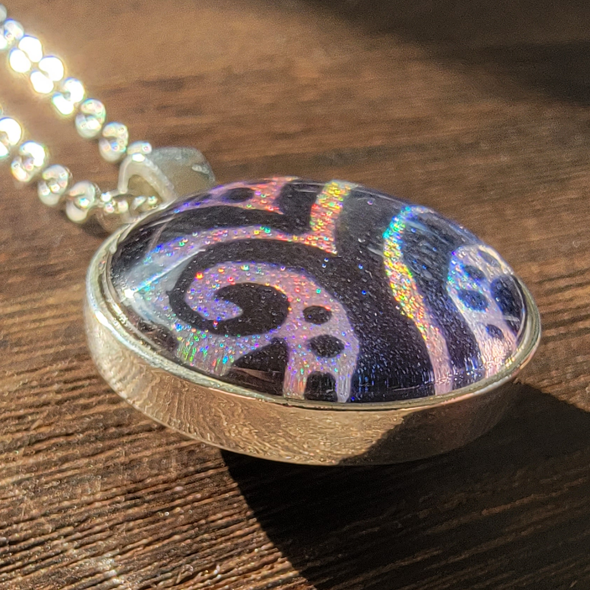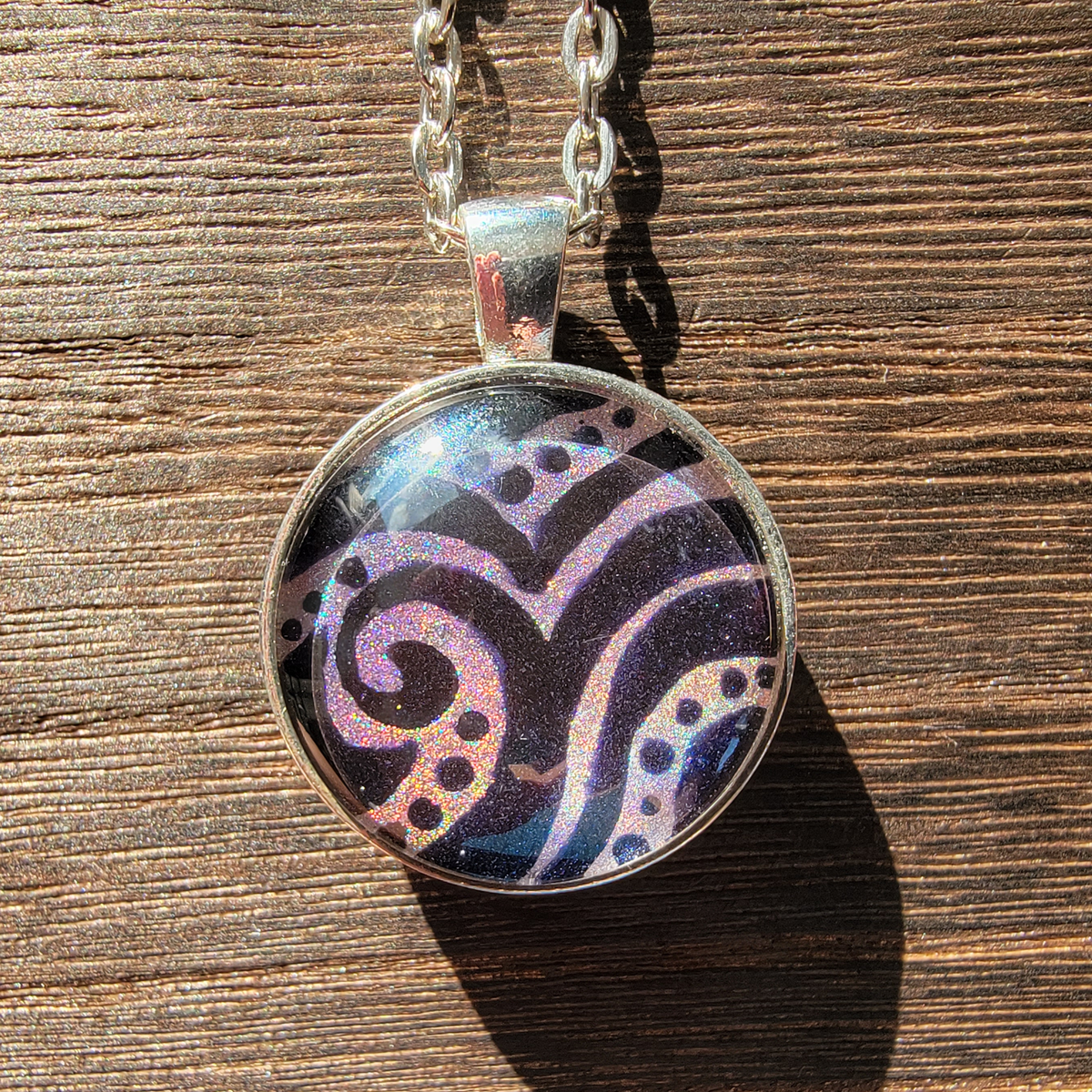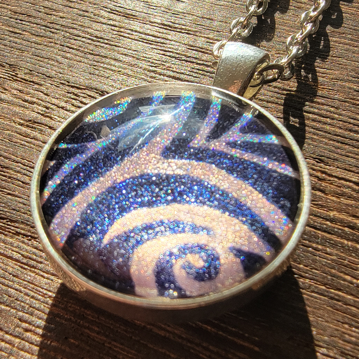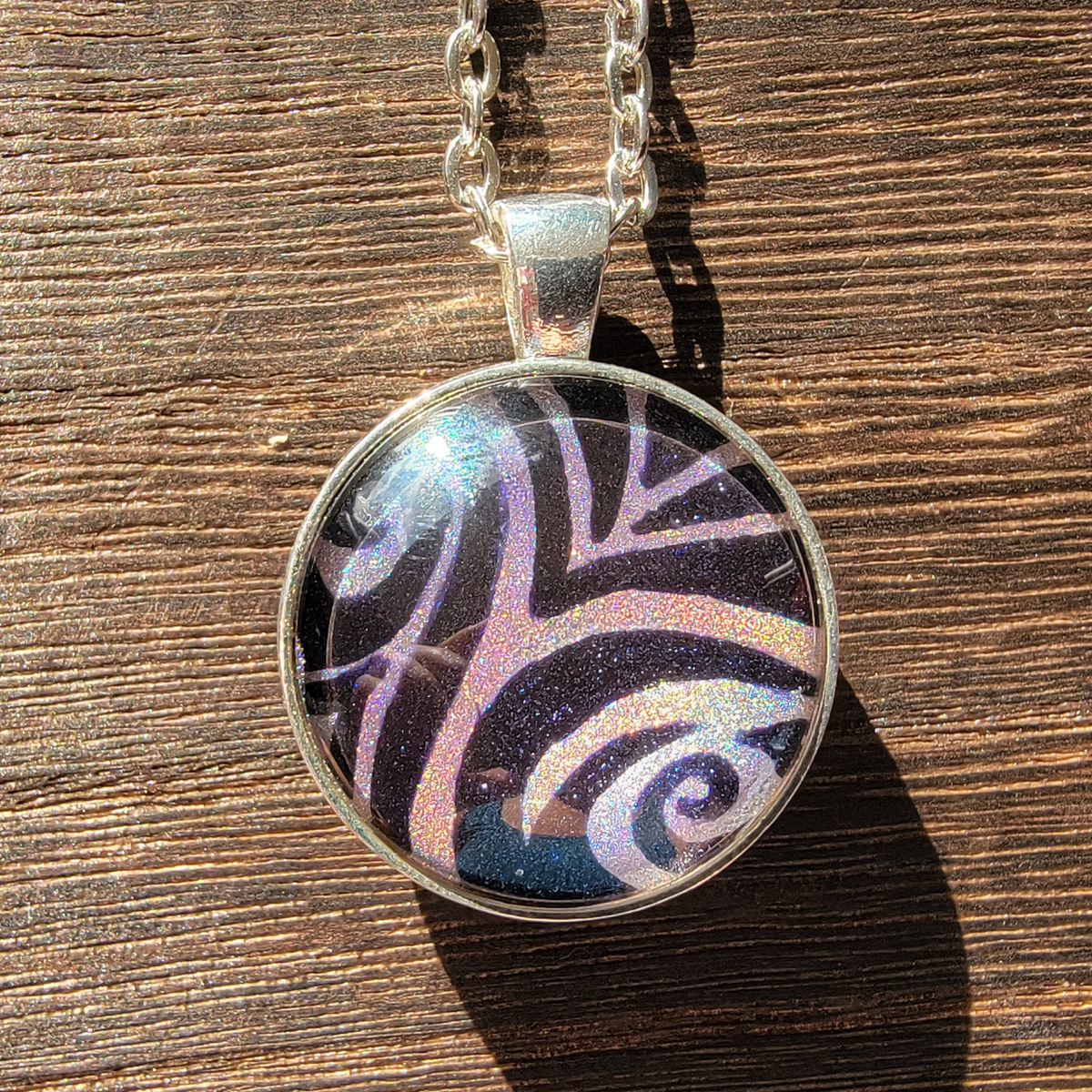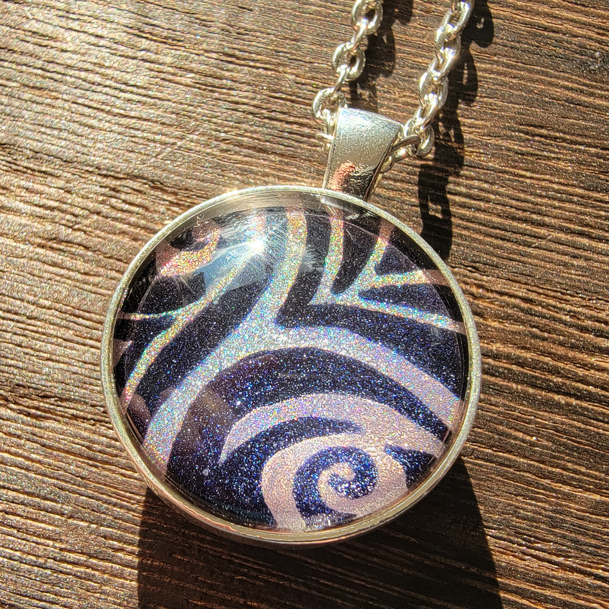 A unique necklace with two hand-painted cabochons.  Each side has navy shimmer swirls against an iridescent shimmer background that picks up the light and changes colors.  Set in a silver toned setting, and comes on a matching 24 inch chain.  Cabochon measures 25mm.