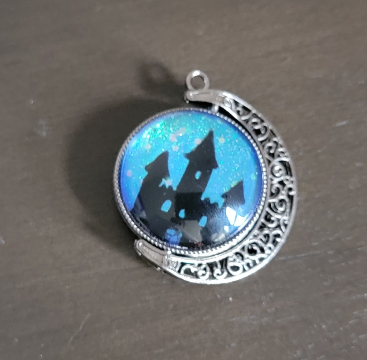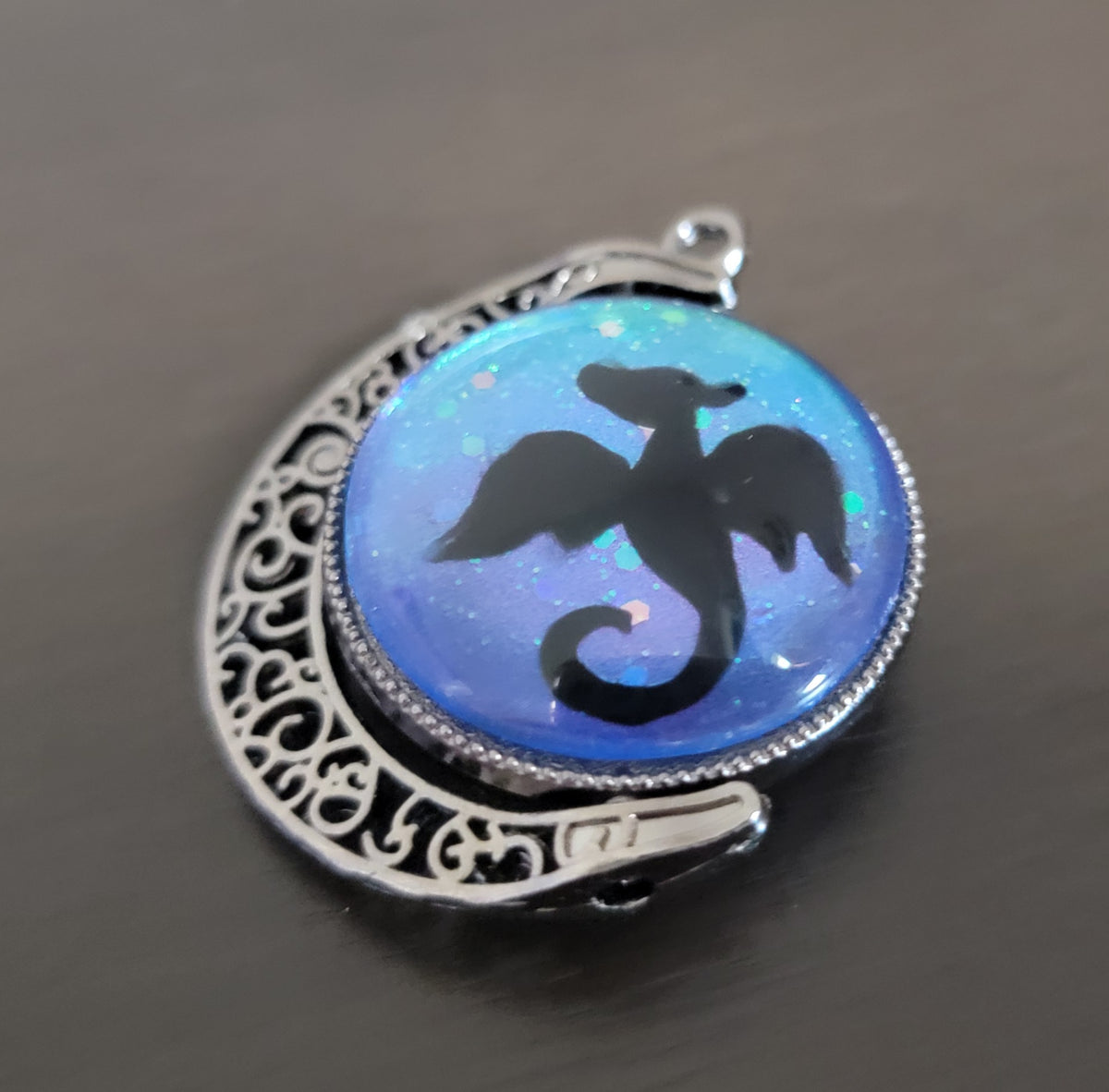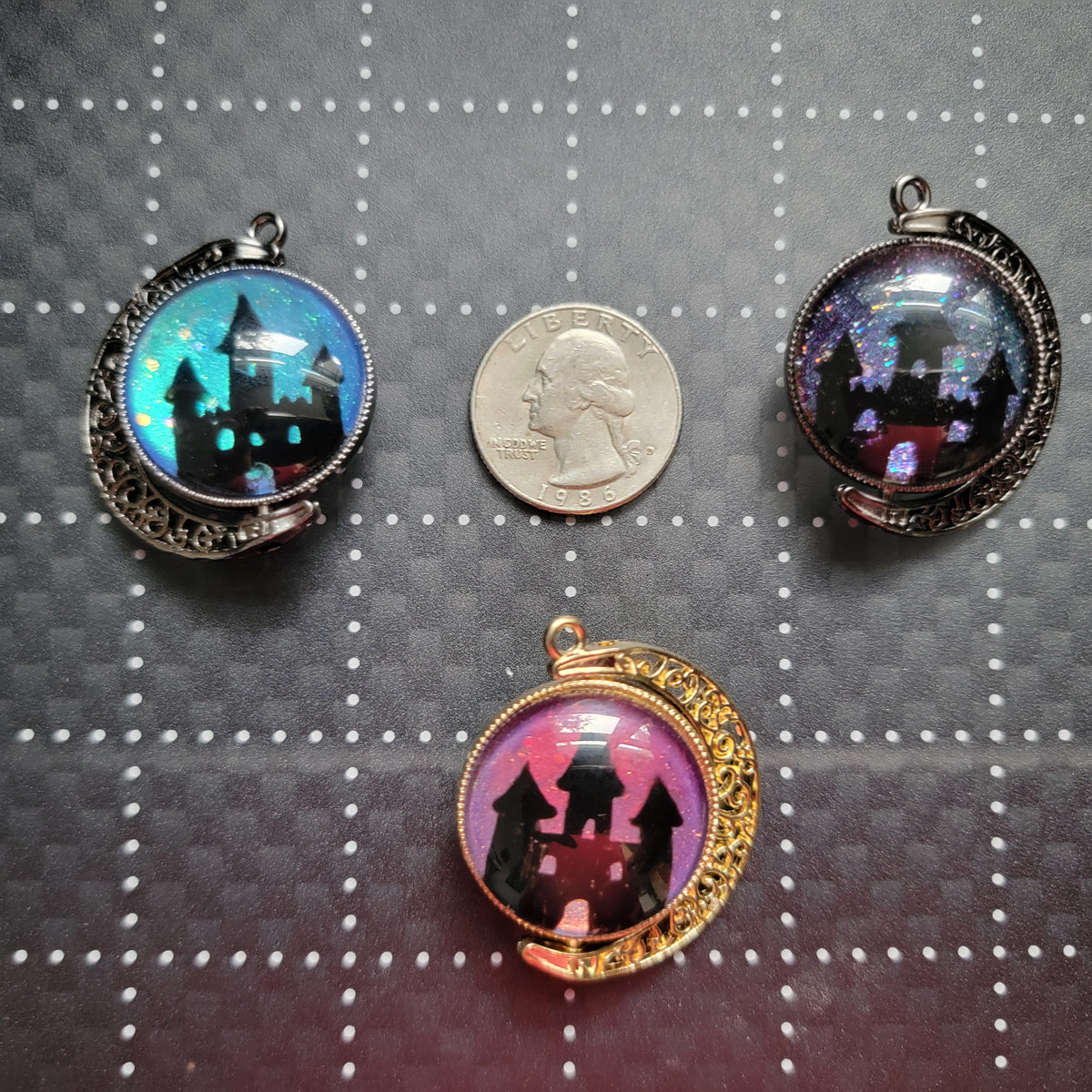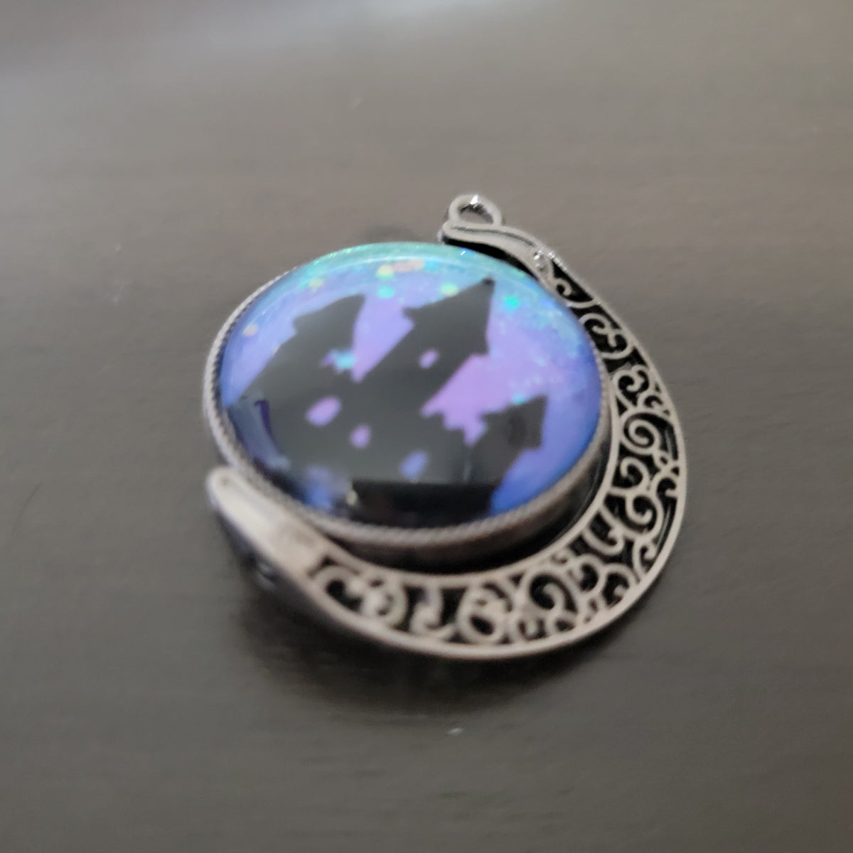 Two hand painted cabochons set in a spinning crescent moon setting. One side features a dragon and the other side features a castle. These are painted with a sparkling iridescent background that changes from a bright teal purple depending on the angle.